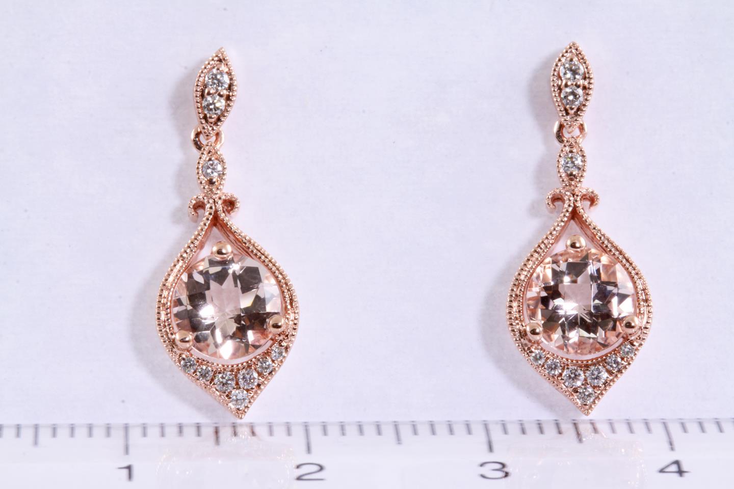 Morganite and Diamond earrings with round checkerboard cut Morganite totalling 1.57cts and Diamonds totalling 0.12cts. 14ct rose gold. (New)