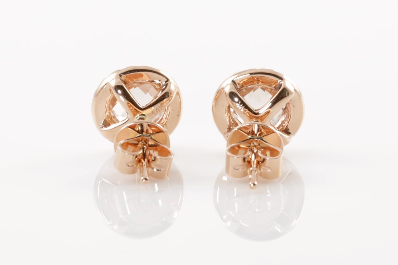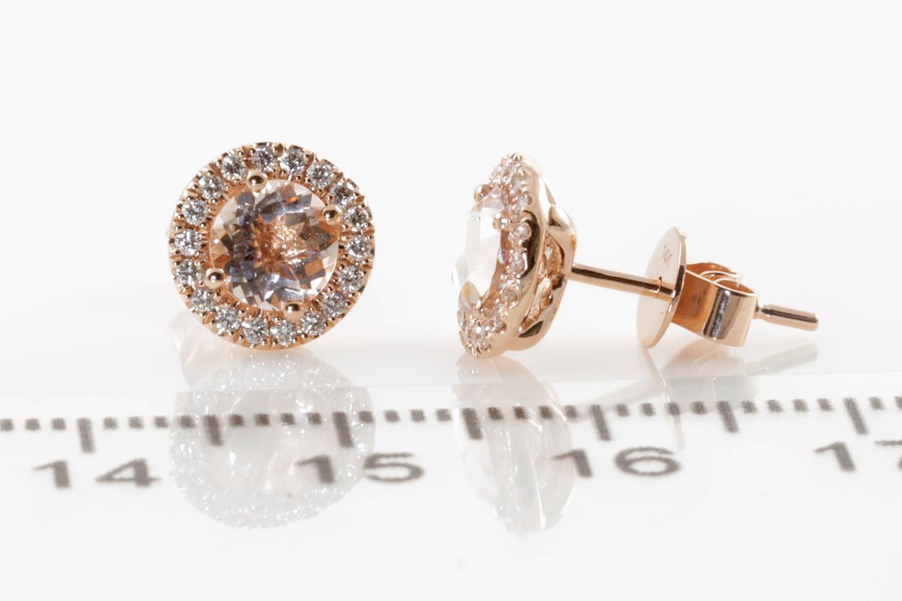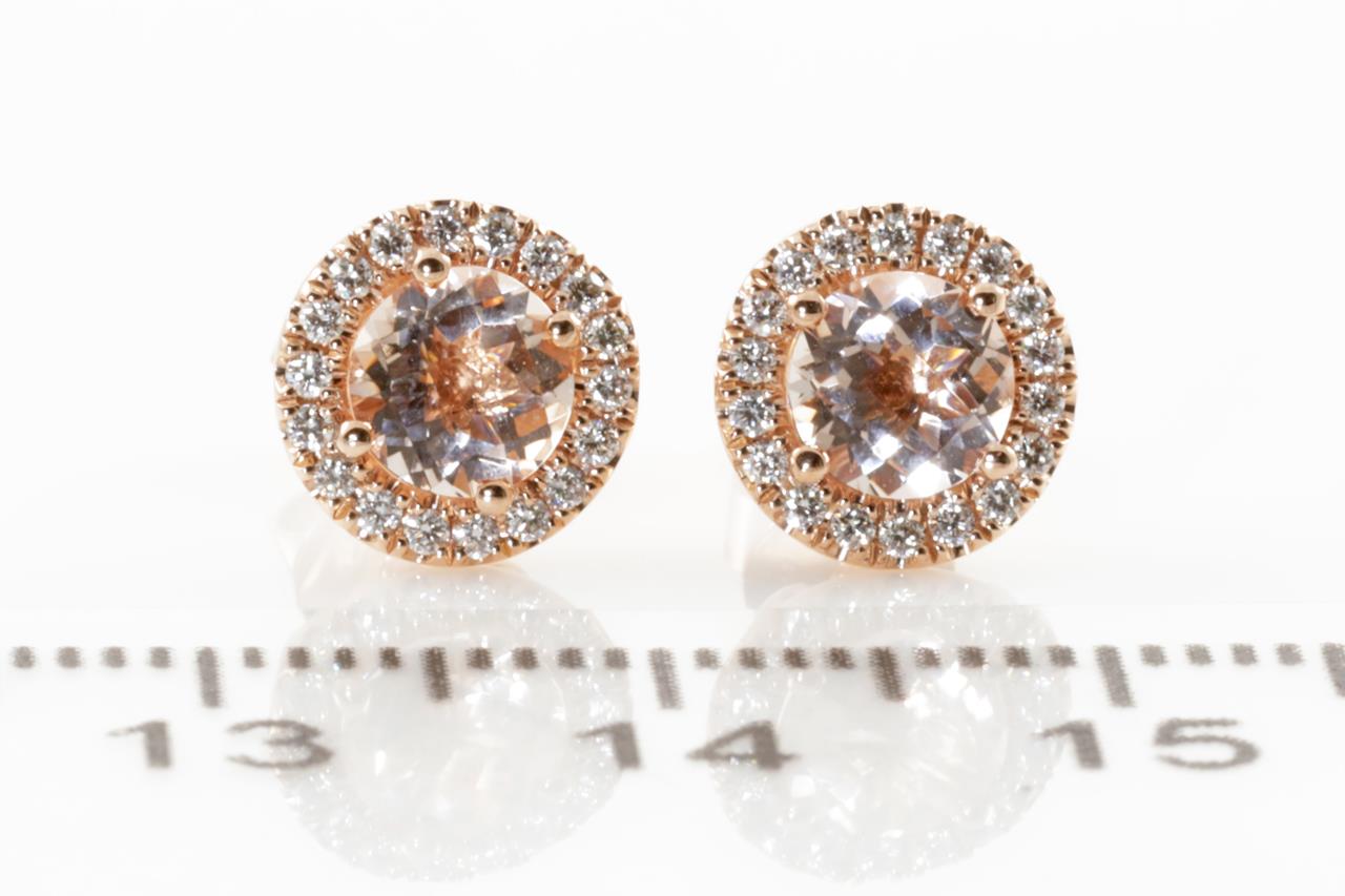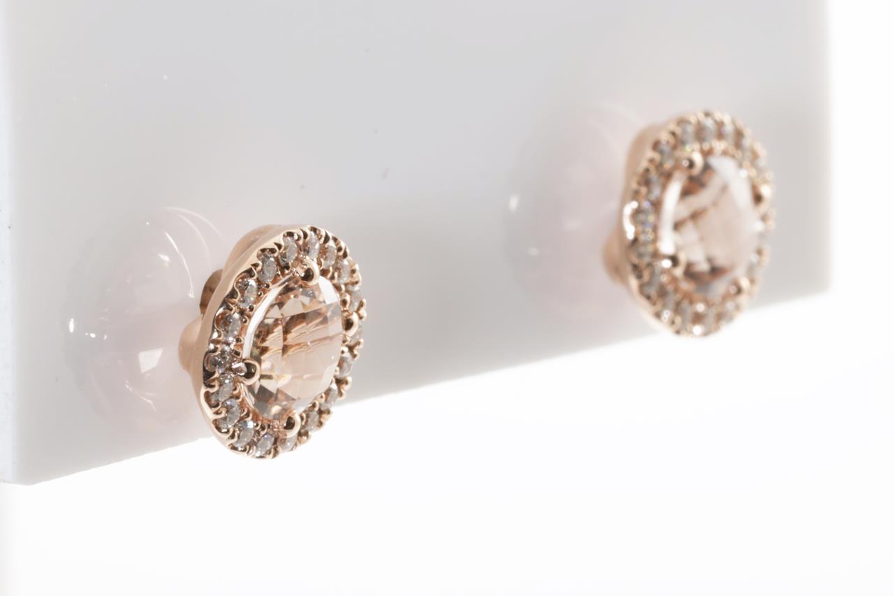 Morganite and Diamond earrings with round Morganite totalling 0.97cts and Diamonds totalling 0.17cts. 14ct rose gold. Weight: 1.8g. (New)