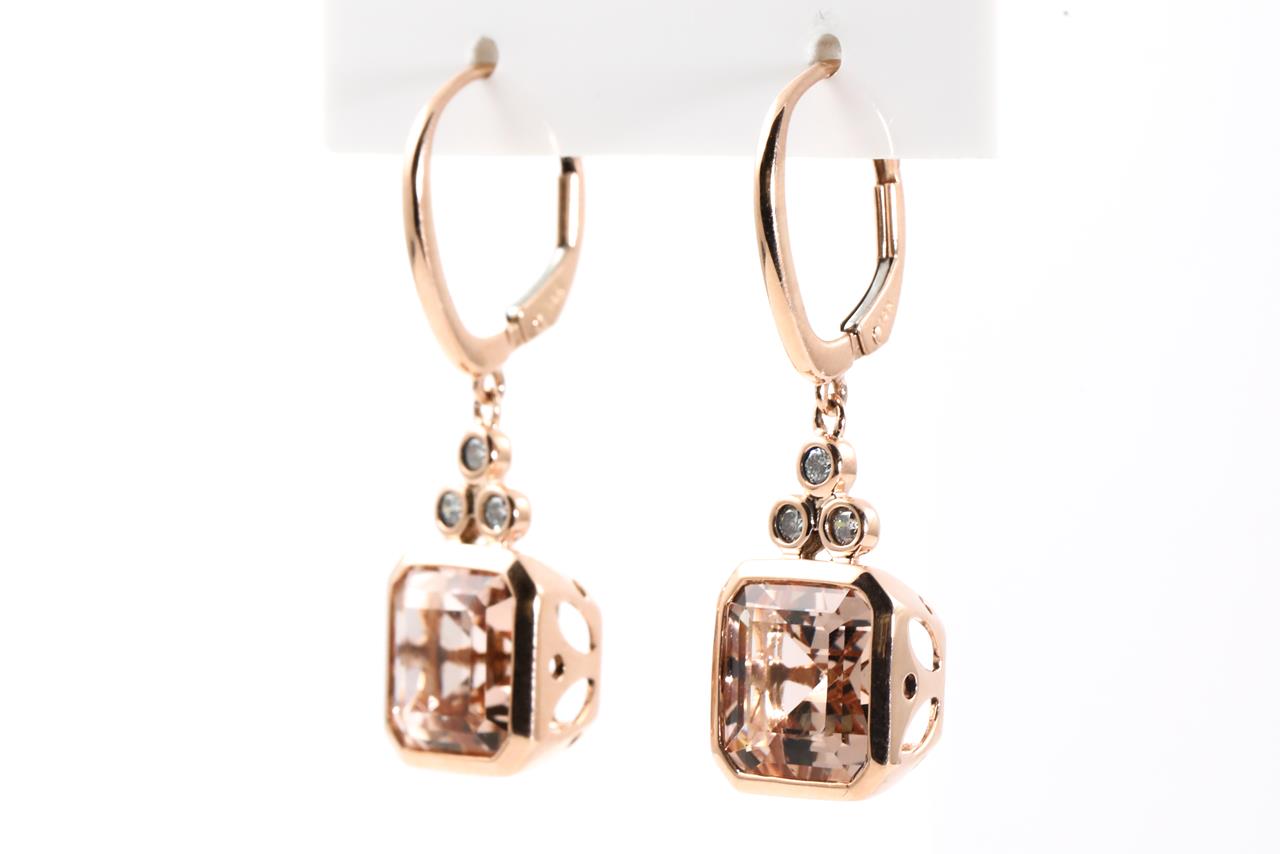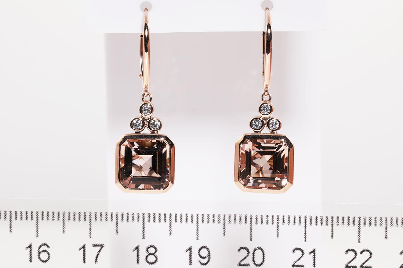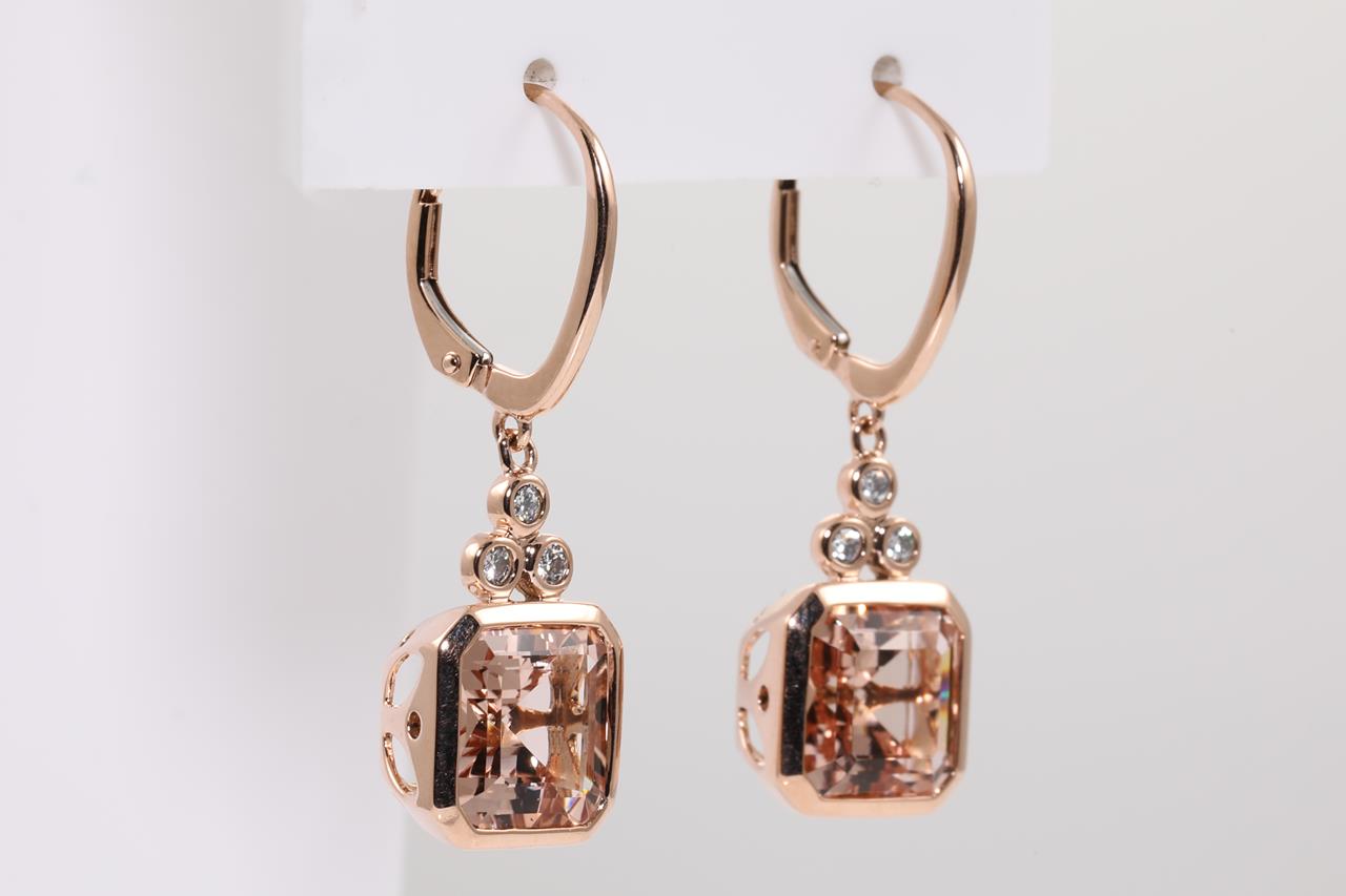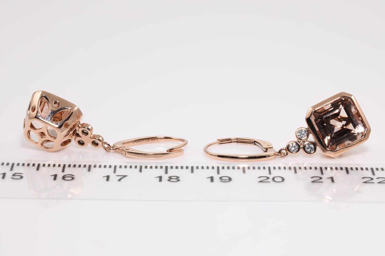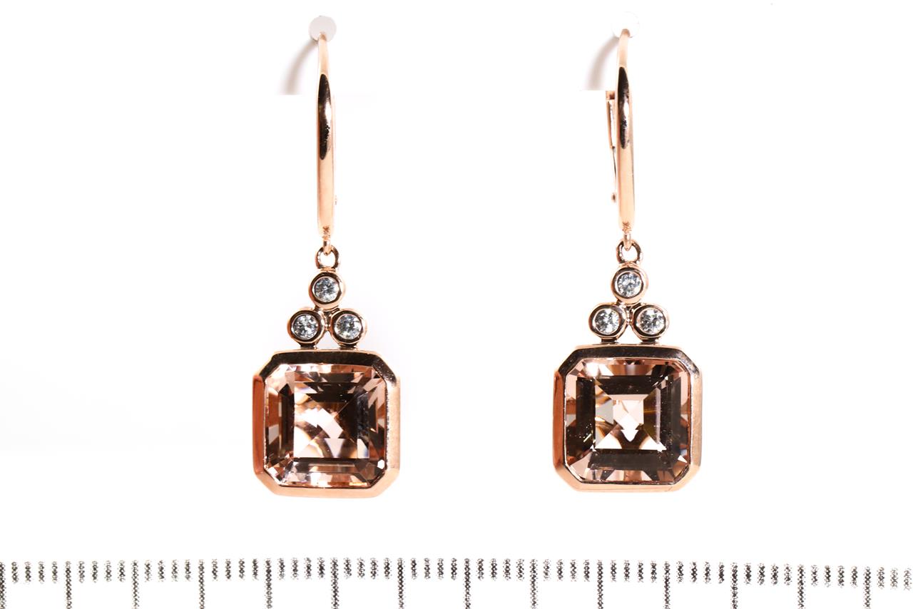 Morganite and Diamond Earrings with square emerald cut Morganites totalling 8.00cts and Diamonds totalling 0.18cts. 14ct rose gold. Weight: 6.4g. (As new)
