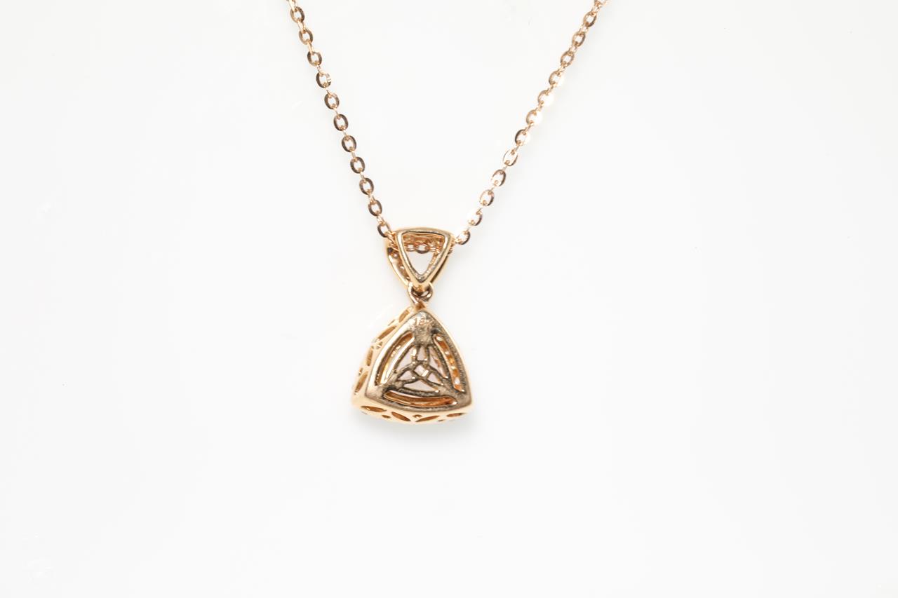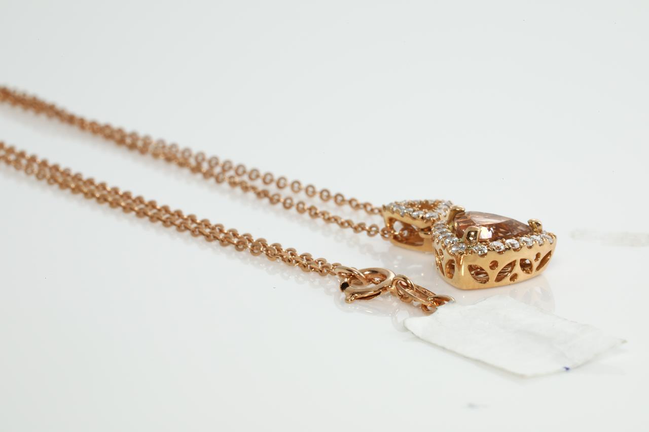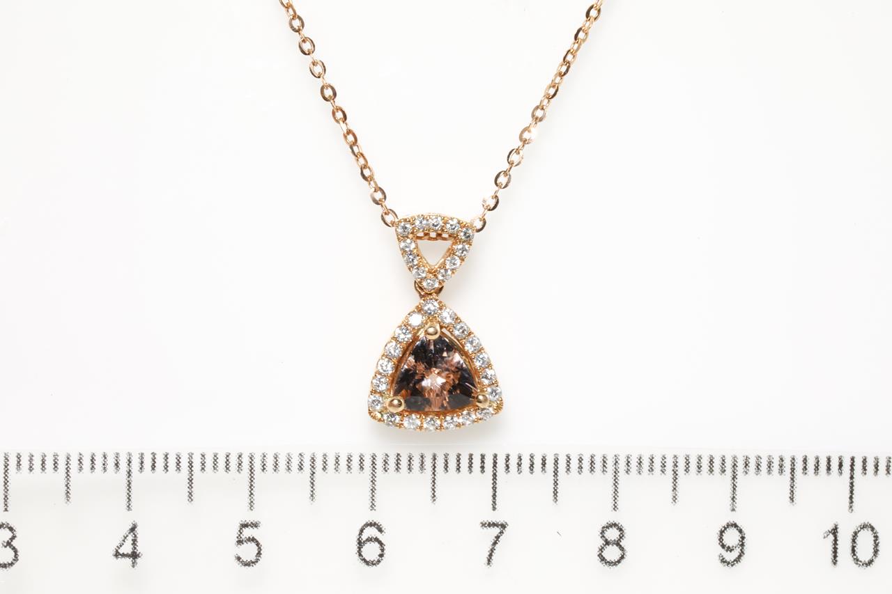 Morganite and Diamond pendant with trilliant cut Morganite of 0.99ct and Diamonds totalling 0.29cts. 18ct rose gold including 44cm 18ct rose gold chain. Weight 3.3g (New)