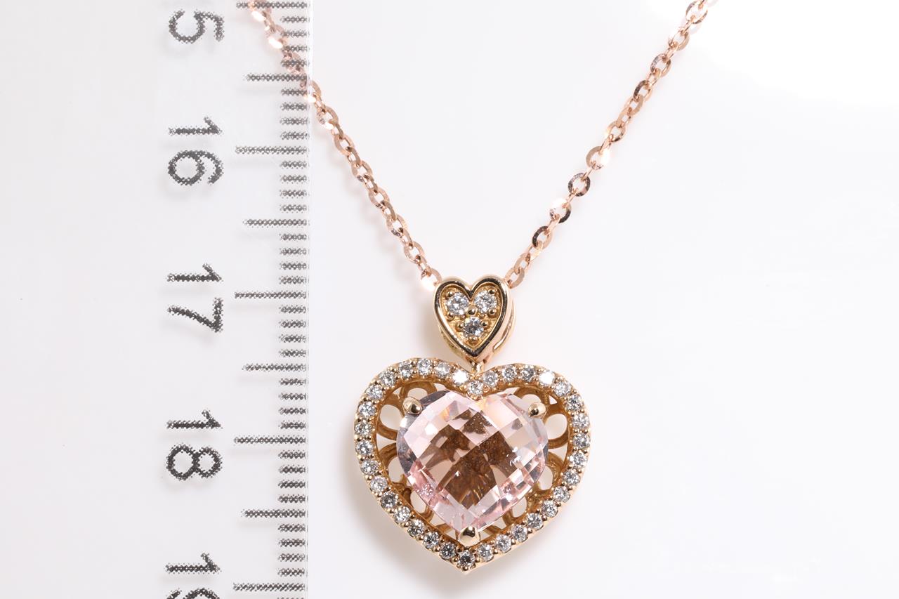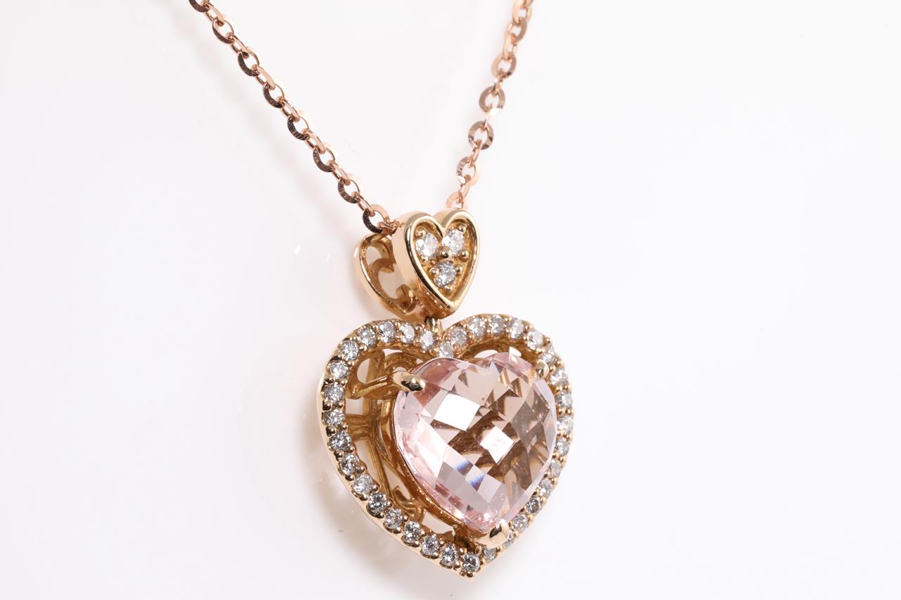 Morganite and Diamond pendant with a heart checkerboard cut Morganite of 3.33ct and Diamonds totalling 0.29cts. 18ct rose gold with 44cm chain. Weight: 5.2g (Pre-owned)