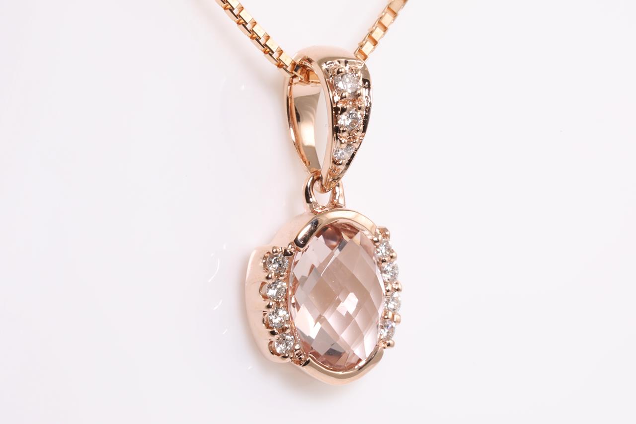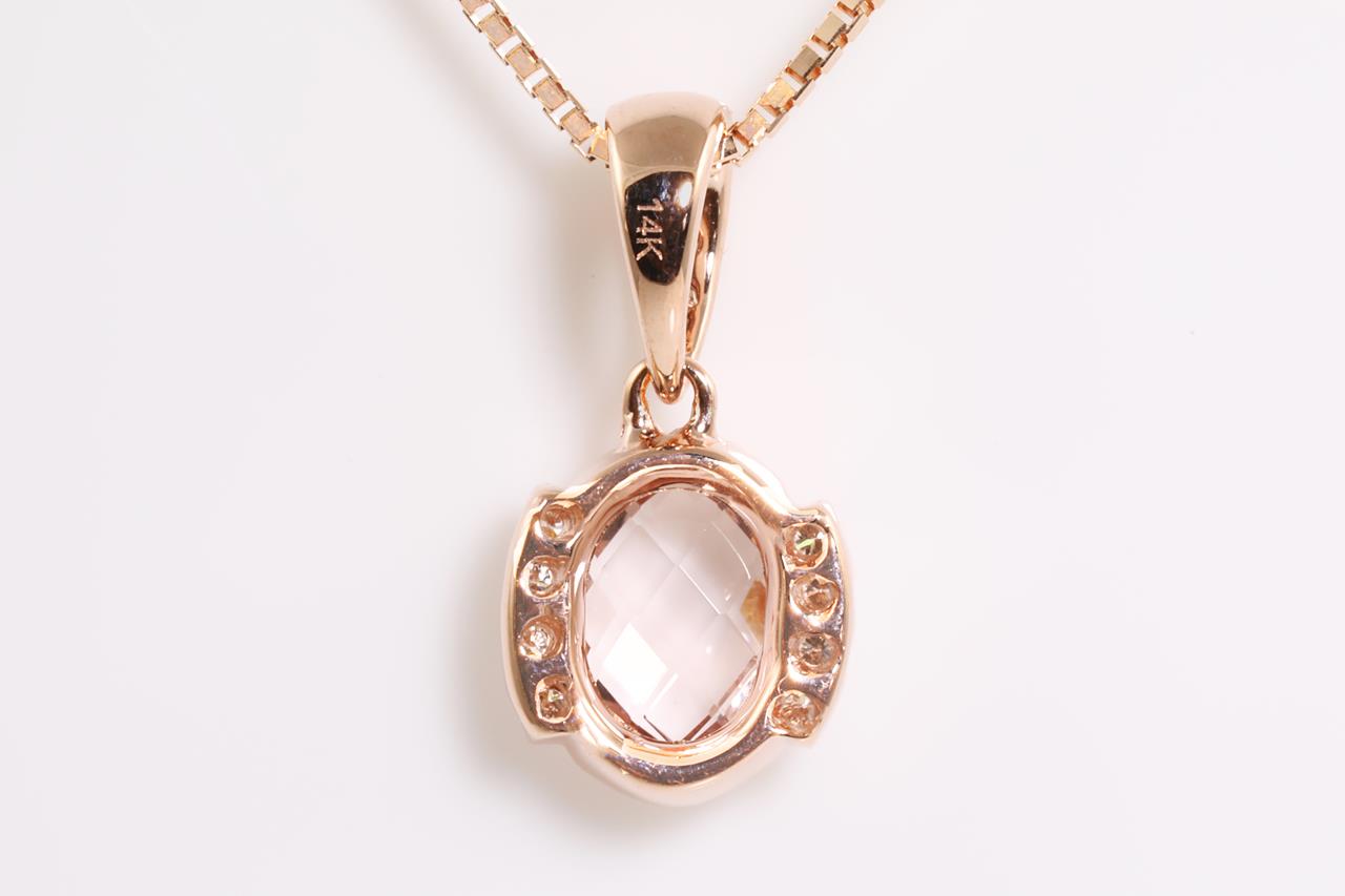 Morganite and Diamond pendant with an oval Morganite of 0.68ct and Diamonds totalling 0.08cts. 14ct rose gold with 18ct gold 44cm adjustable chain. Weight: 2.9g. (New)