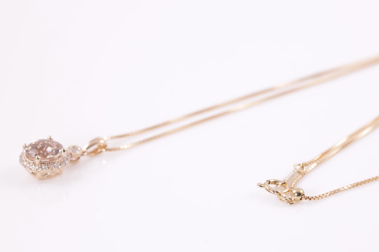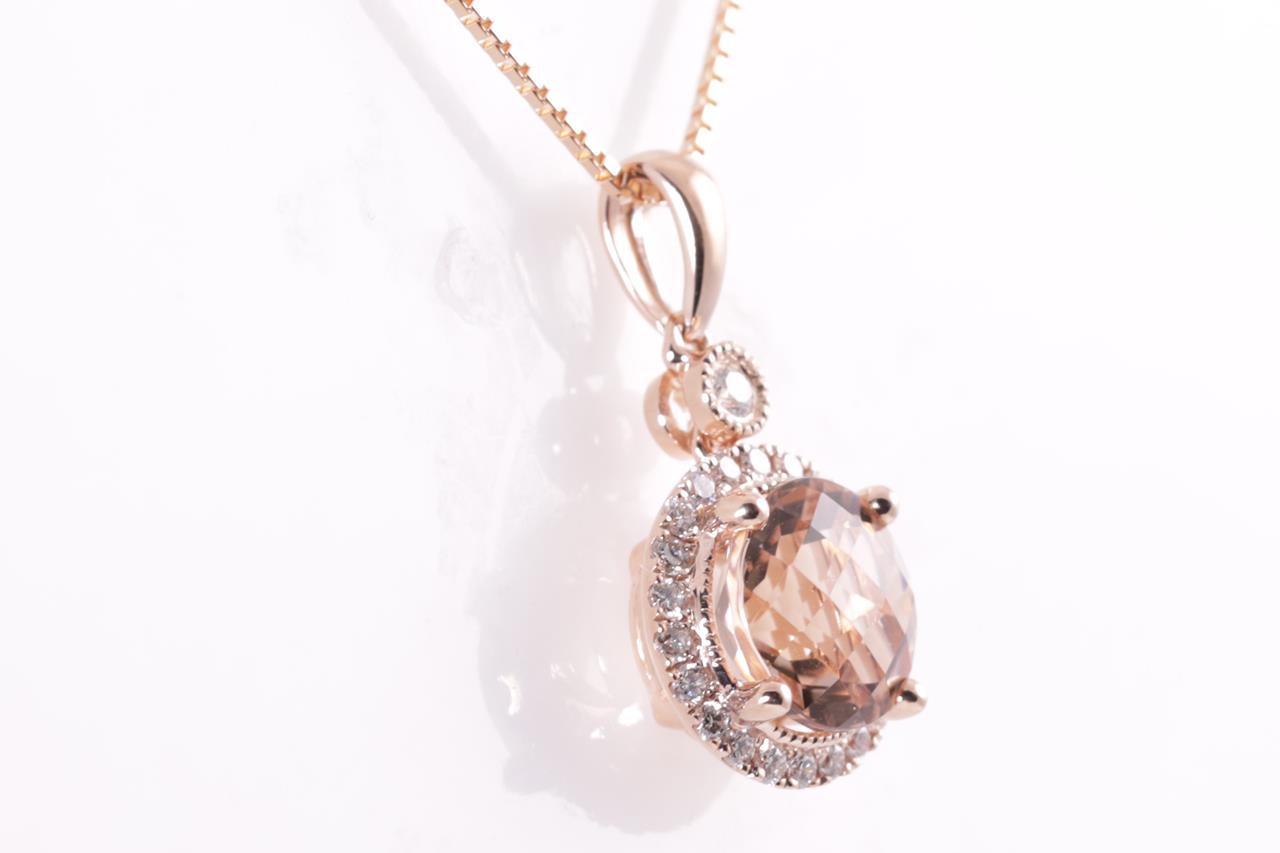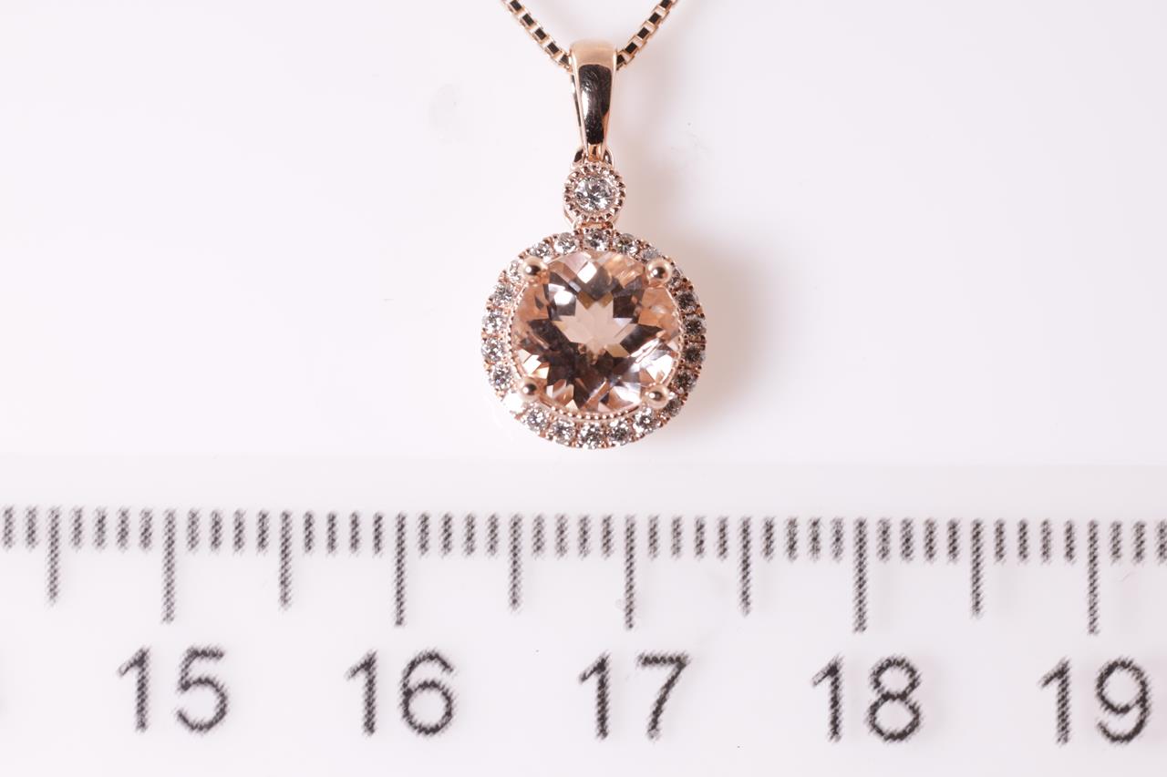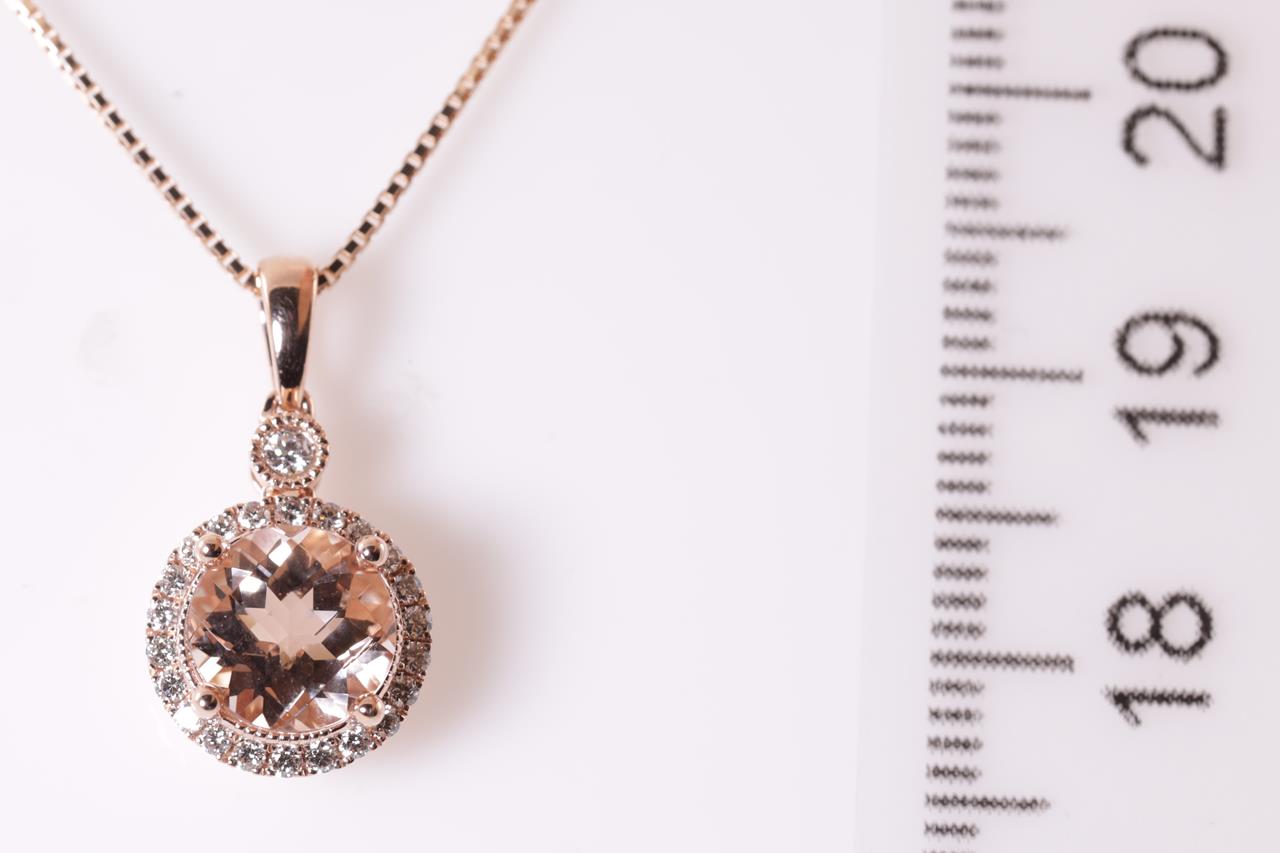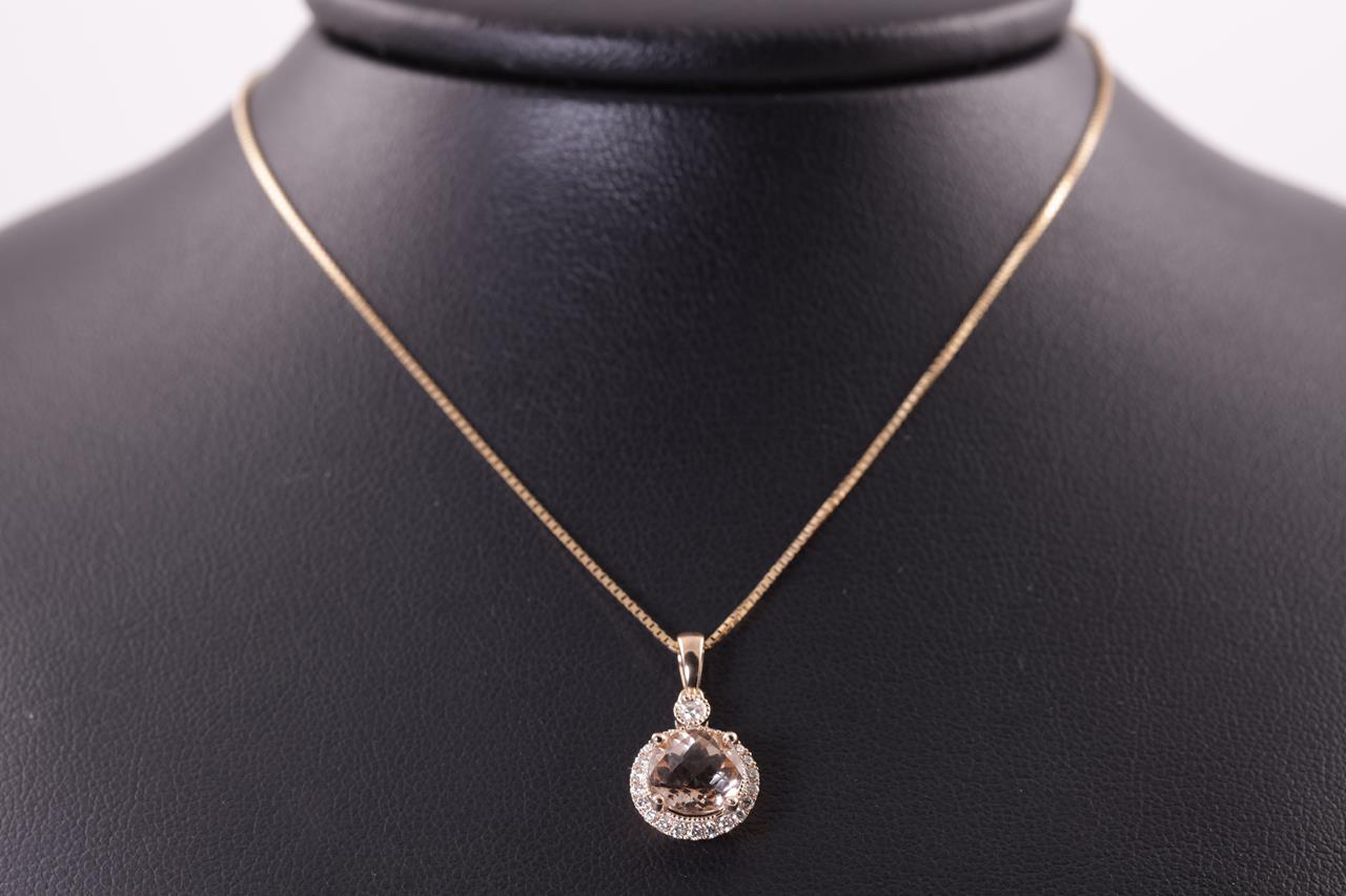 Morganite and Diamond pendant with a round checkerboard cut Morganite of 1.34ct and Diamonds totalling 0.15cts. 14ct rose gold with 18ct gold 44cm adjustable chain. Weight: 3.2g. (New)