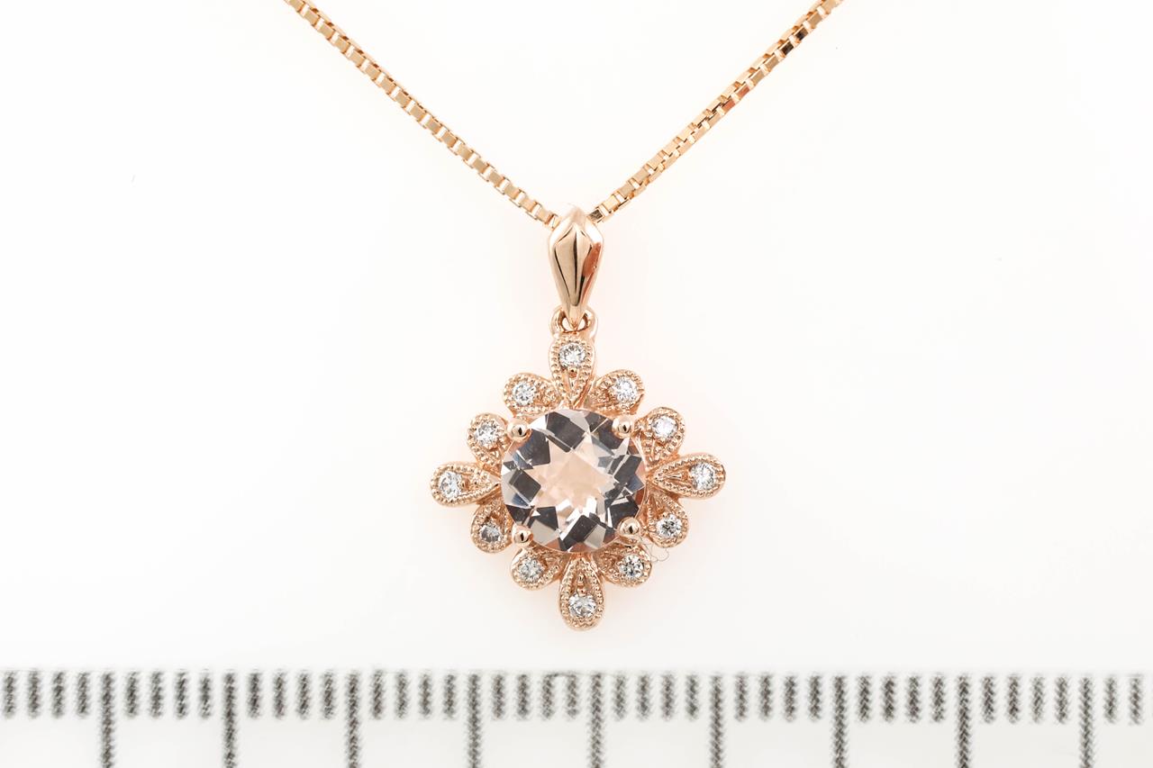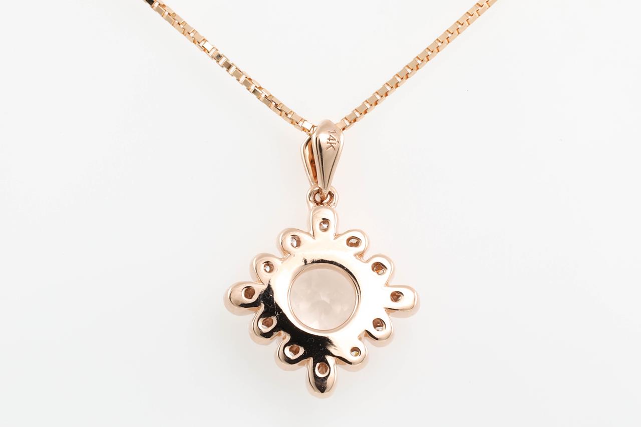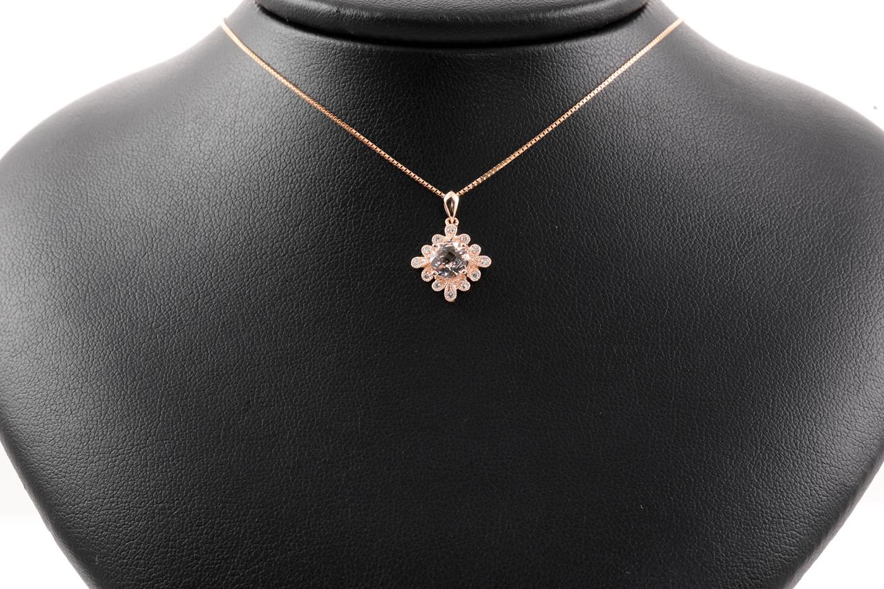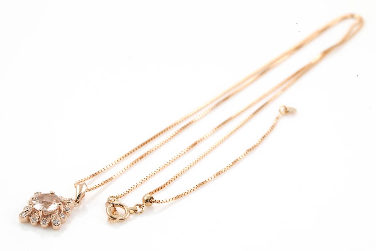 Morganite and Diamond pendant with a round Morganite of 0.60ct and Diamonds totalling 0.08cts. 14ct rose gold with 18ct gold 44cm adjustable chain. Weight: 3.5g. (New)
