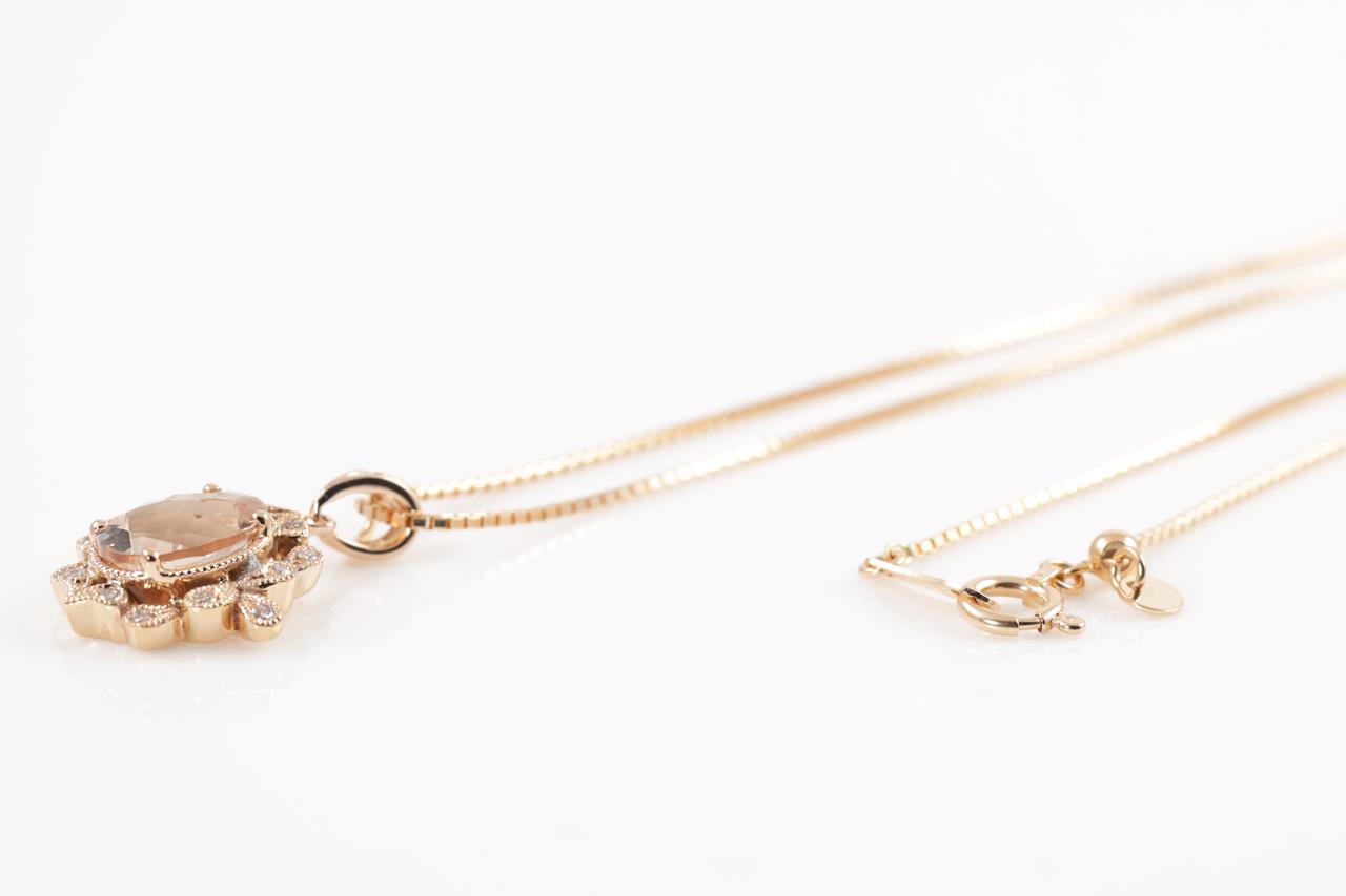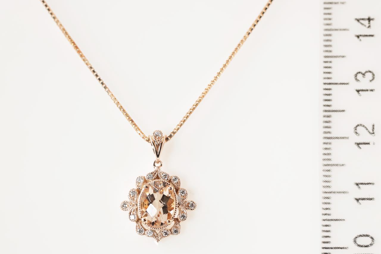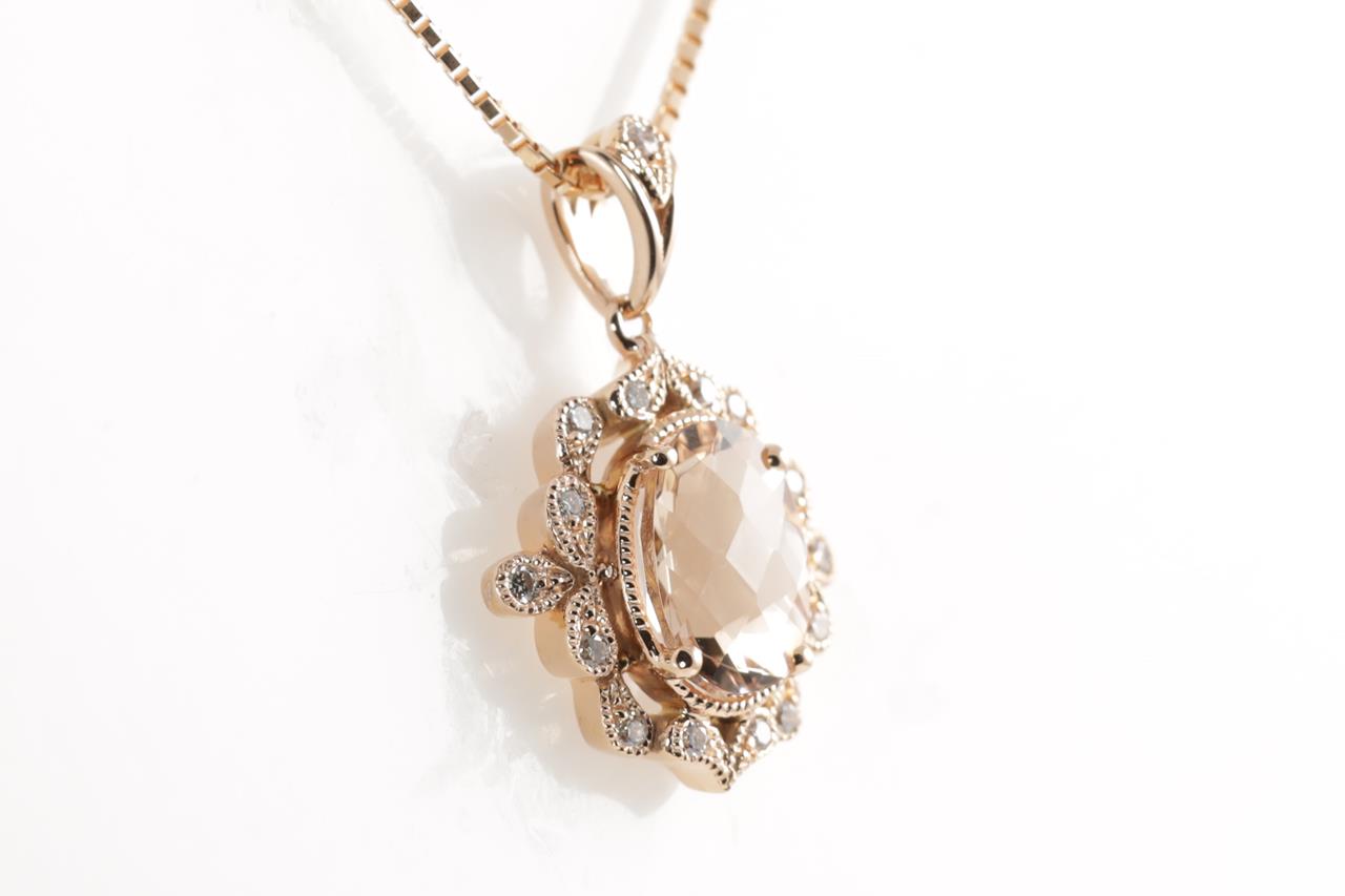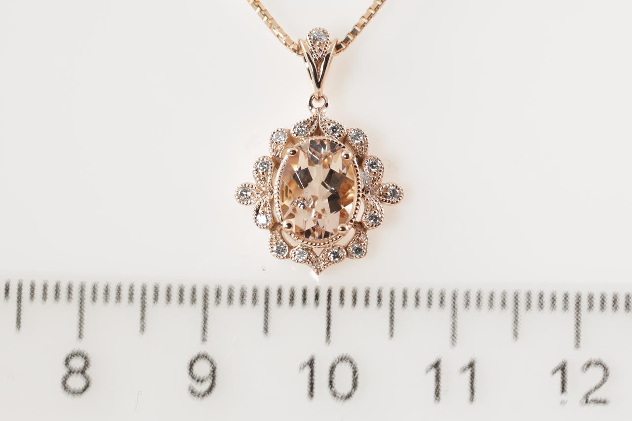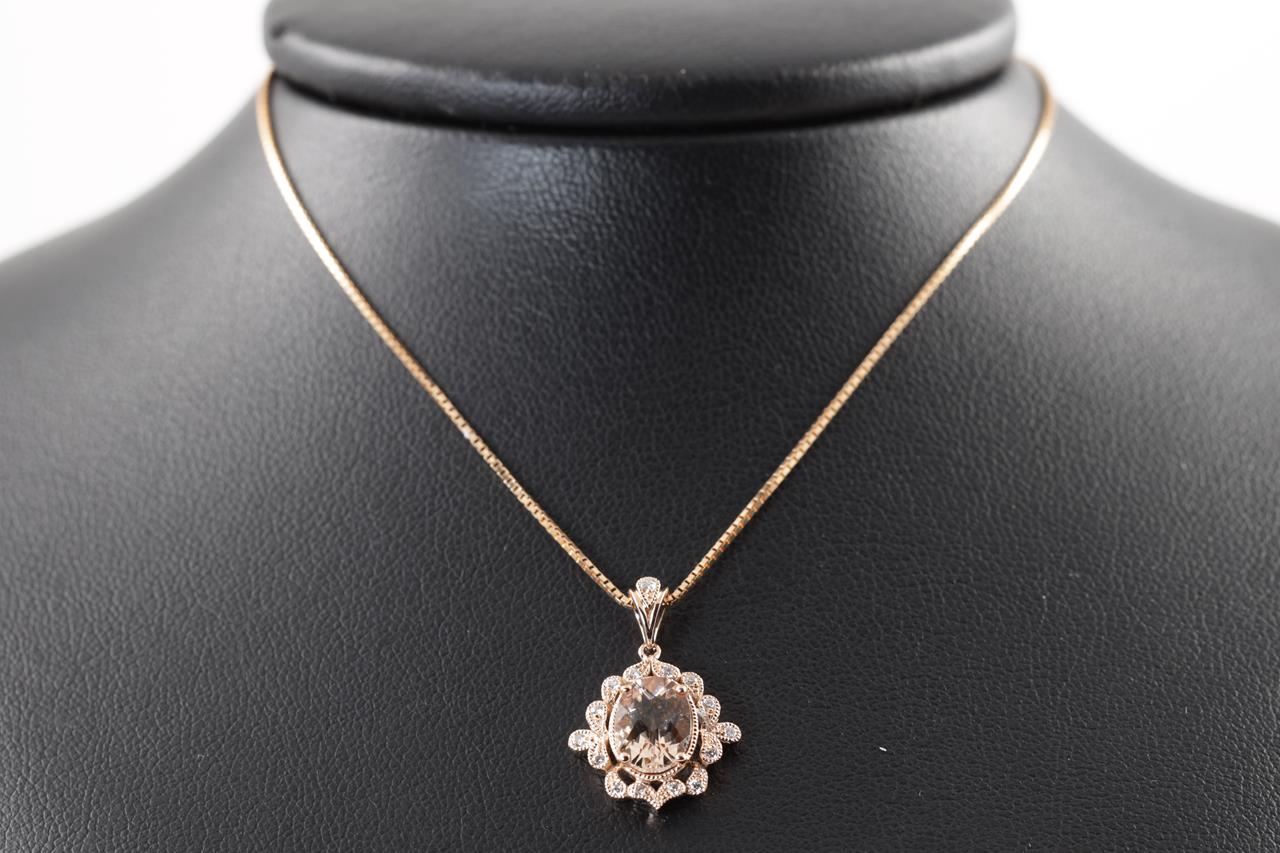 Morganite and Diamond pendant with an oval Morganite of 1.15ct and Diamonds totalling 0.10cts. 14ct rose gold with 18ct gold 44cm adjustable chain. Weight: 4.0g. (New)