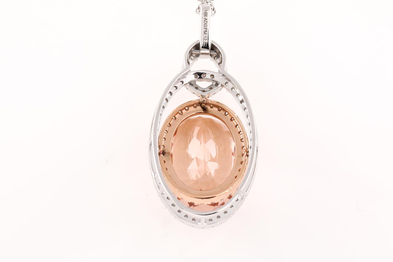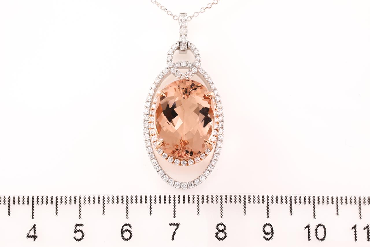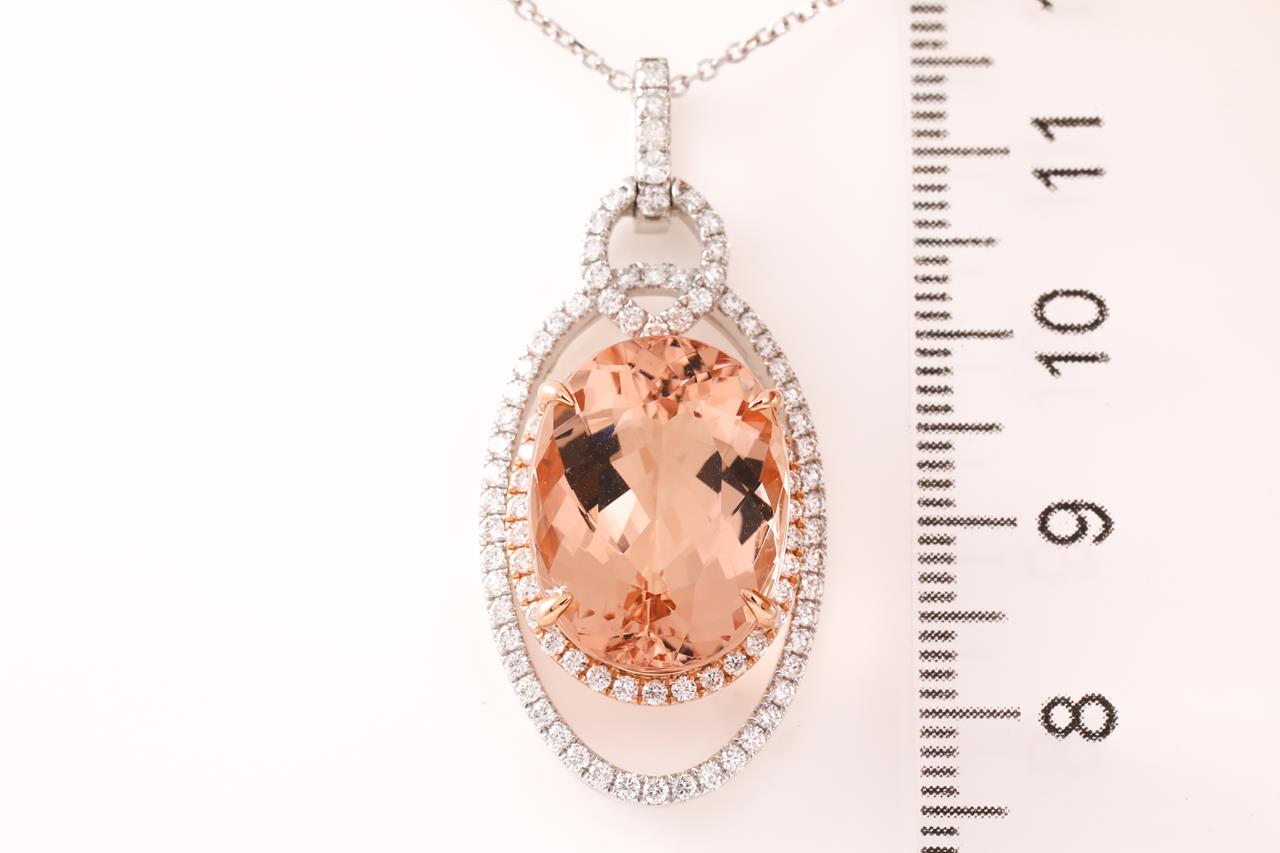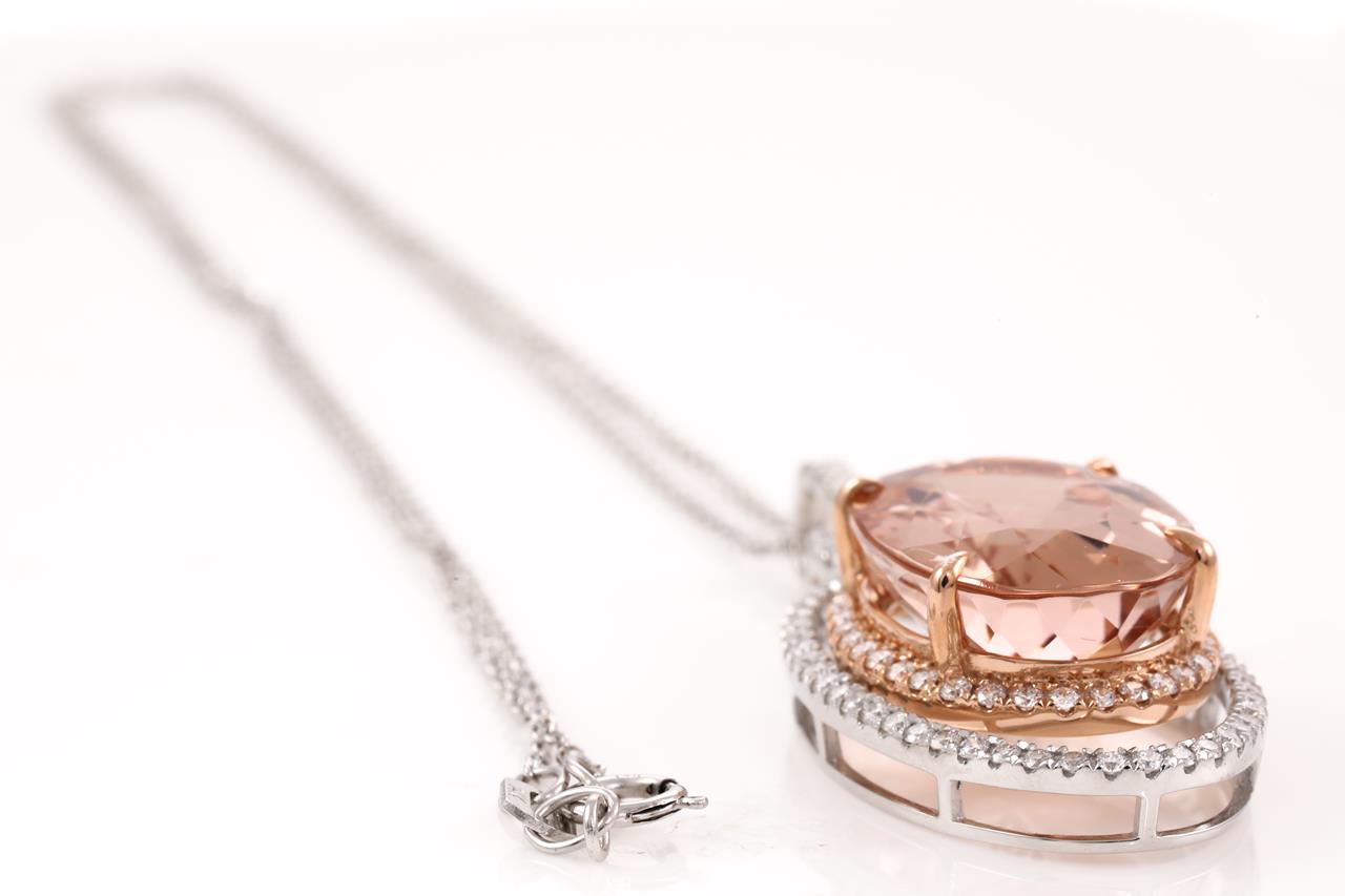 Morganite and Diamond pendant with oval shape Morganite of 12.02ct and Diamonds totalling 0.88cts (Estimated grading: G-H SI). 14ct White and Rose gold with attached chain. Length: 44.5cm. Weigh: 8.5g. (As new)