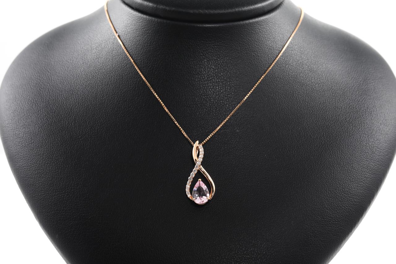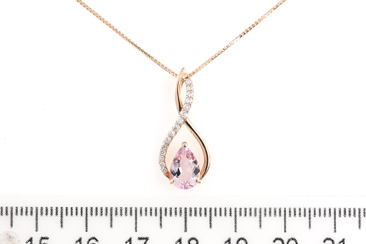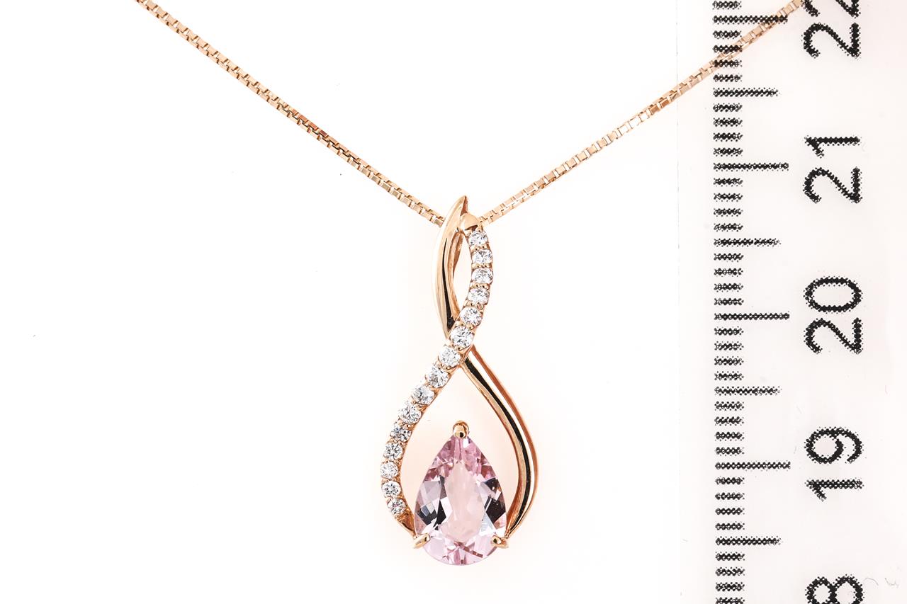 Morganite and Diamond pendant with a pear shape Morganite of 1.07ct and Diamonds totalling 0.16cts. 18ct rose gold with adjustable 45cm chain. Weight: 3.7g (Pre-owned)