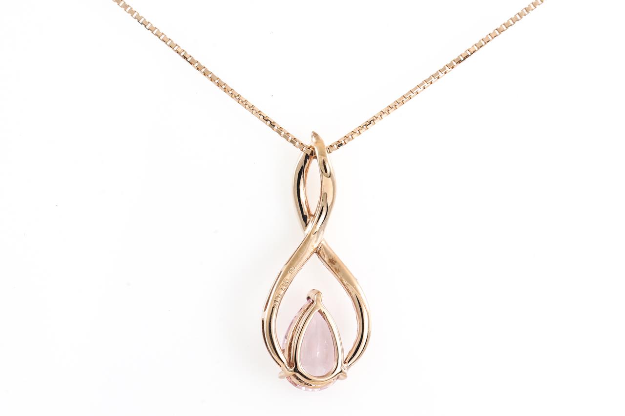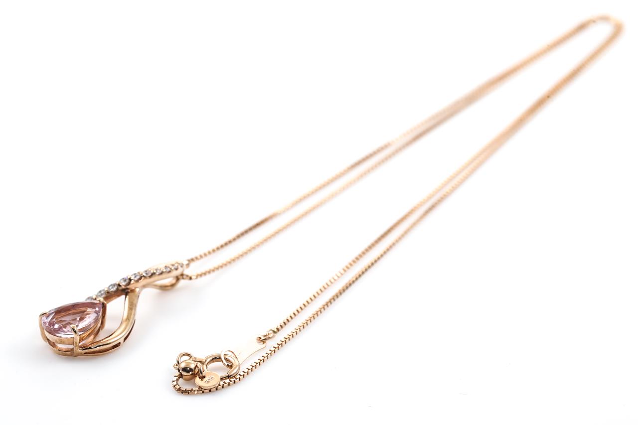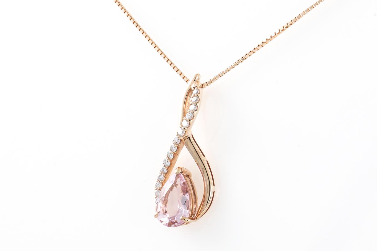 Morganite and Diamond pendant with a pear shape Morganite of 1.07ct and Diamonds totalling 0.16cts. 18ct rose gold with adjustable 45cm chain. Weight: 3.7g (Pre-owned)