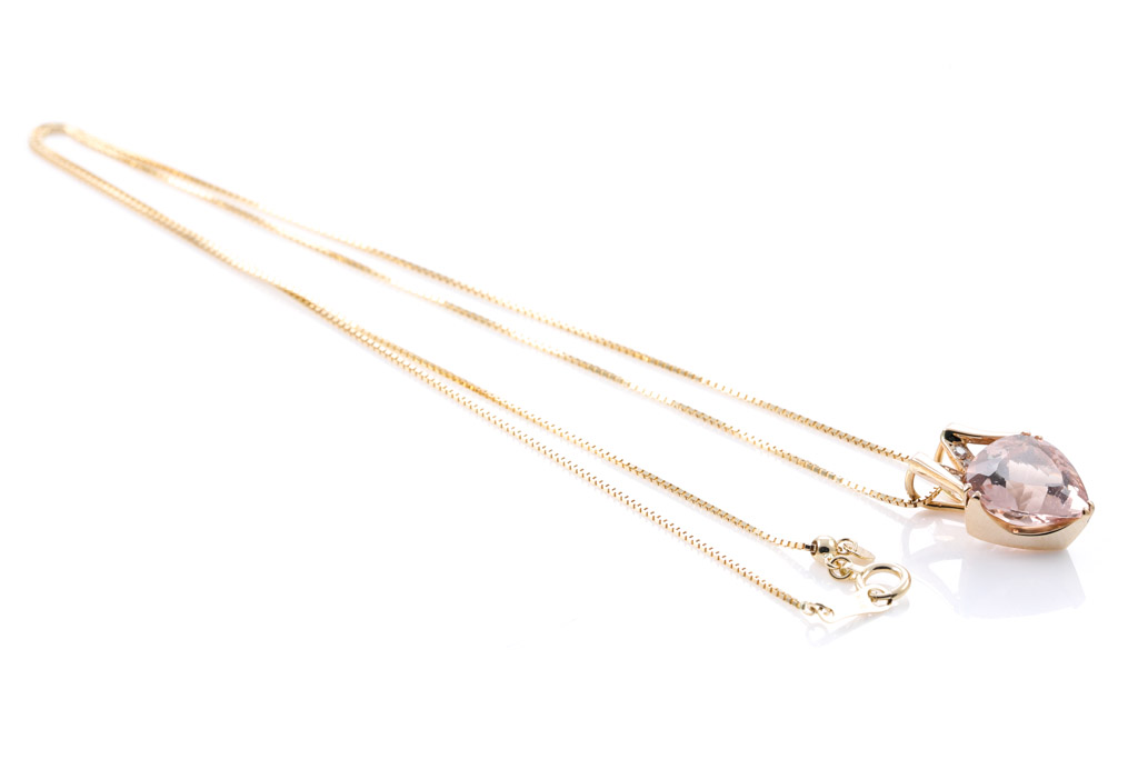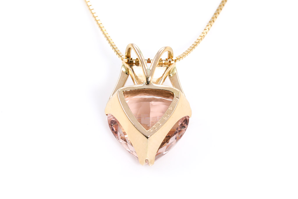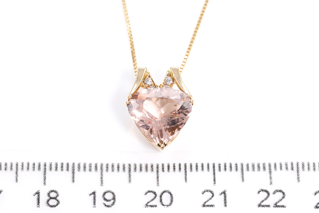 Morganite and Diamond pendant with triliant cut Morganite of 4.14ct and round Diamonds totalling 0.06cts. 18ct yellow gold with 44cm 18ct yellow gold adjustable chain. Weight: 4.8g. (Pre-owned)