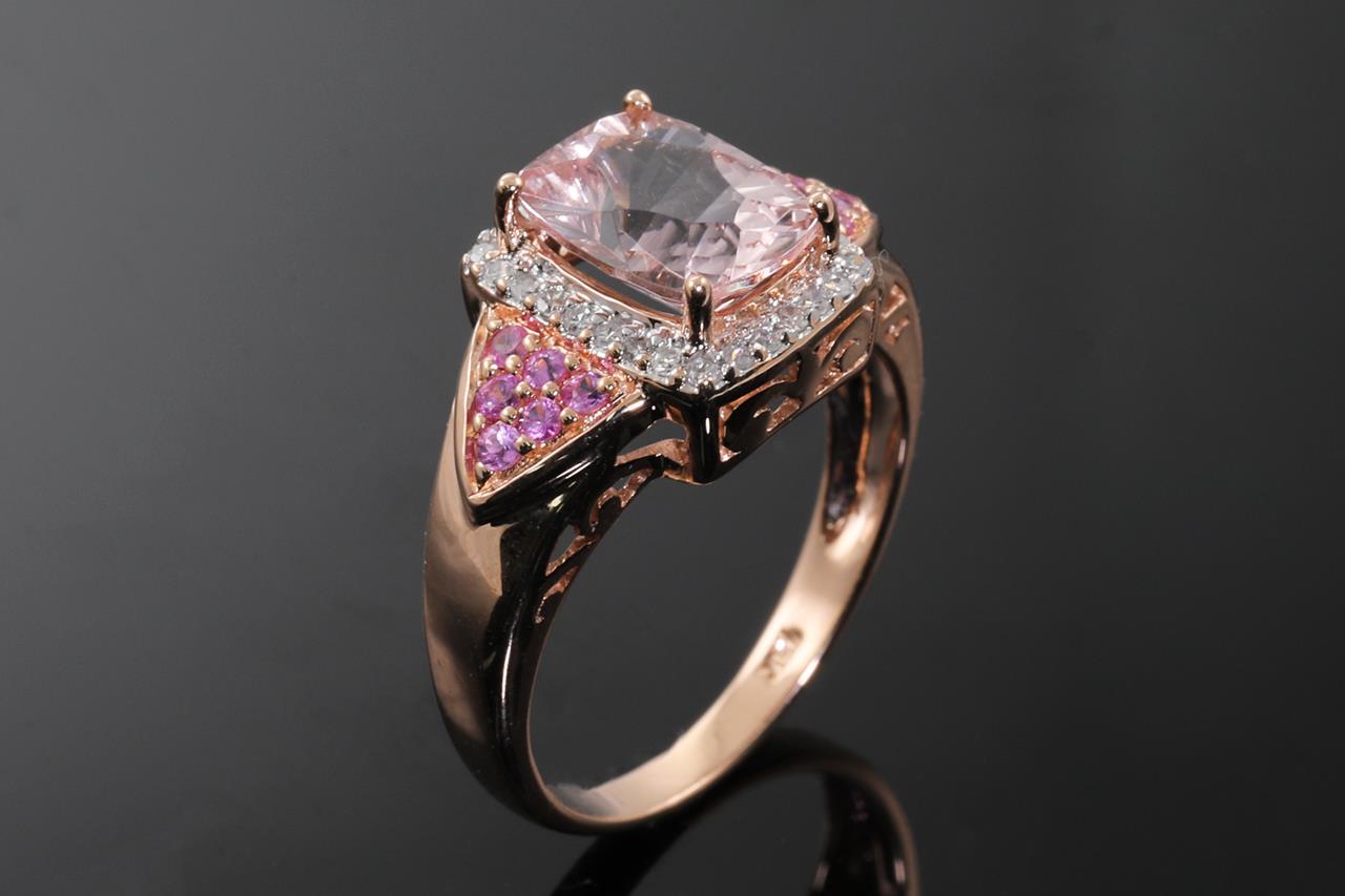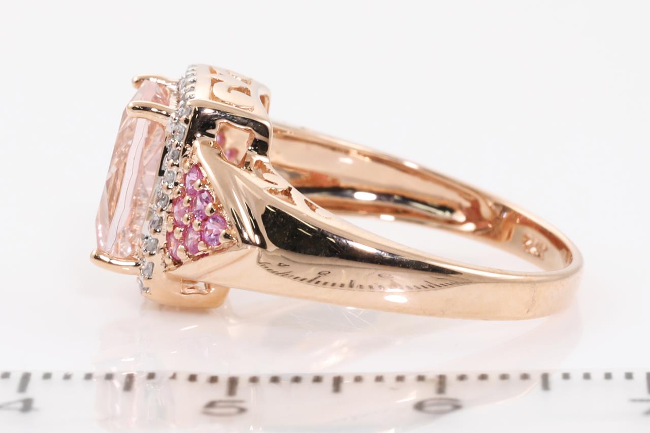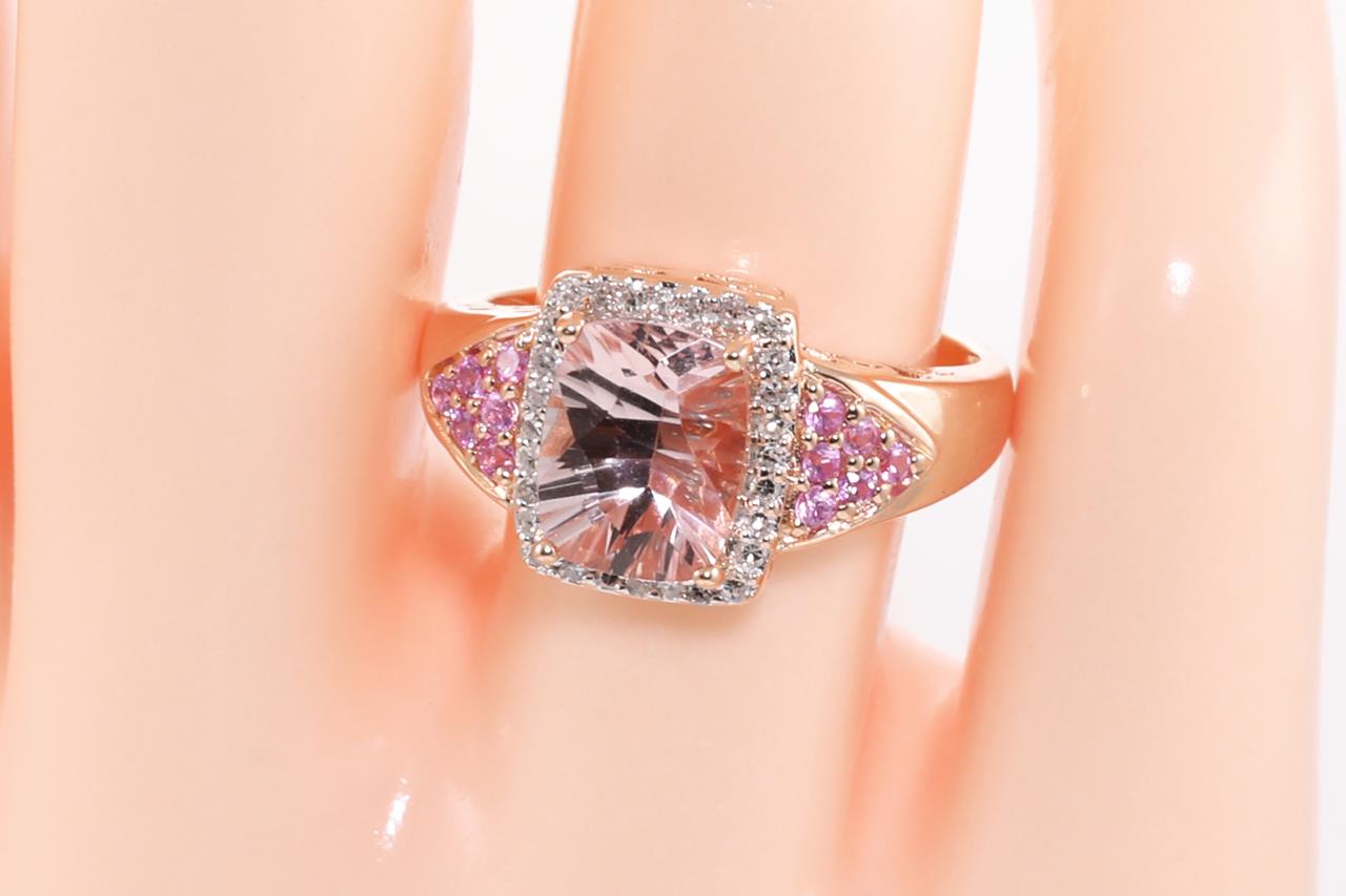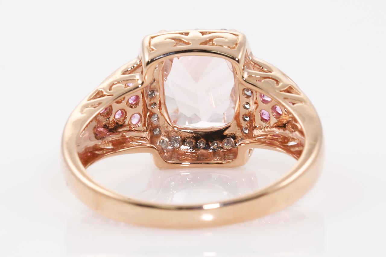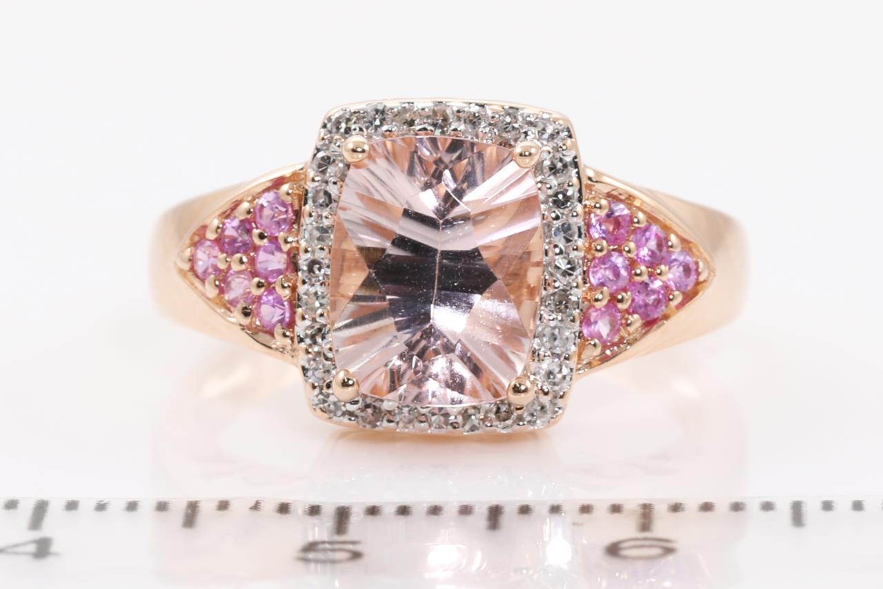 Morganite, Sapphire and Diamond Ring with centre cushion shape Morganite of 1.80ct and surrounding round Diamonds of 0.28cts and round Sapphires of 0.24cts. 14ct rose gold. Size: N. Weight: 3.8g. (As new)
