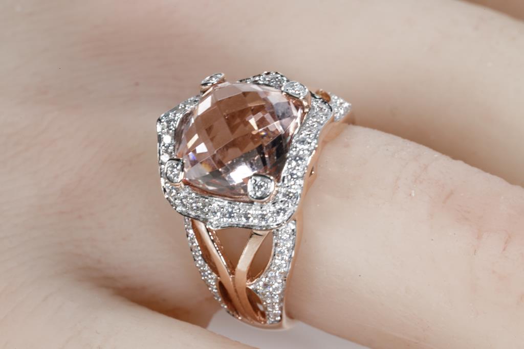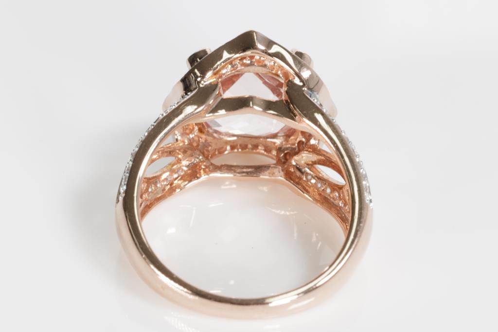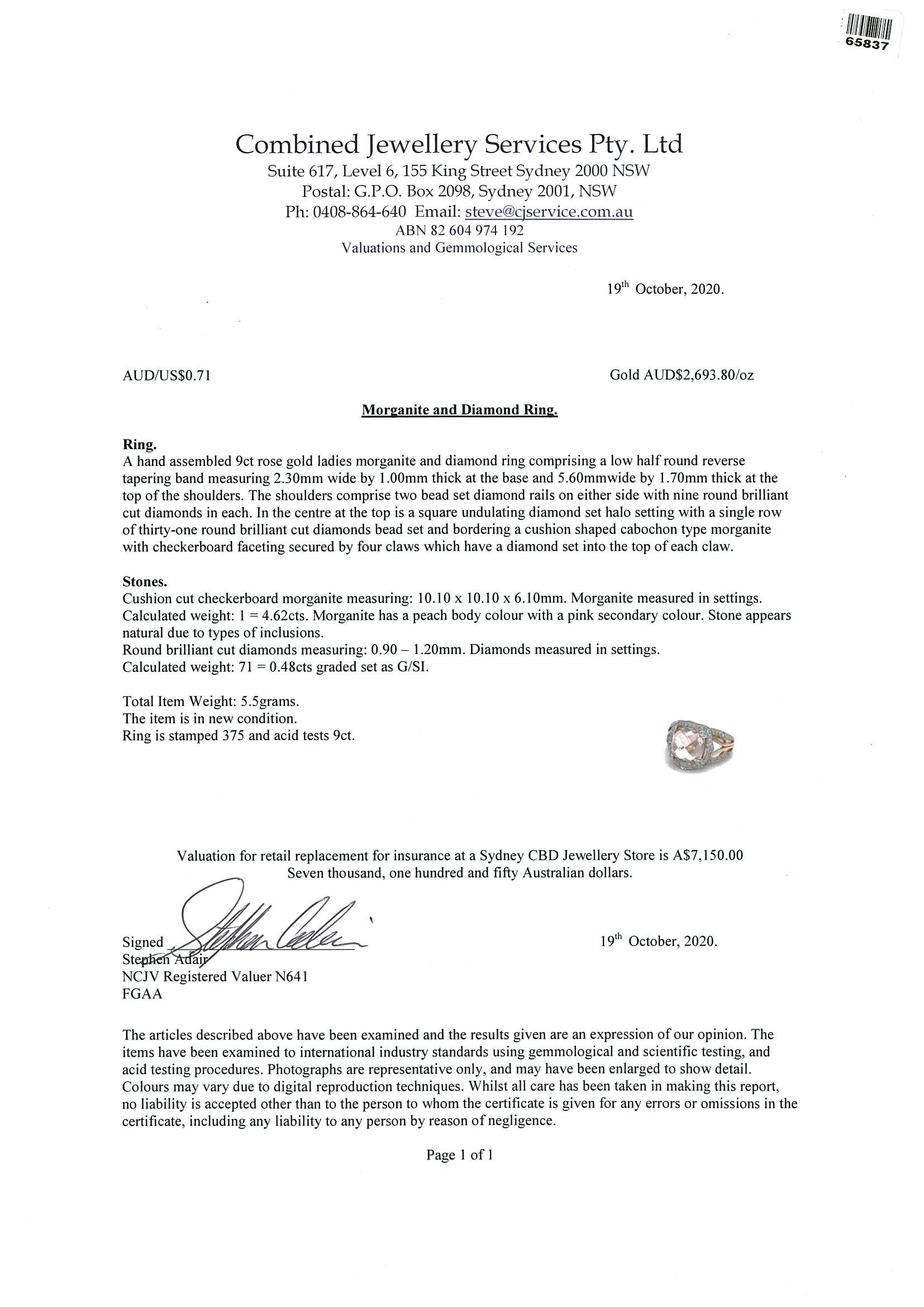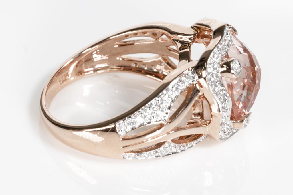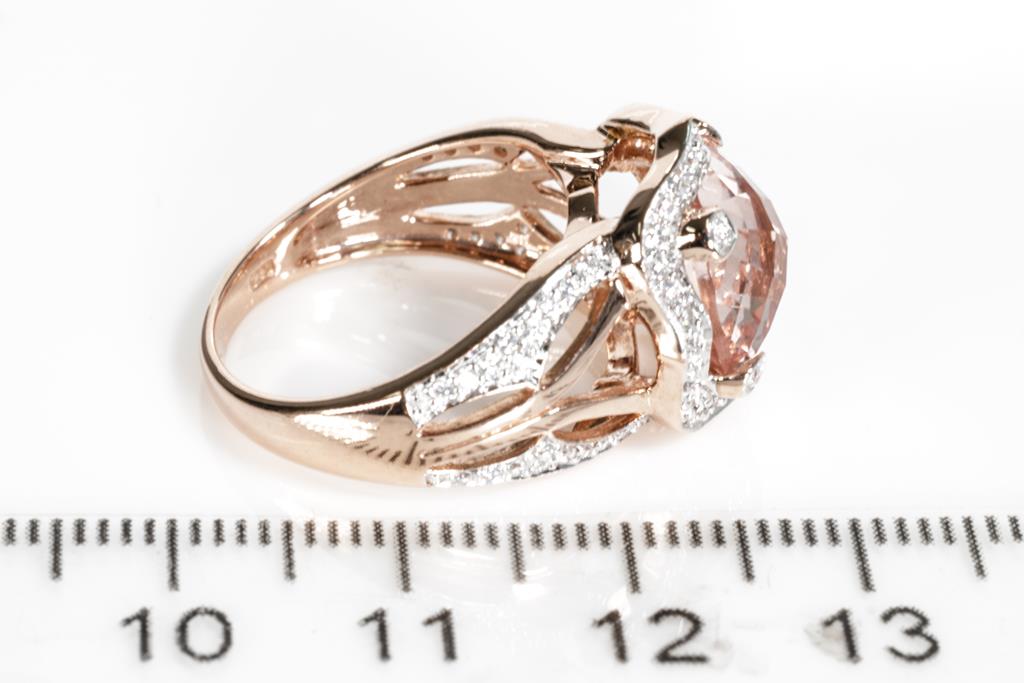 Morganite and Diamond ring with cushion cut Morgnaite of approximately 4.62cts and round Diamonds totalling approximately 0.48cts (Estimated grading: G SI). 9ct rose gold. Ring size M. Weight 5.5g. With valuation. (Pre-owned)