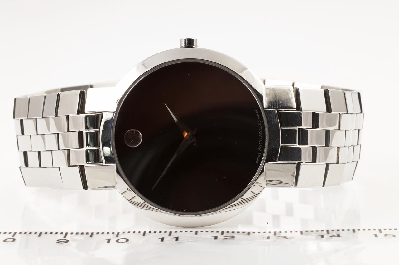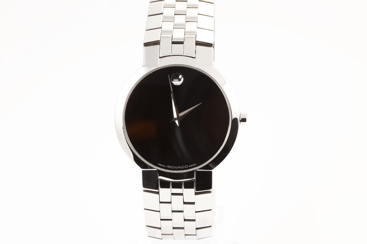 Movado stainless steel quartz watch. Black dial, case diameter 35mm, length: 21cm, dot marker at 12 o'clock, Swiss made. Ref# 84 45 1891. With Movado stainless steel bracelet and clasp. 3 month FSA warranty. (Pre-owned)