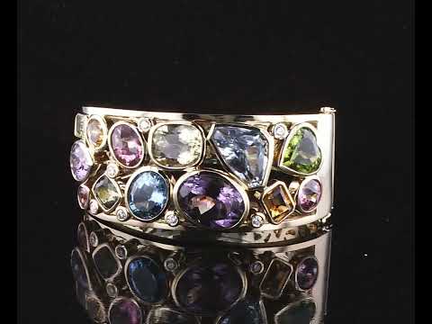 Multi-colour gemstones and Diamond bangle with multi-cut & multi-size Topaz, Peridot, Citrine, Garnet, Amethyst supported by round cut Diamonds totalling approximately 0.35cts (Estimated grading: H-I SI). 18ct yellow gold. Circumference 16cm. Width: 14mm-8mm. Weight 98.5g. With Certificate #416010. (Pre-owned)