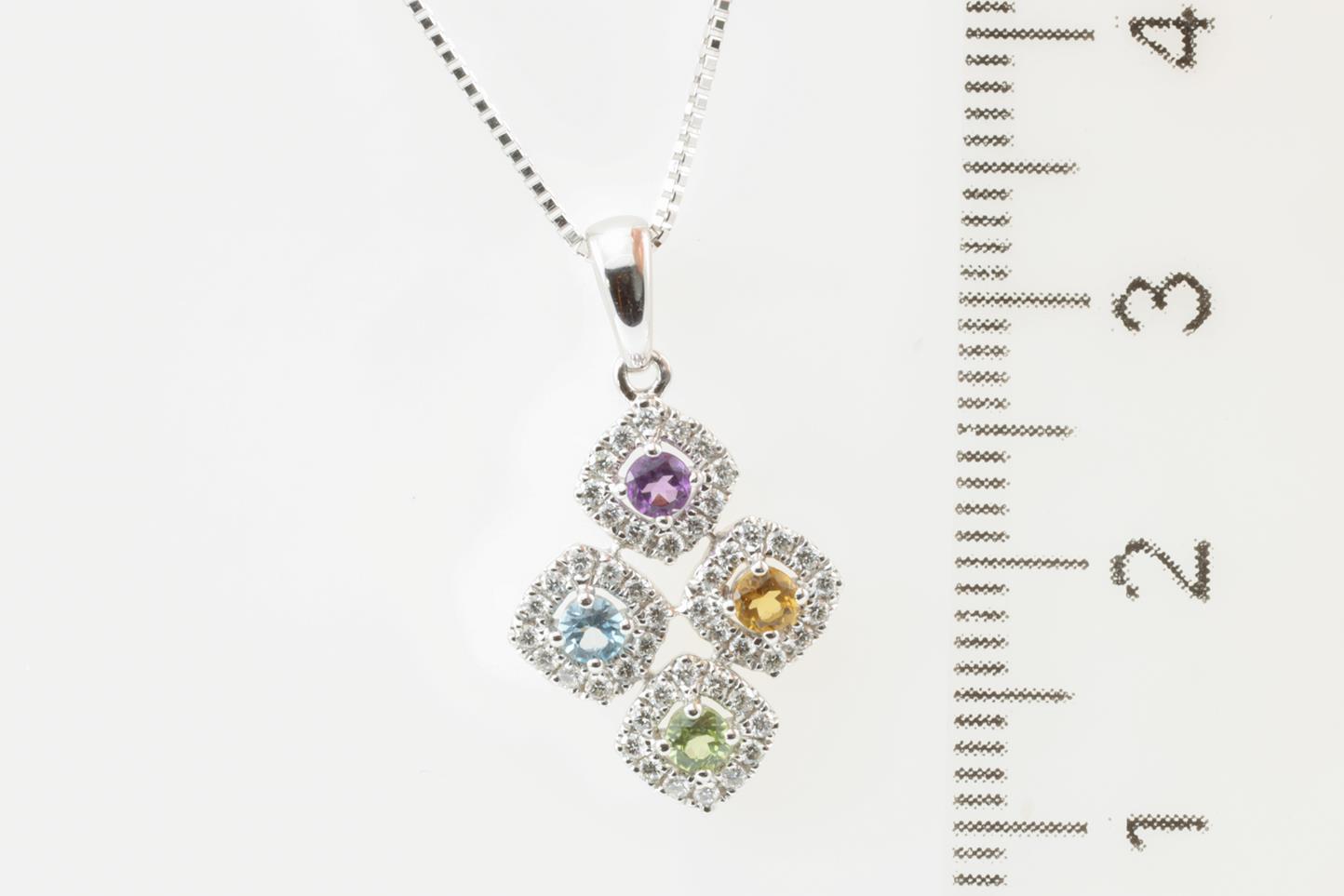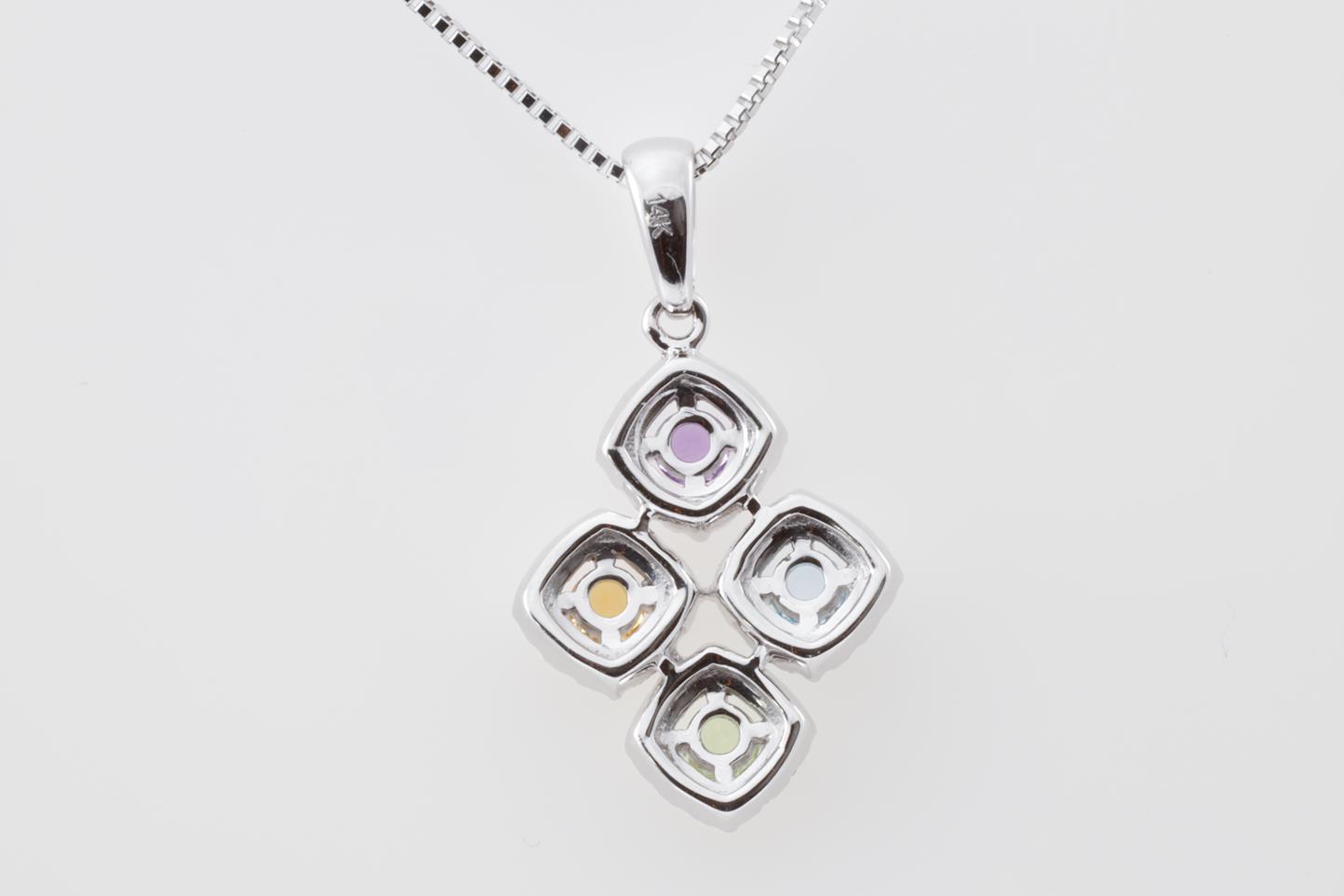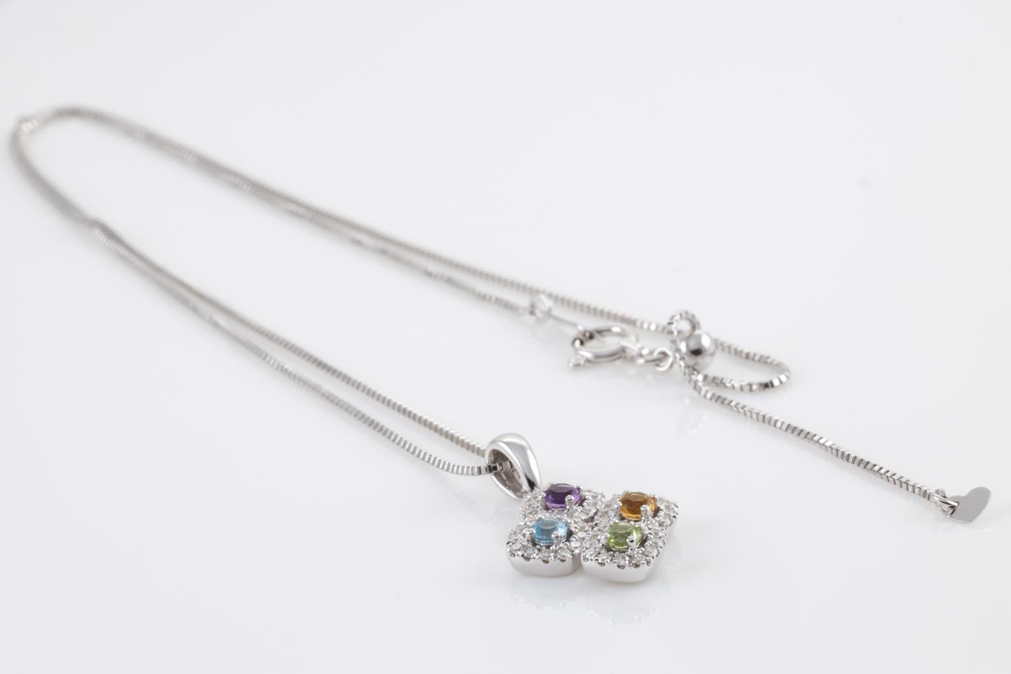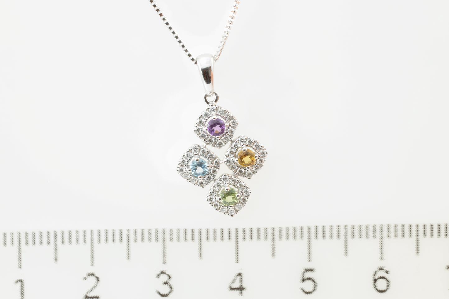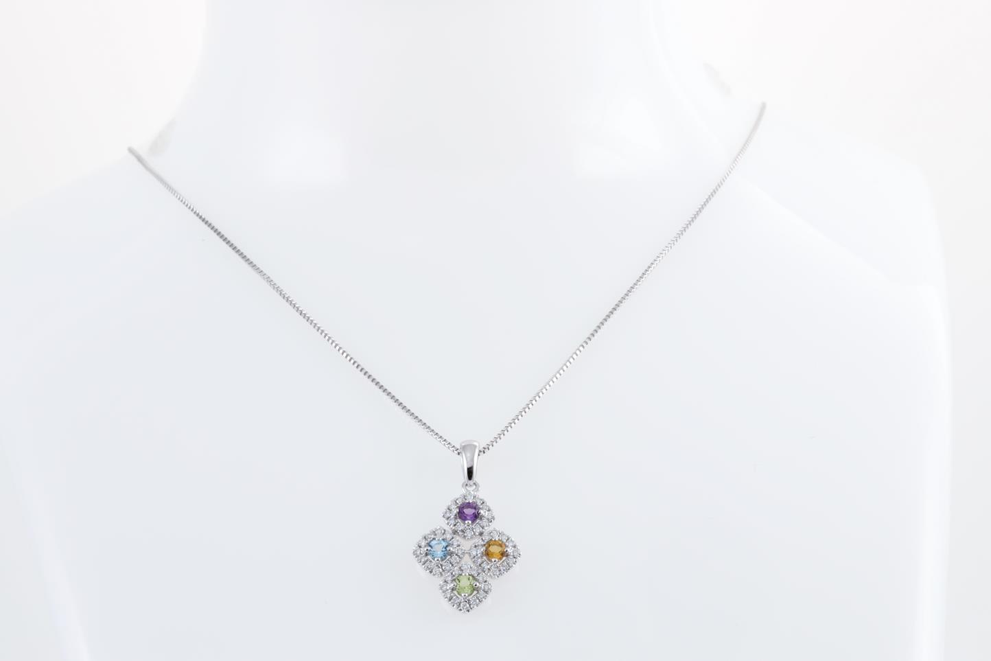 Mixed gemstones and Diamond pendant with Amethyst of 0.06ct, Blue Topaz of 0.07ct, Citrine of 0.07ct, Peridot of 0.07ct and Diamonds totalling 0.23cts. 14ct white gold with 18ct gold adjustable 45cm chain. Weight: 5.2g (New)