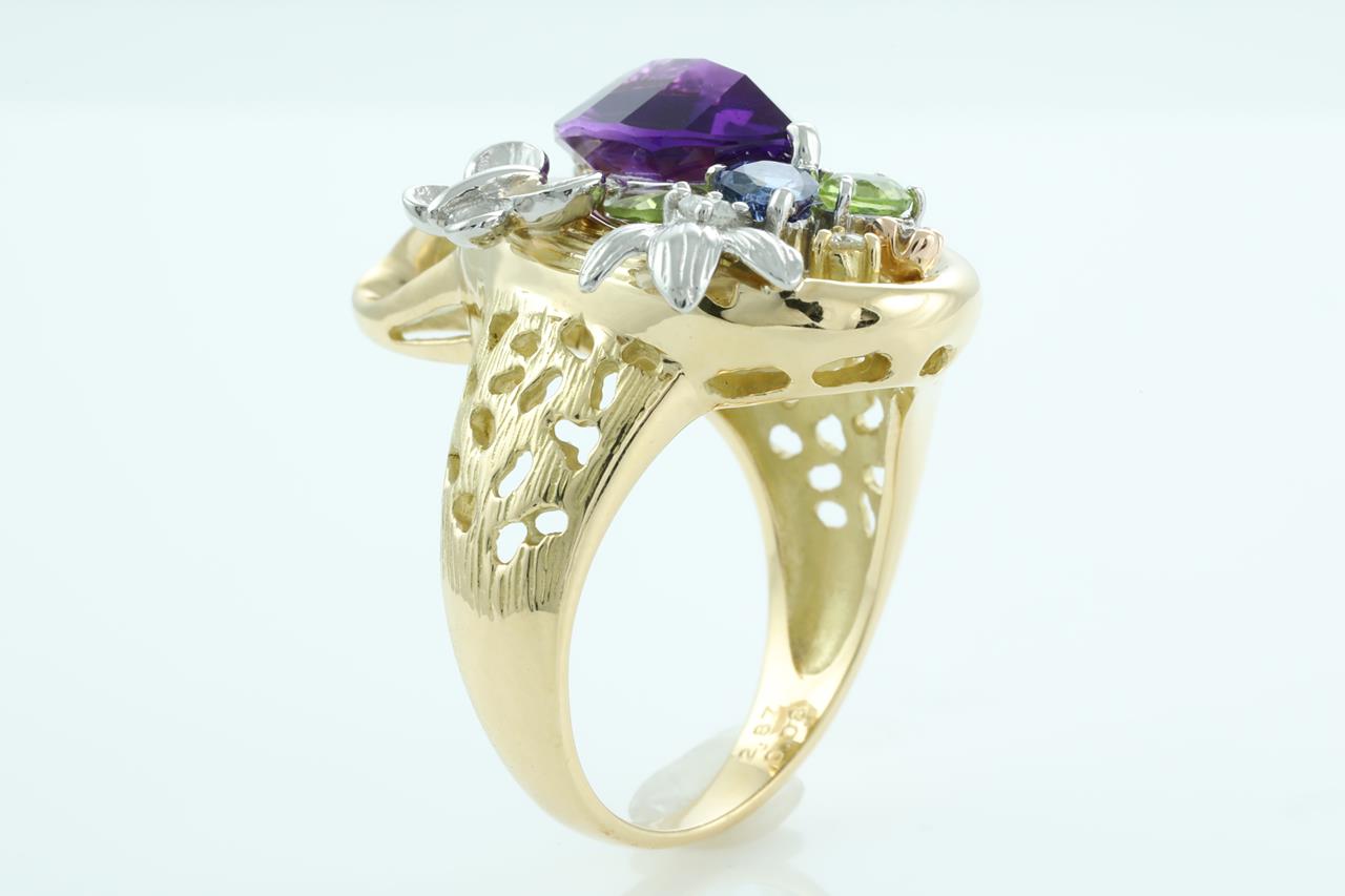 Multi-colour gemstones and Diamond ring with fancy shape Amethyst of 2.87ct, Peridot, Sapphire, Topaz and Diamonds totalling 0.08cts. Platinum and 18 yellow gold. Ring size: L. Weight: 14.9g (Pre-owned)