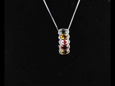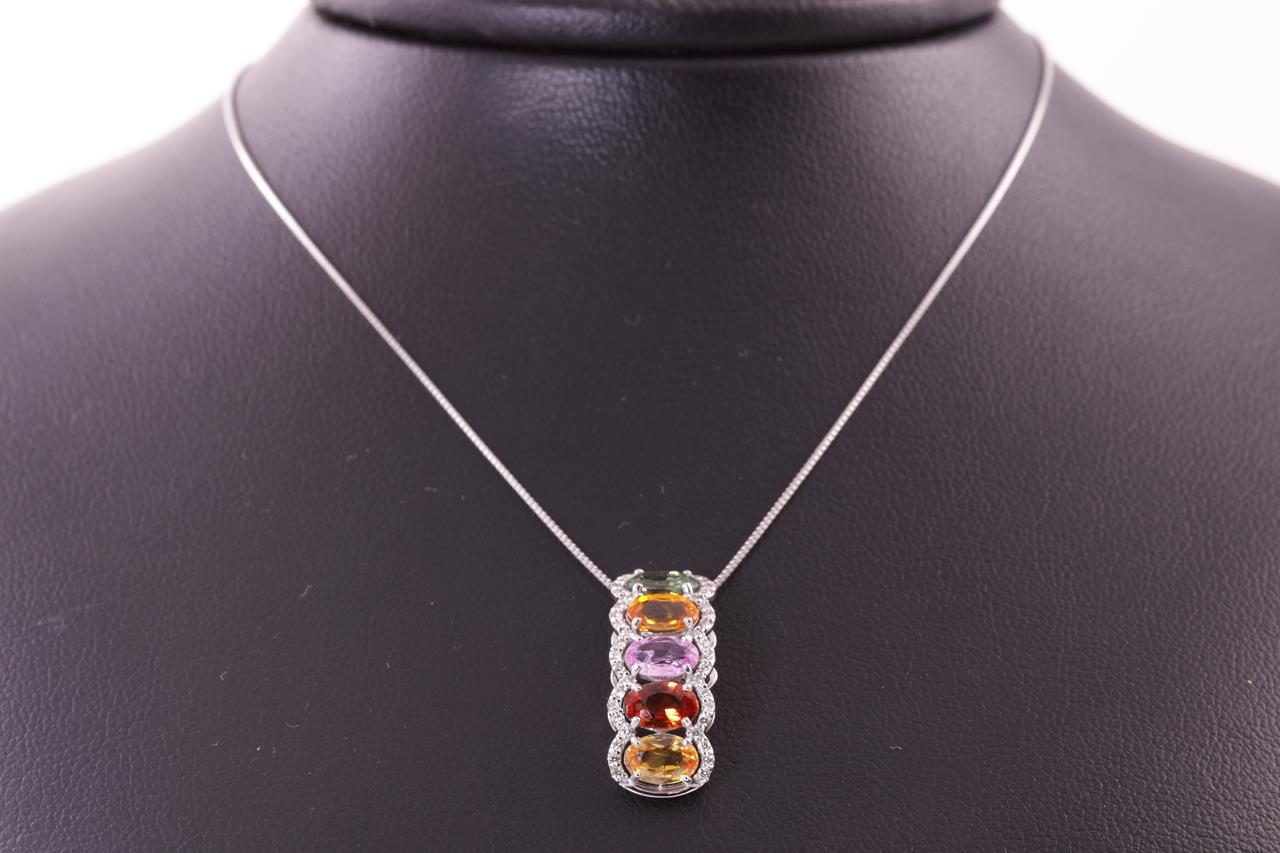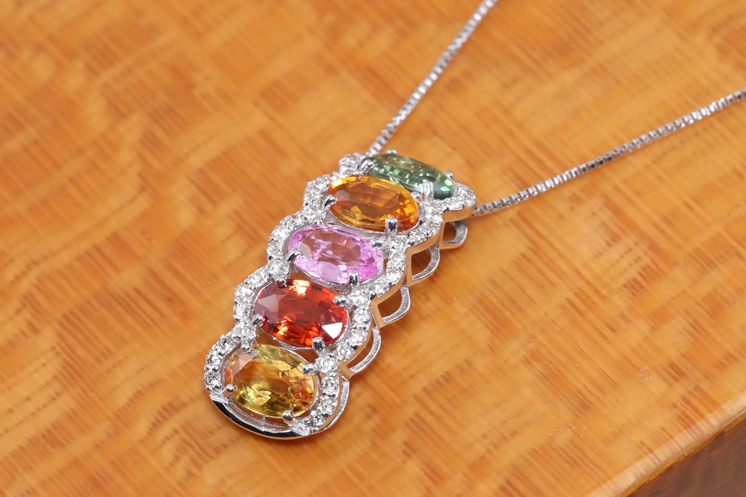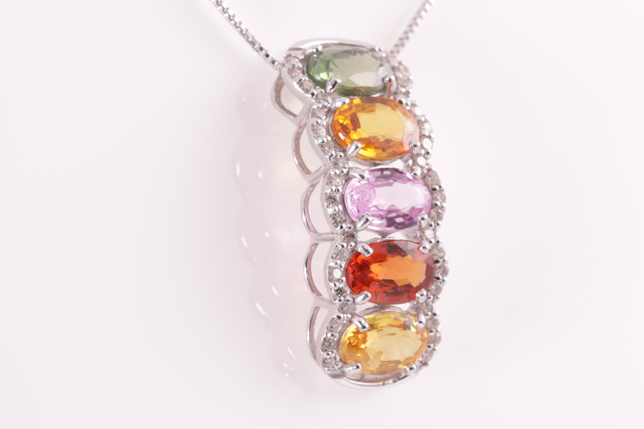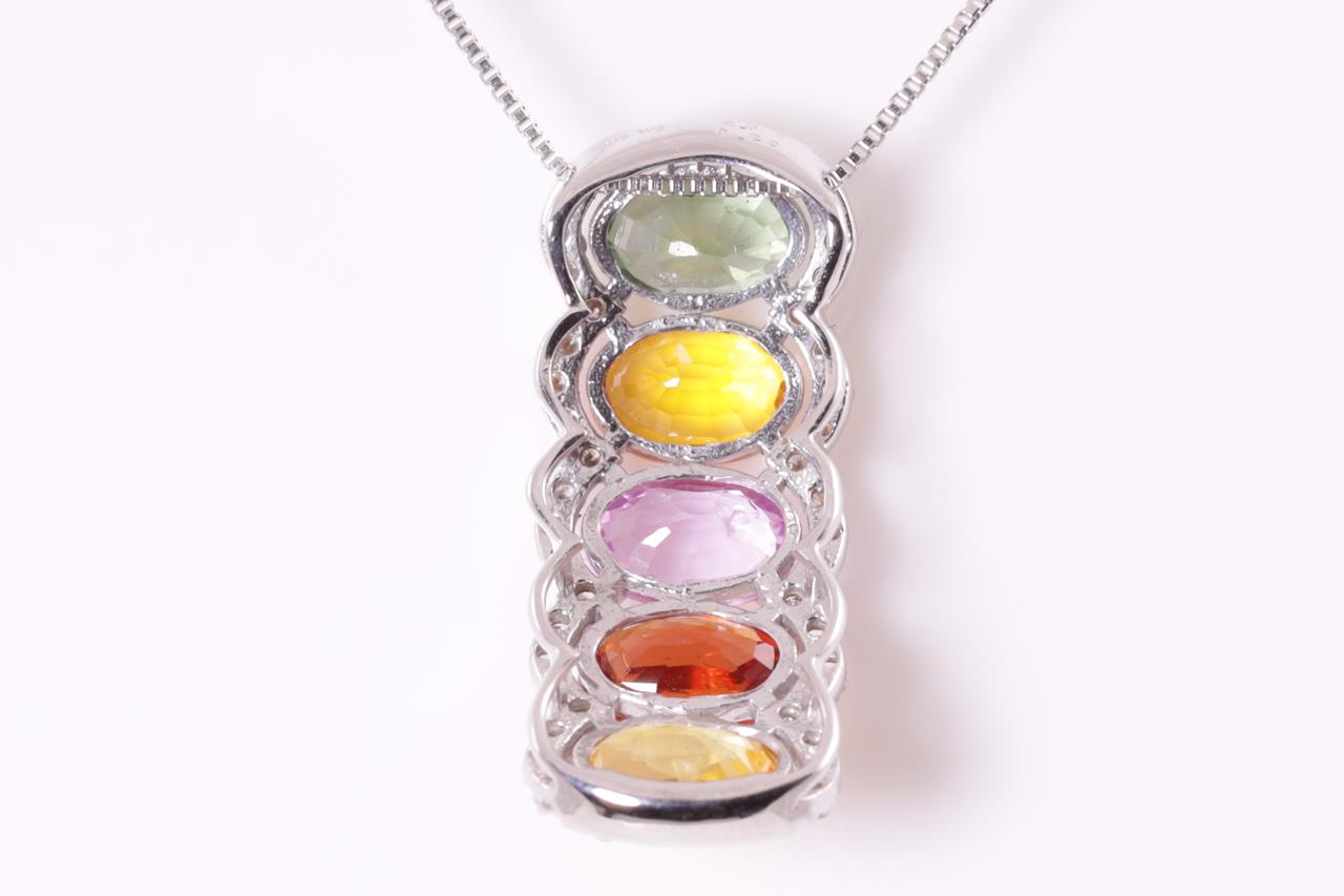 Sapphire and Diamond pendant with oval shape multi colour Sapphires totalling 3.00cts and Diamonds totalling 0.20cts. 18ct white gold with adjustabe 45cm chain. Weight: 3.3g. (Pre-owned)