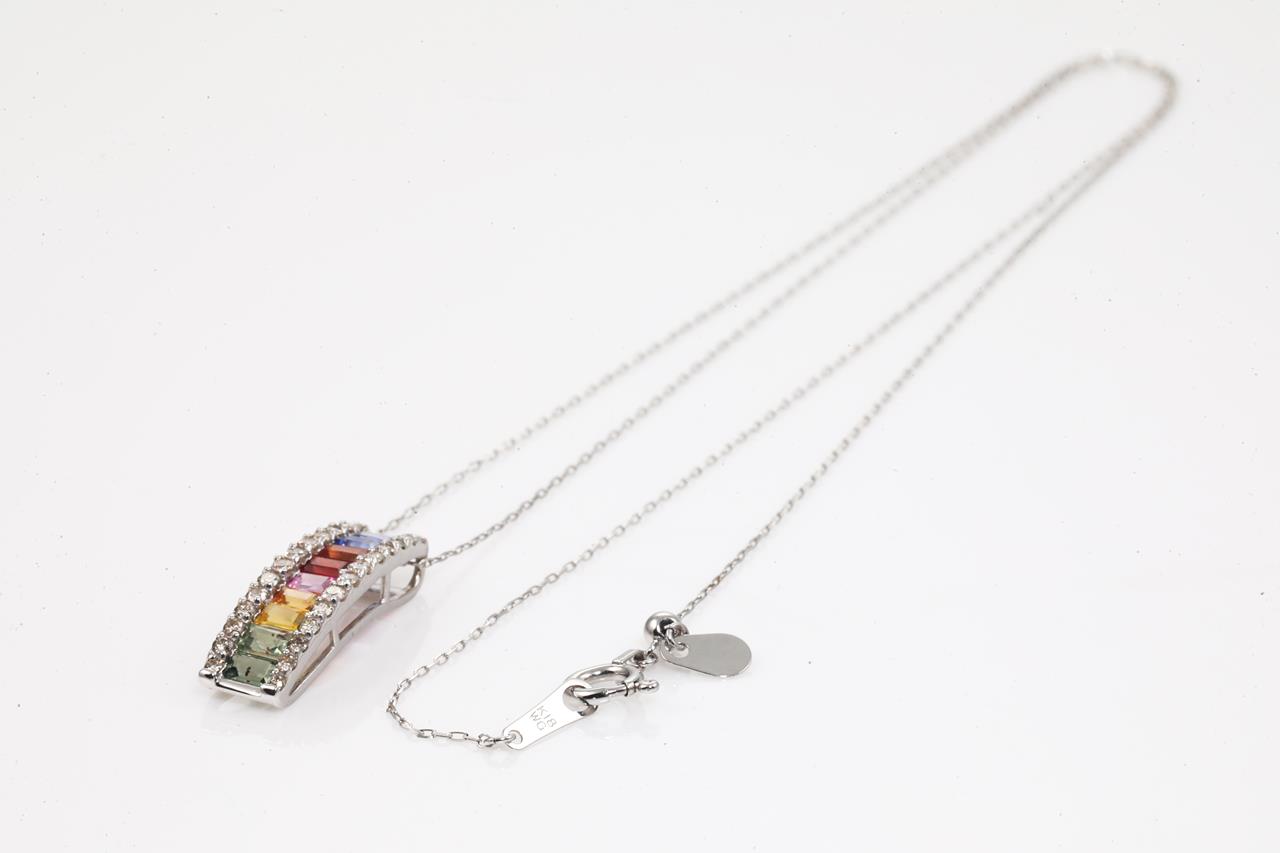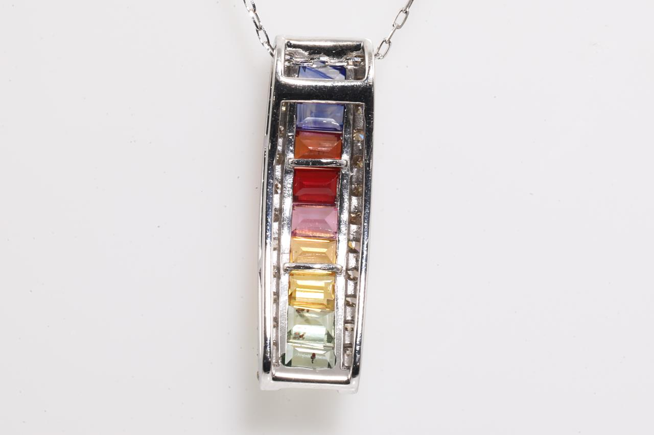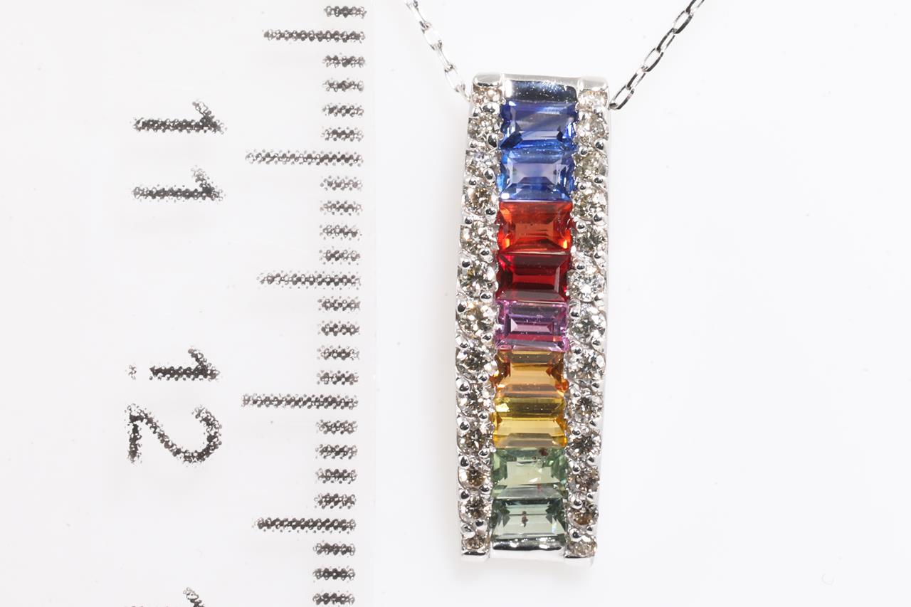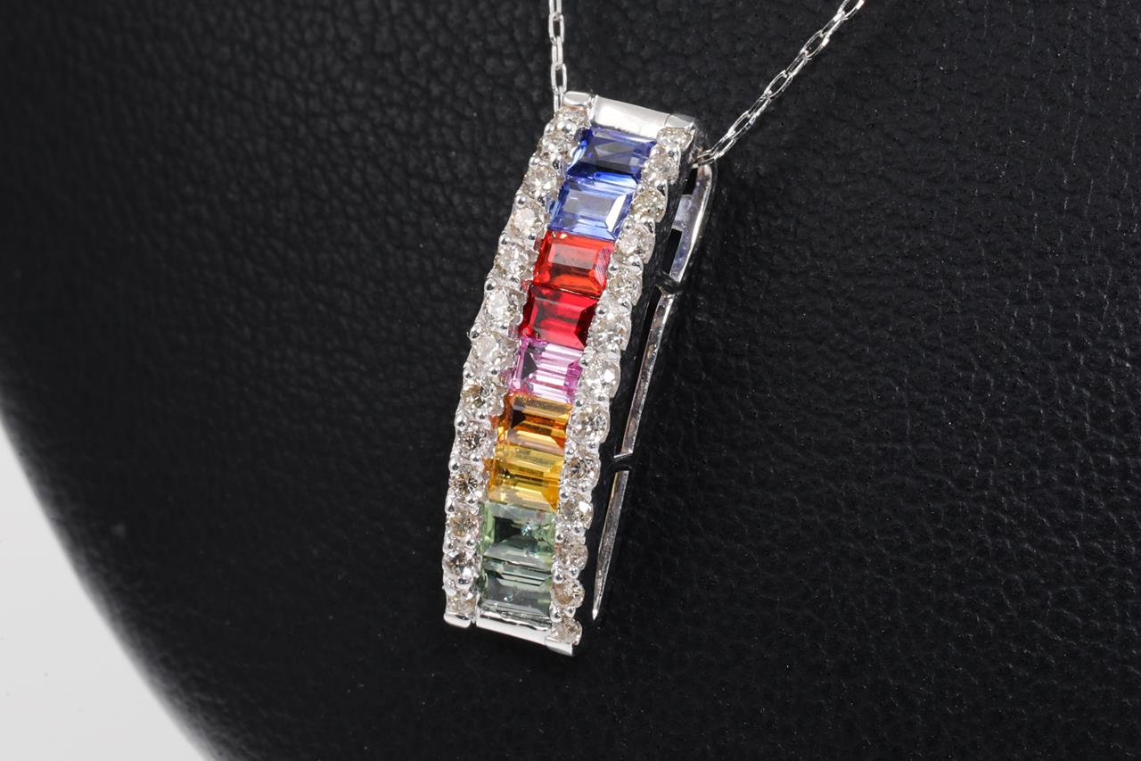 Sapphire and Diamond pendant with baguette cut multi-colour Sapphires totalling 1.00cts and Diamonds totalling 0.25cts. 18ct white gold with 45cm adjustable chain. Weight: 2.2g (Pre-owned)