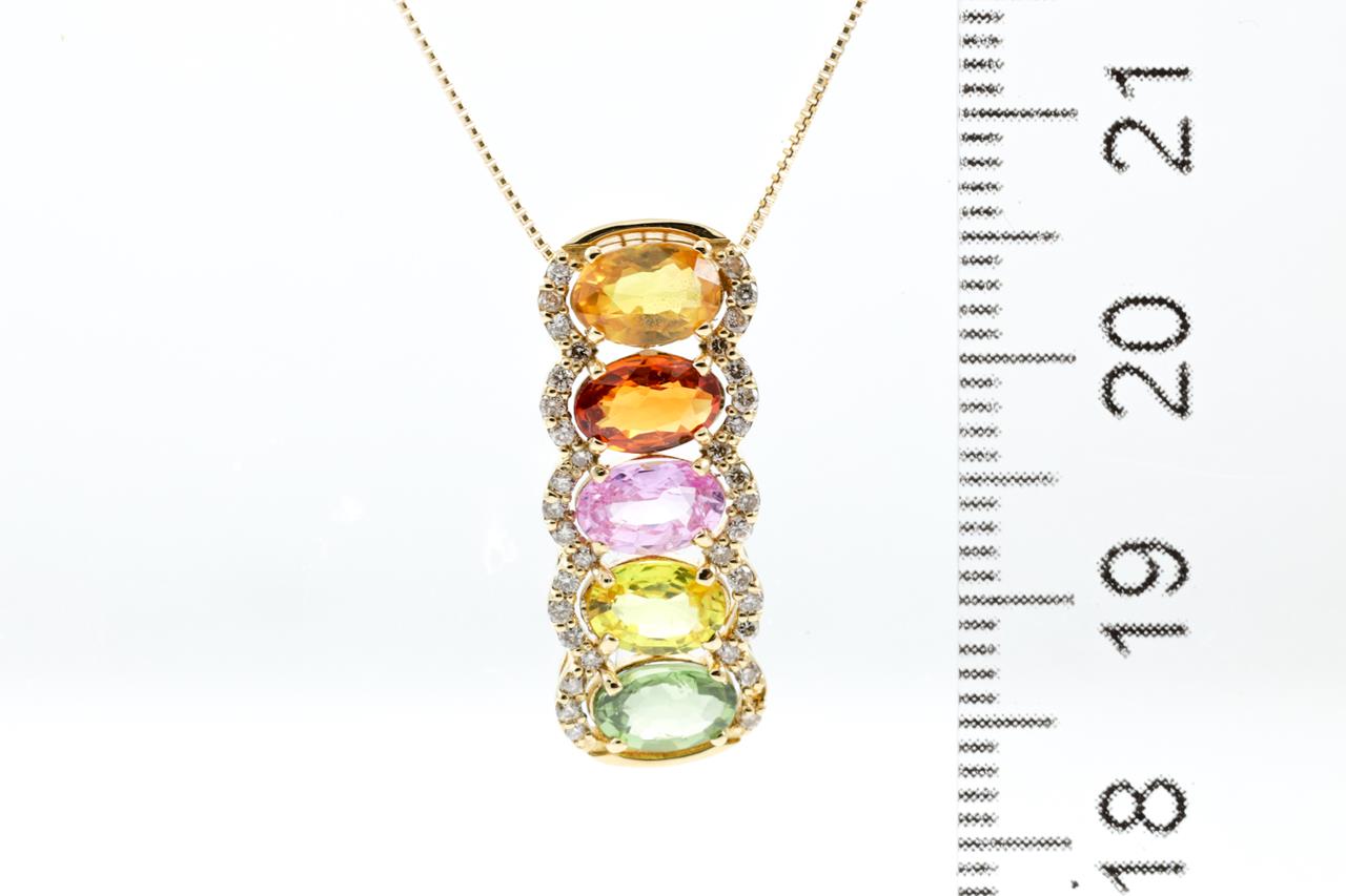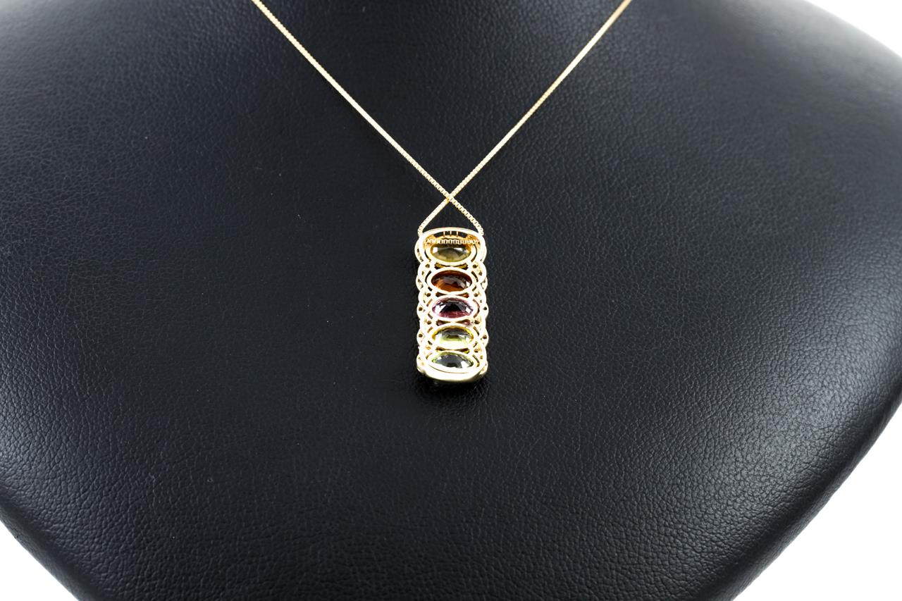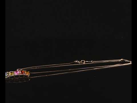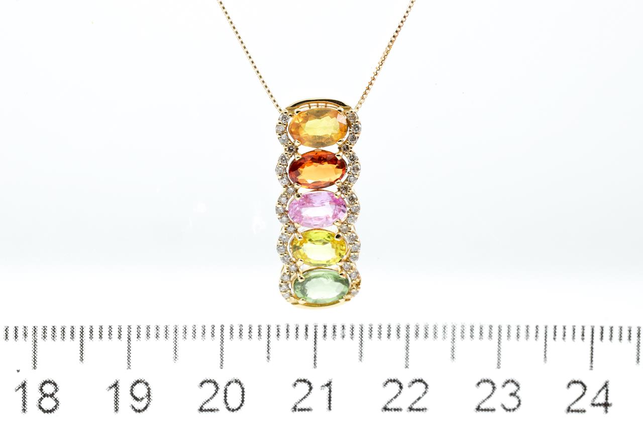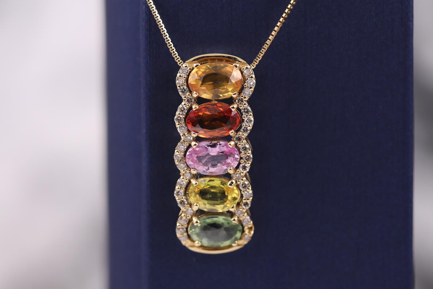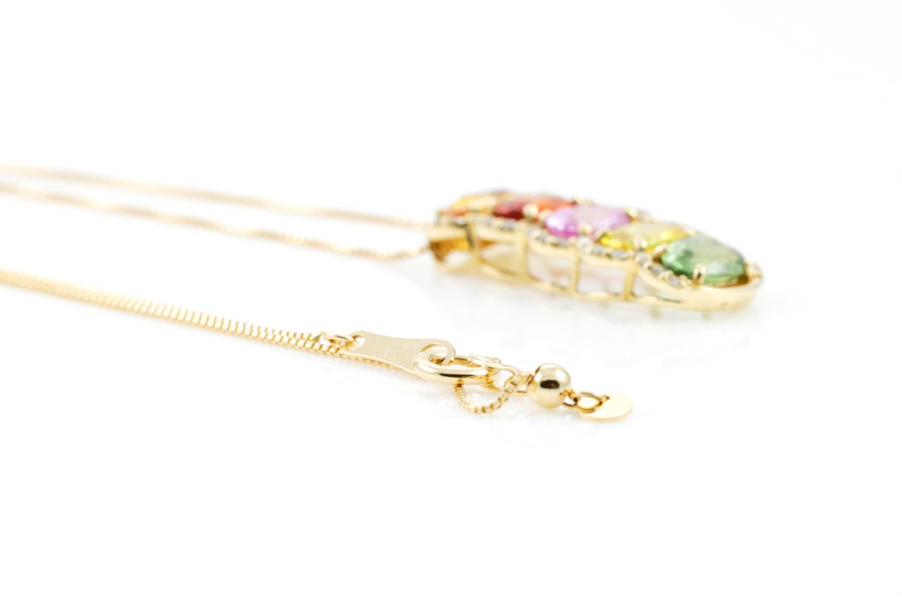 Sapphire and Diamond pendant with oval shape multi-colour Sapphires totalling 3.00cts and Diamond totalling 0.20cts. 18ct yellow gold with adjustable 45cm chain. Weight: 3.3g. (Pre-owned)