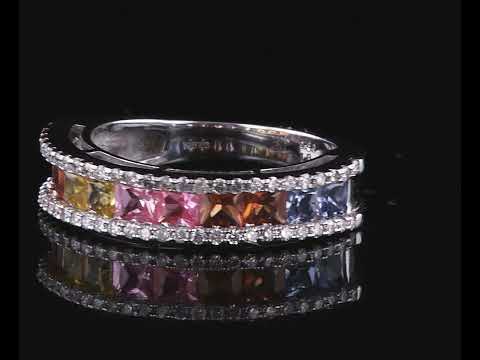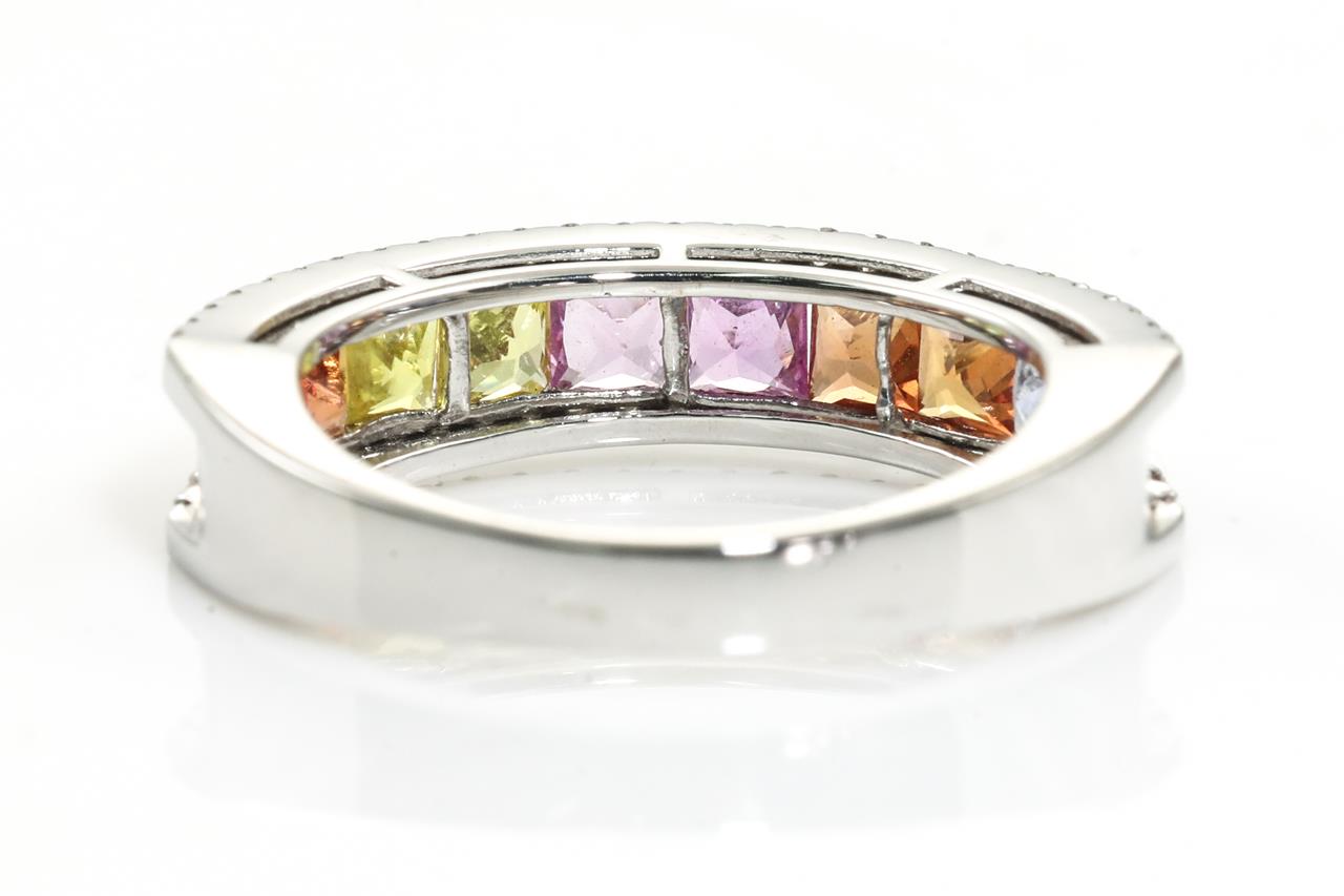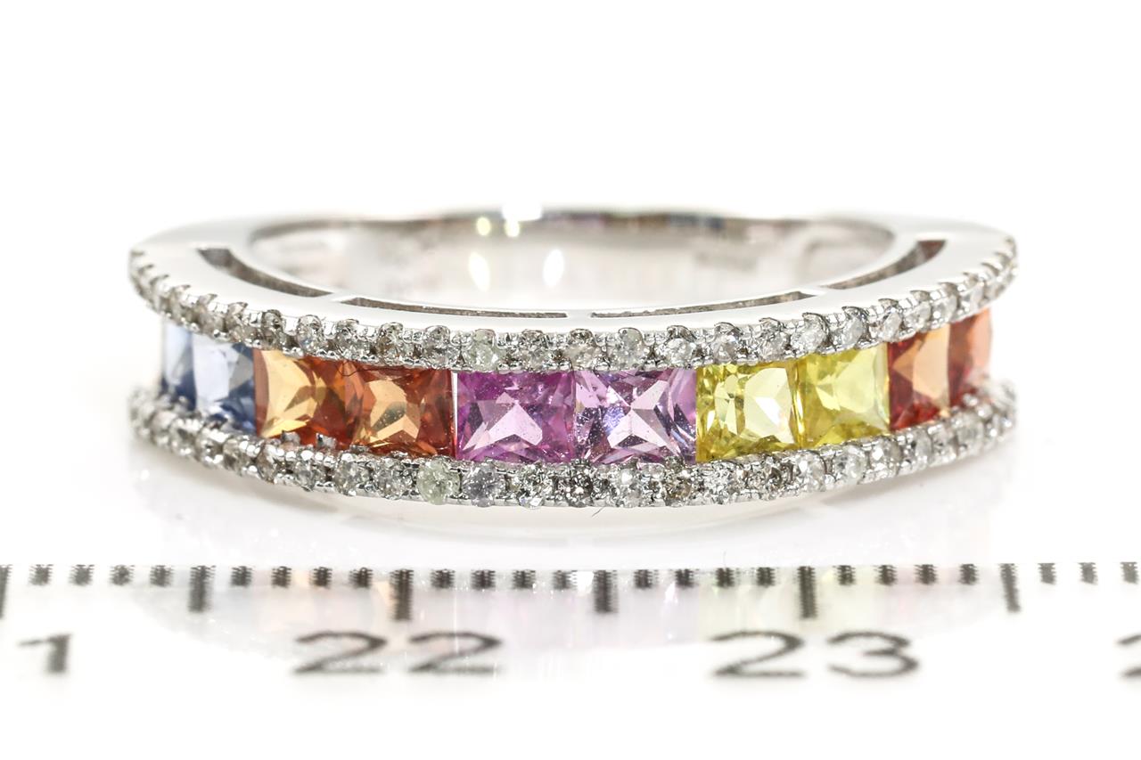 Sapphire and Diamond Ring with princess cut multi-colour Sapphires totalling 1.90cts and Diamonds totalling 0.30cts (Estimated grading: I-K P2-3). 18ct white gold. Ring size: L - ring resizing is not recommended. Weight: 4.2g (Pre-owned)