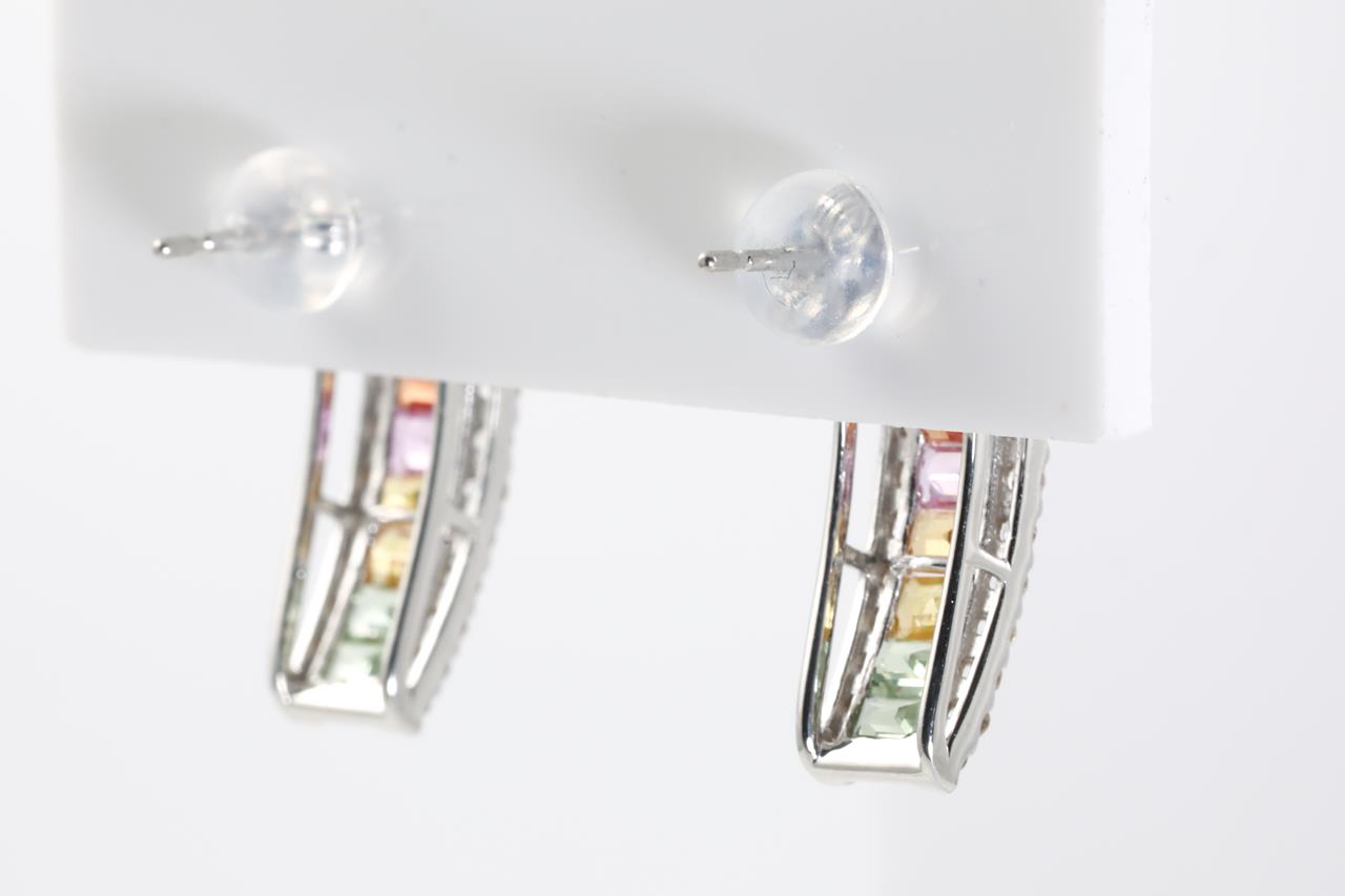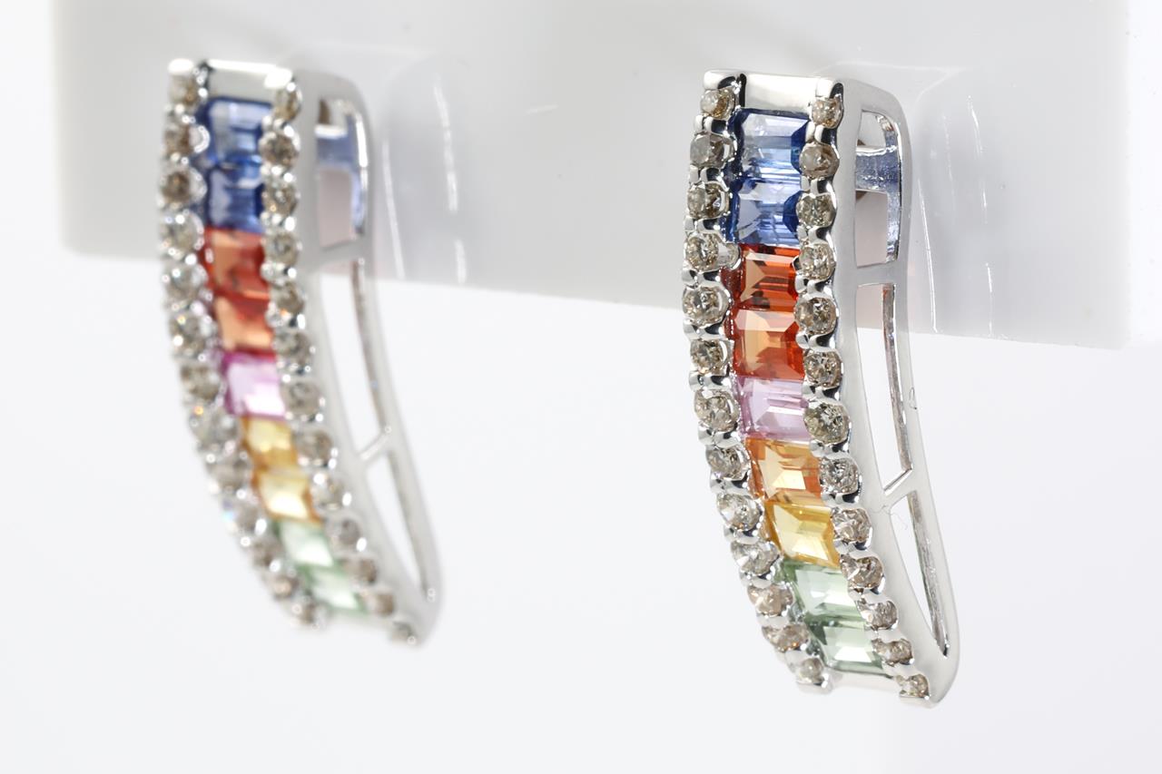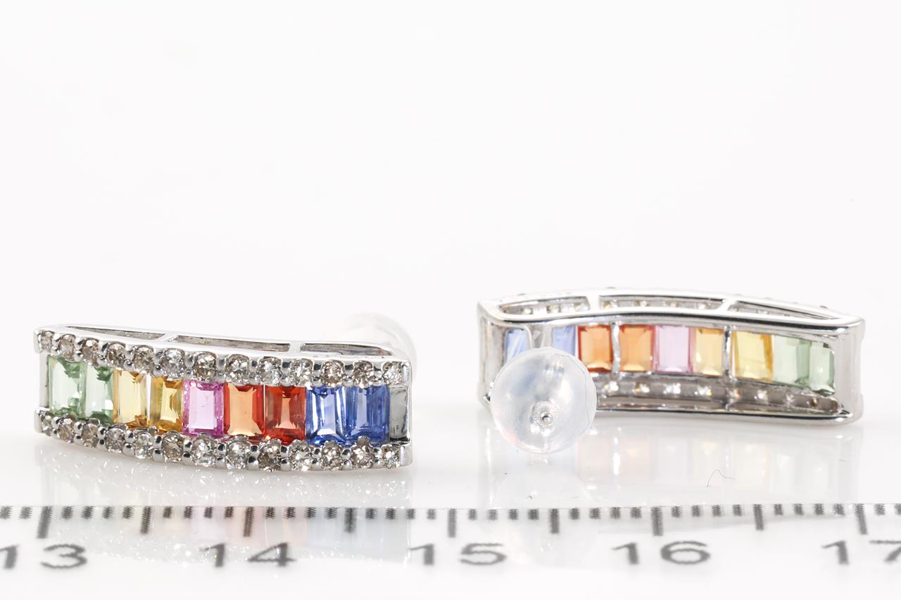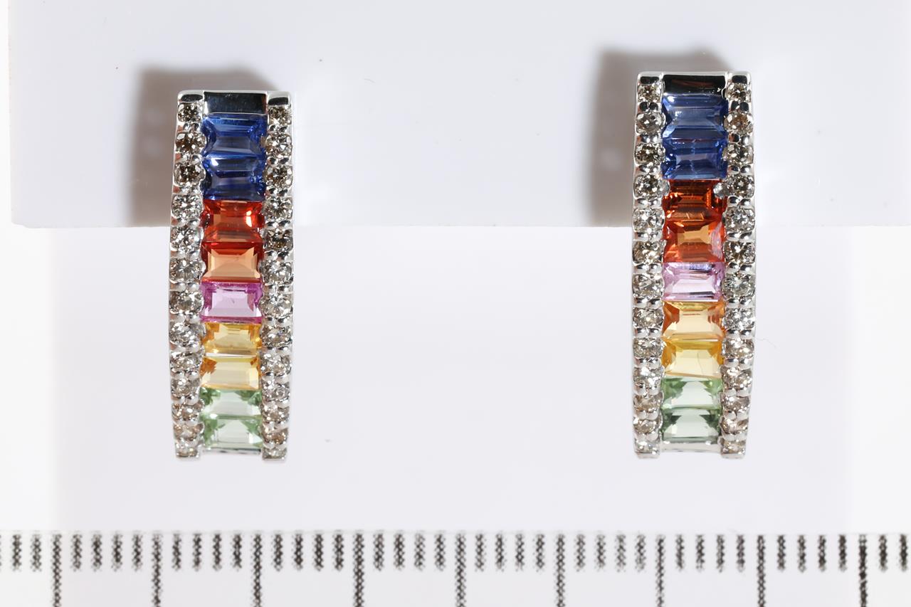 Sapphire and Diamond Earrings with baguette cut Multi-coloured Sapphires totalling 2.00cts and Diamonds totalling 0.50cts (Estimated grading: I SI-P1). 18ct white gold with gold & silicon backs. Weight: 3.1g (Pre-owned)