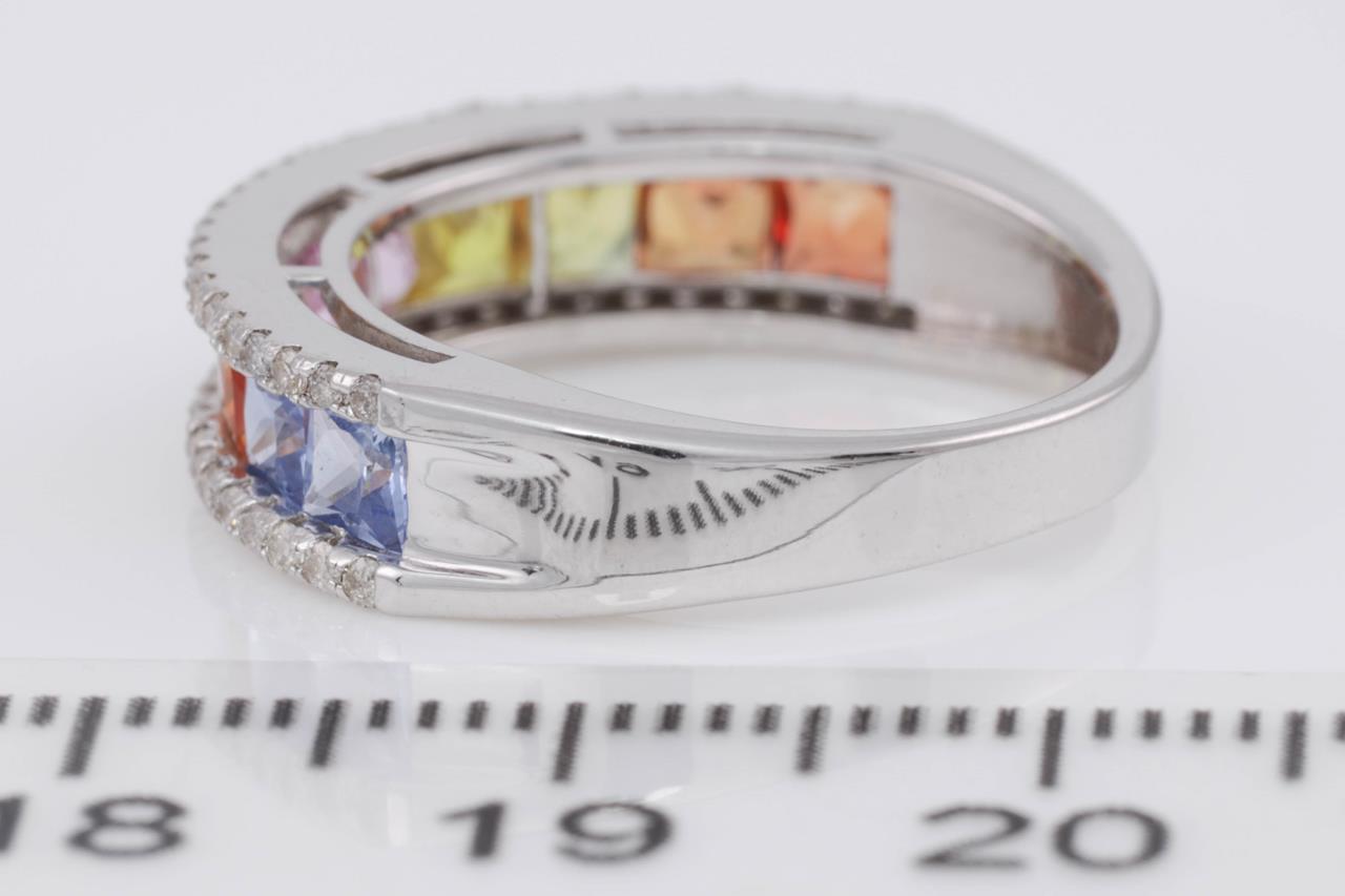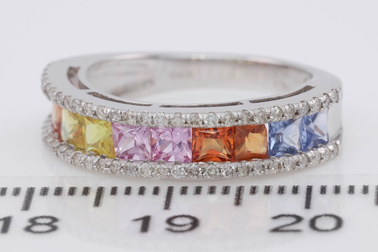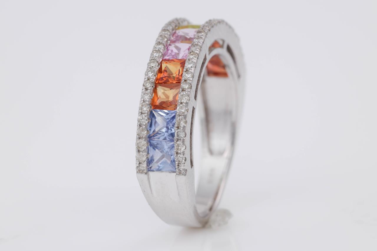Sapphire and Diamond ring with princess cut multi-colour Sapphires totalling 1.90cts and Diamonds totalling 0.30cts (Estimated grading: I-J P1-2). 18ct white gold. Ring size L - ring resizing is not recommended. Weight: 4.3g (Pre-owned)