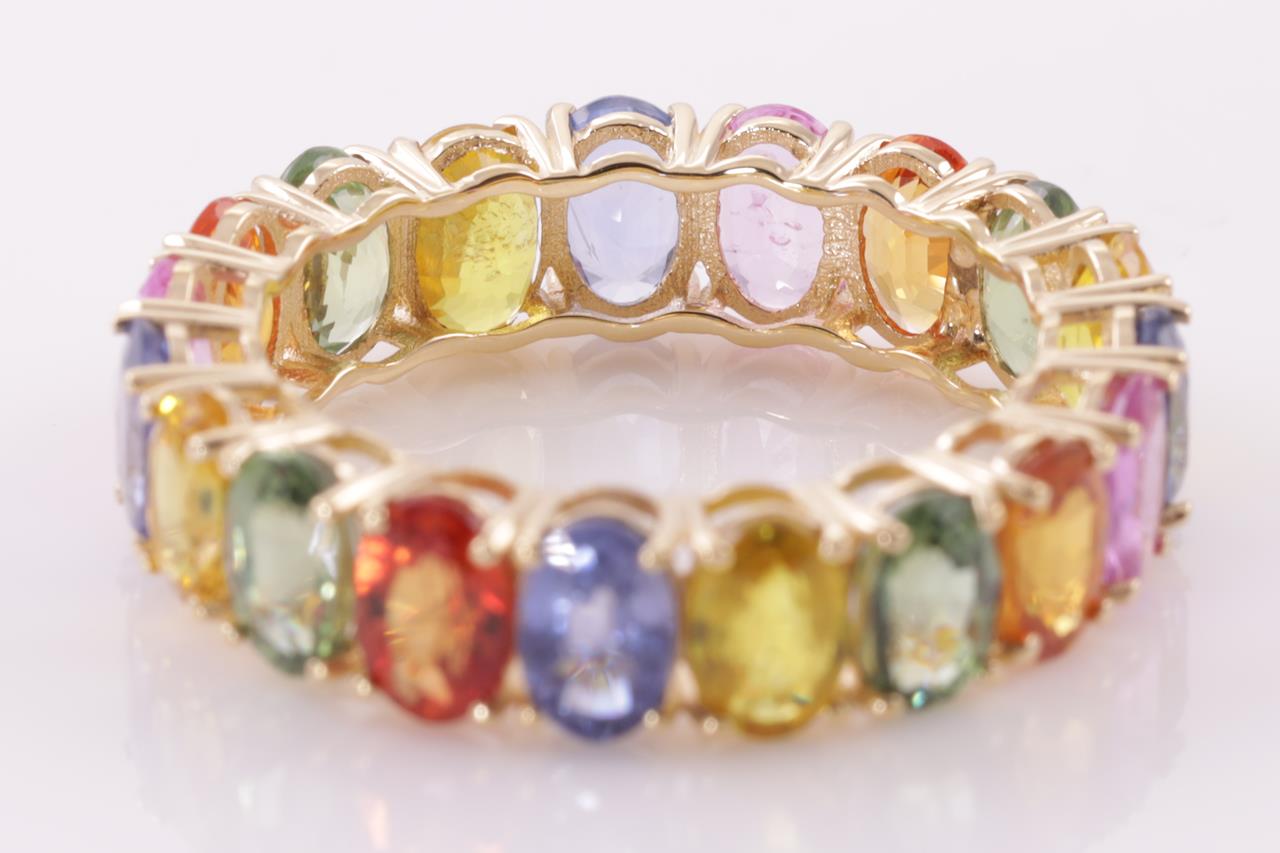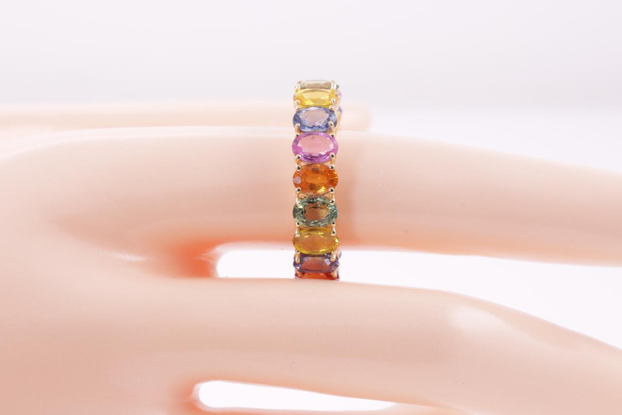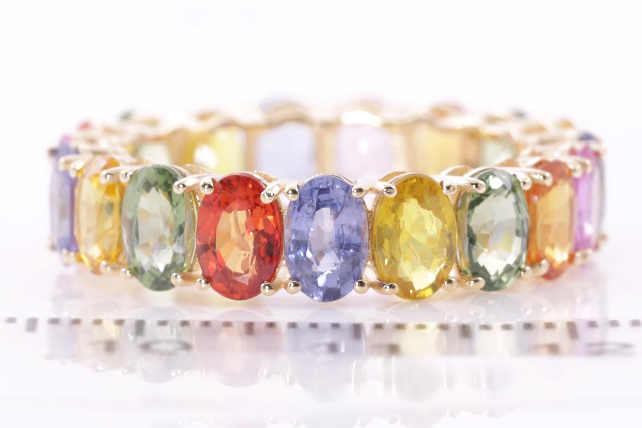 Sapphire ring with oval cut multi-colour Sapphire totalling 11.48cts. Sapphires size approximately 6.0mmx4.0mm. 18ct yellow gold. Ring size T - Resizing is not recommended for this ring. Weight: 5.0g (Pre-owned)