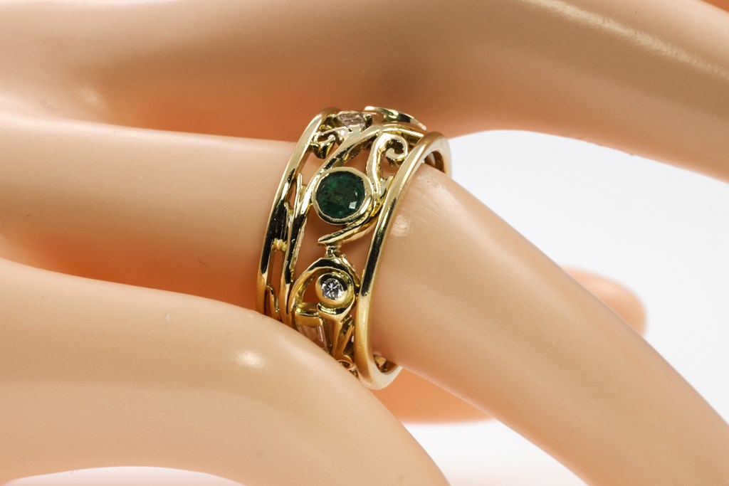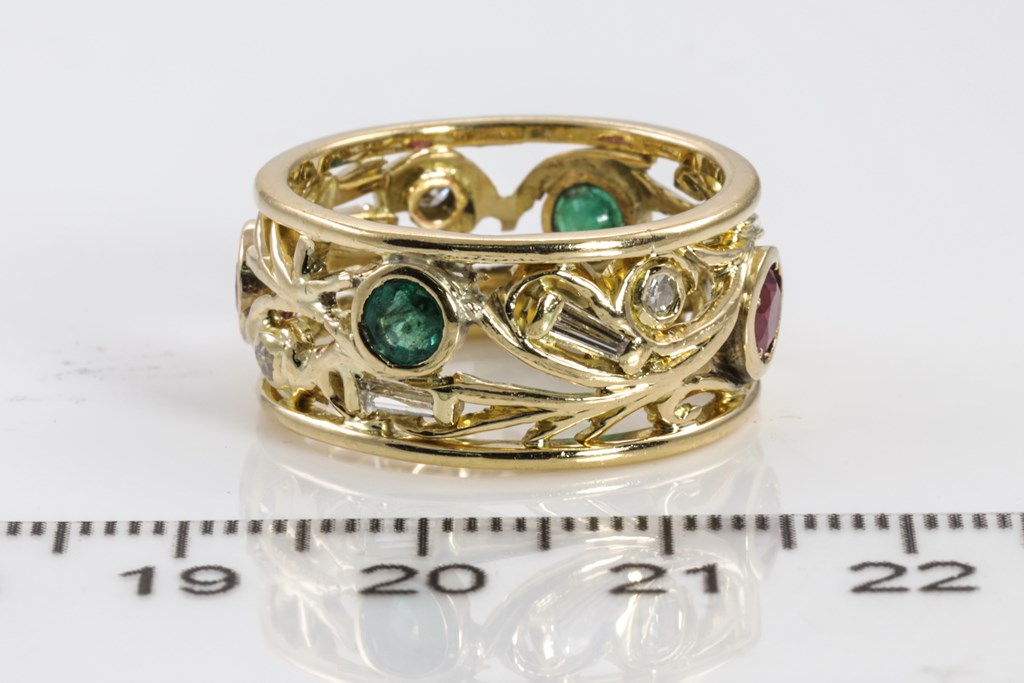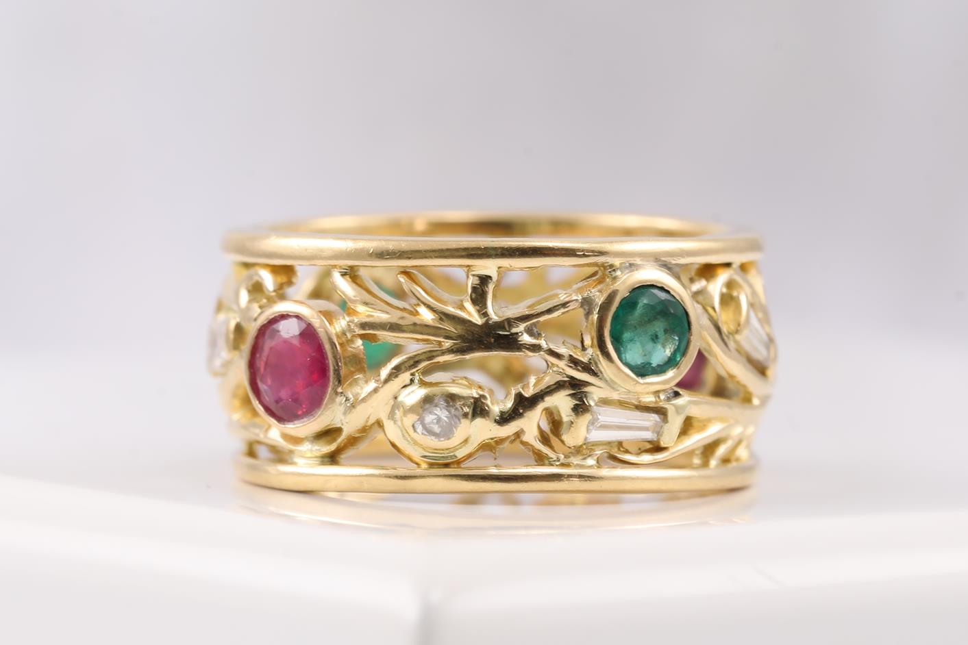 Multi-coloured gemstone and Diamond Ring with Emerald totalling approximately 0.40cts, Tourmaline totalling approximately 0.40cts and round & baguette cut Diamonds totalling approximately 0.25cts. 18ct yellow gold. Ring size O. Weight: 8.6g (Pre-owned)
