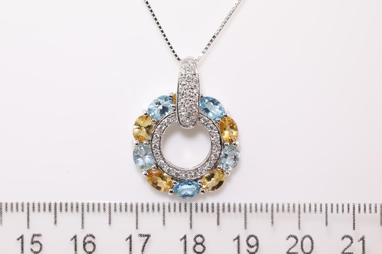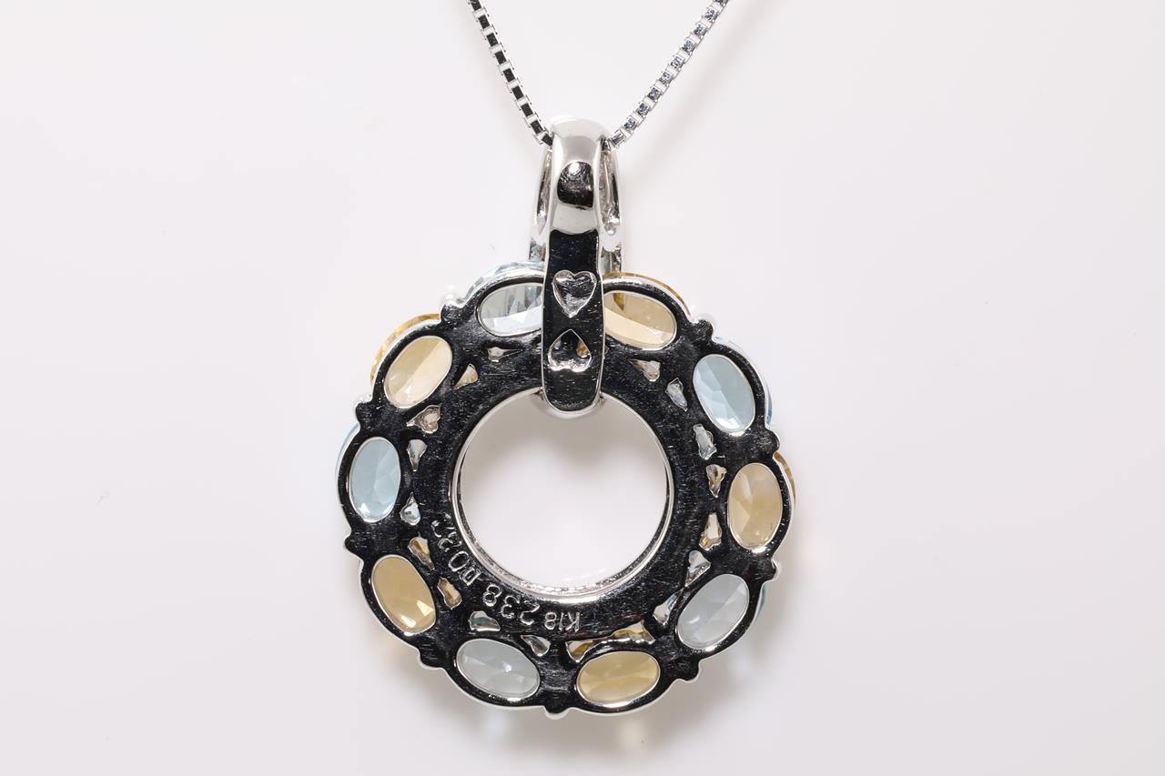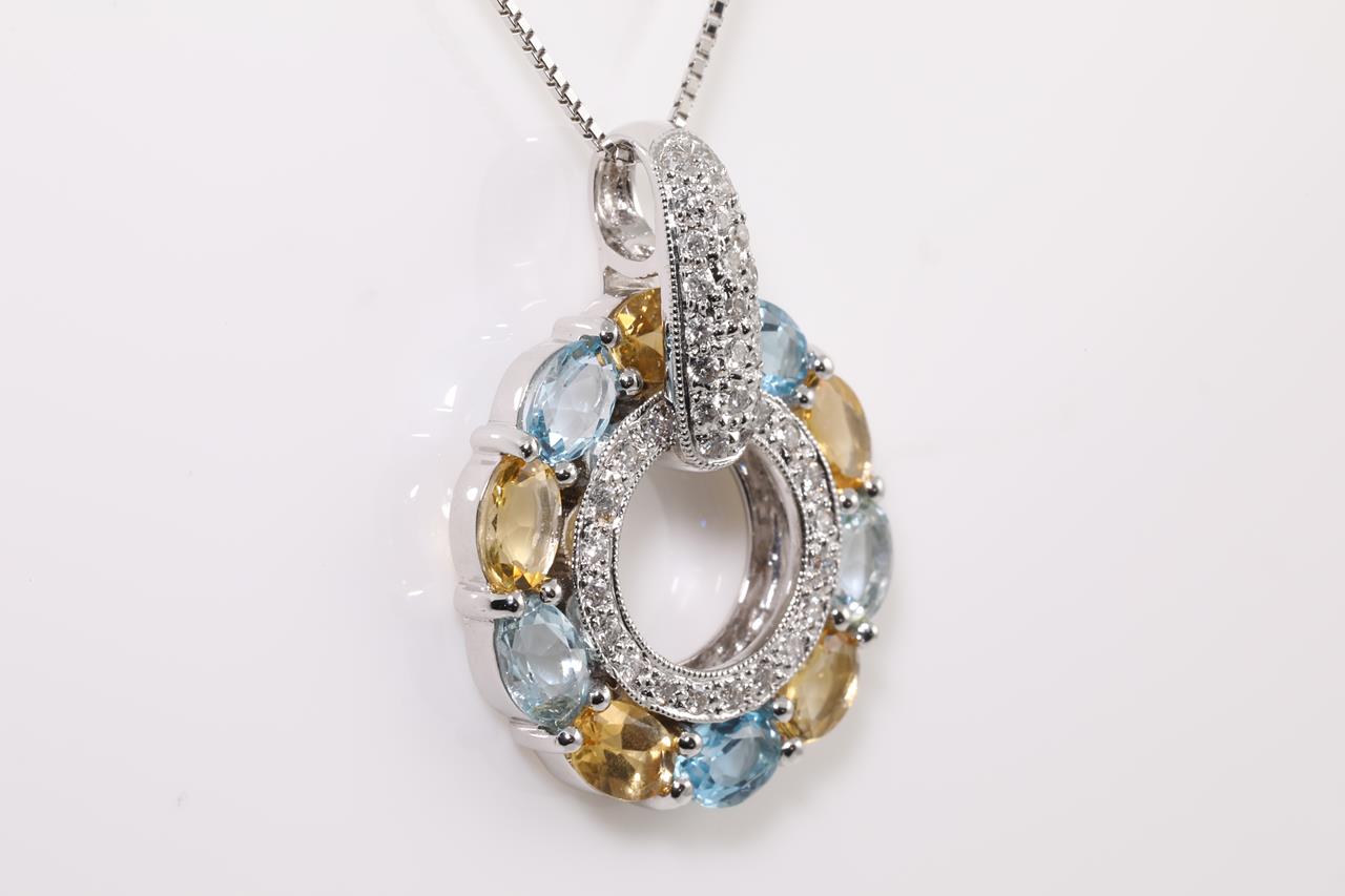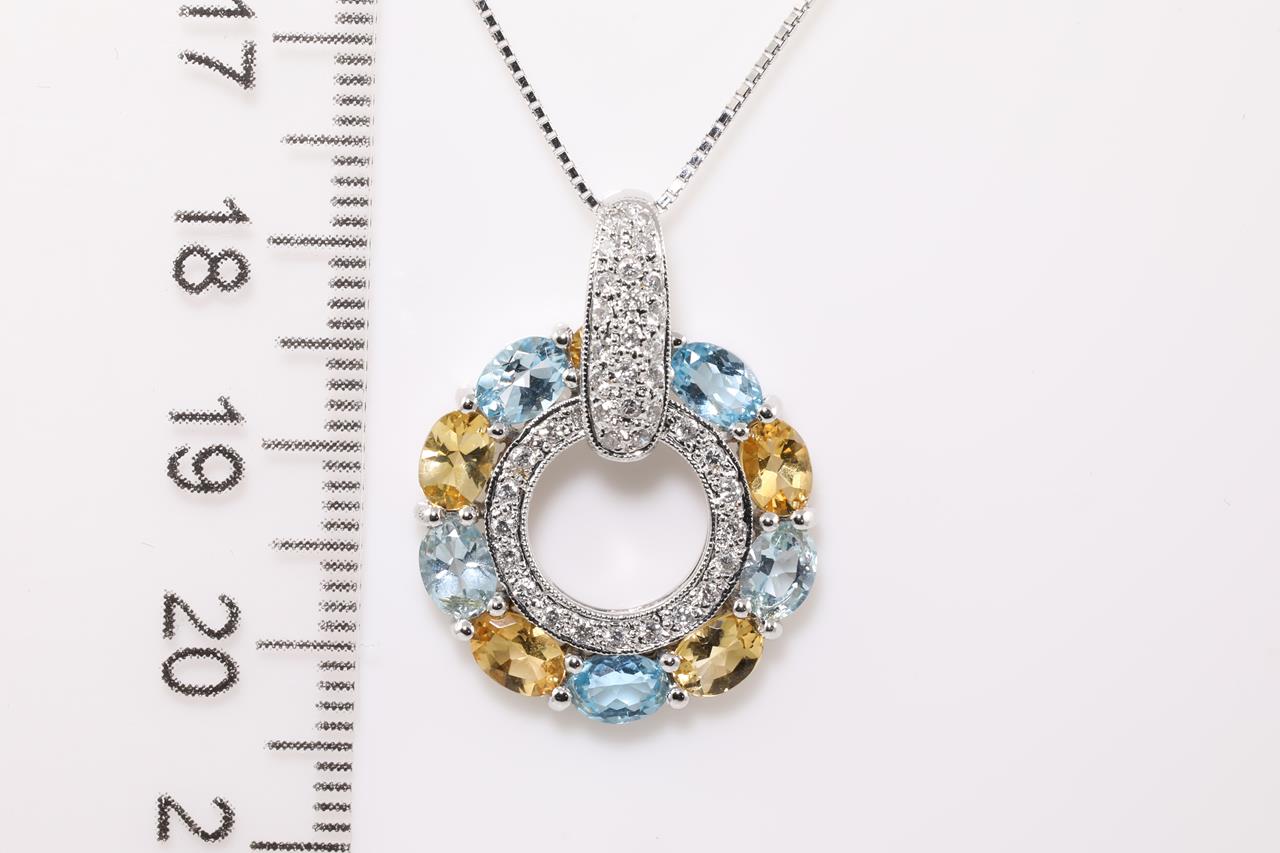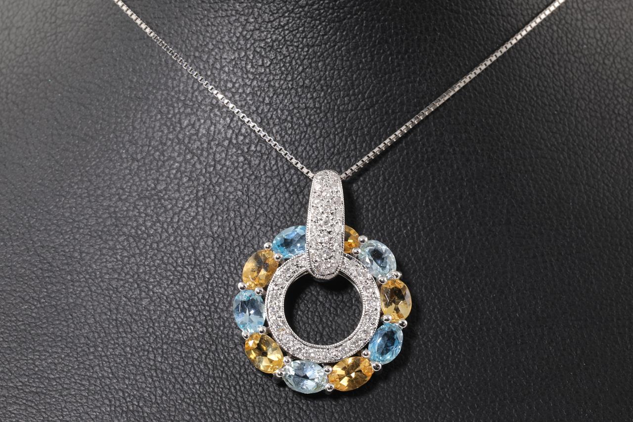 Pendant with oval shape Topaz & Citrine totalling 2.38cts and Diamonds totalling 0.32cts (Estimated grading: G-H SI). 18ct white gold with 44cm adjustable chain. Weight: 8.2g (Pre-owned)
