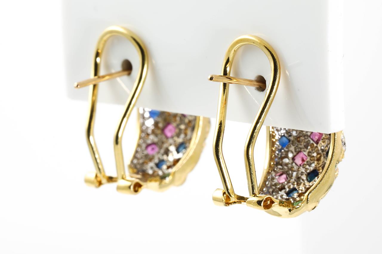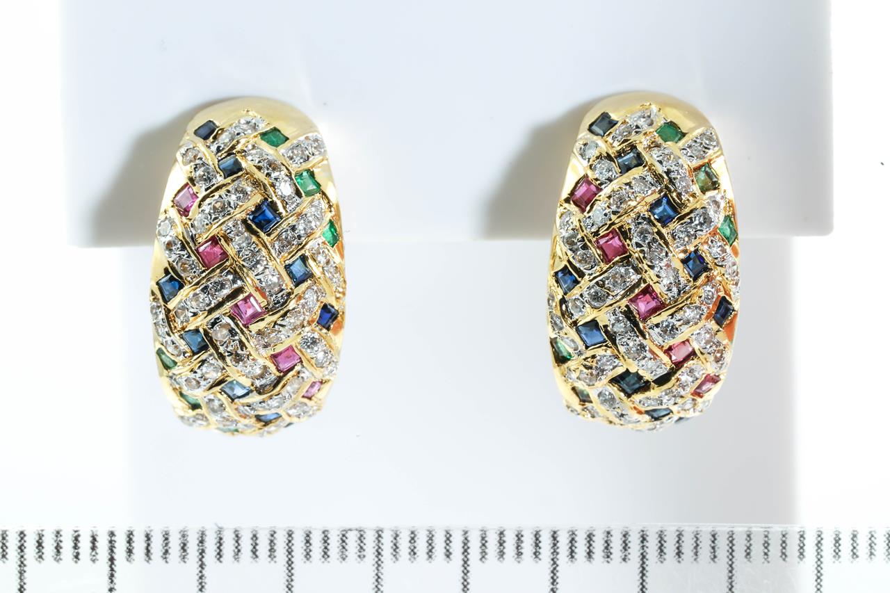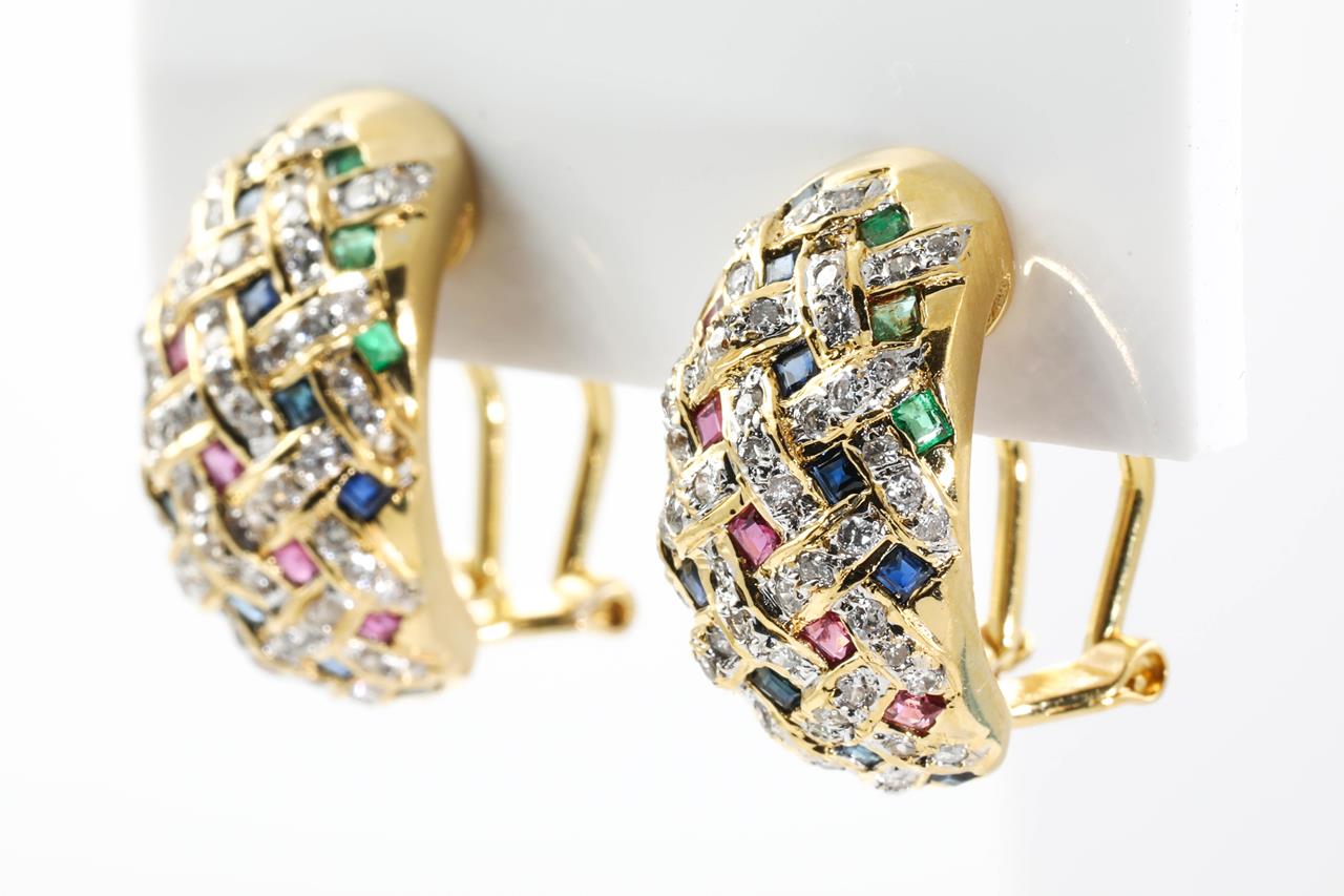 Multi-coloured Gemstone Clip-on Earrings (for pierced ears) with square cut Emerald, Rubies, sapphires and Diamonds totalling approximately 0.35ct (Estimated grading: H-J P2-3). 18ct yellow gold. Weight 10.2g. (Pre-owned)
