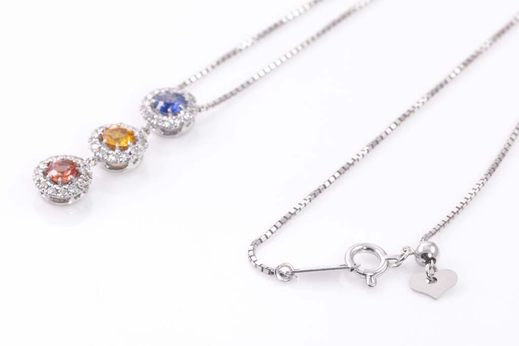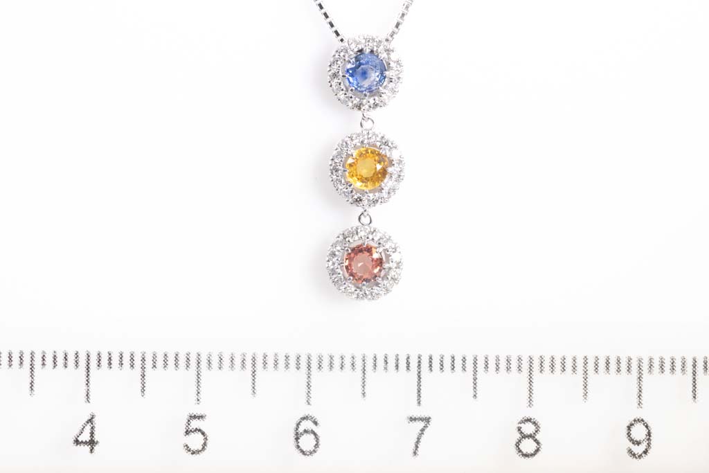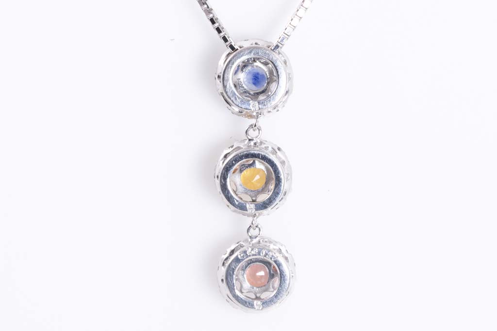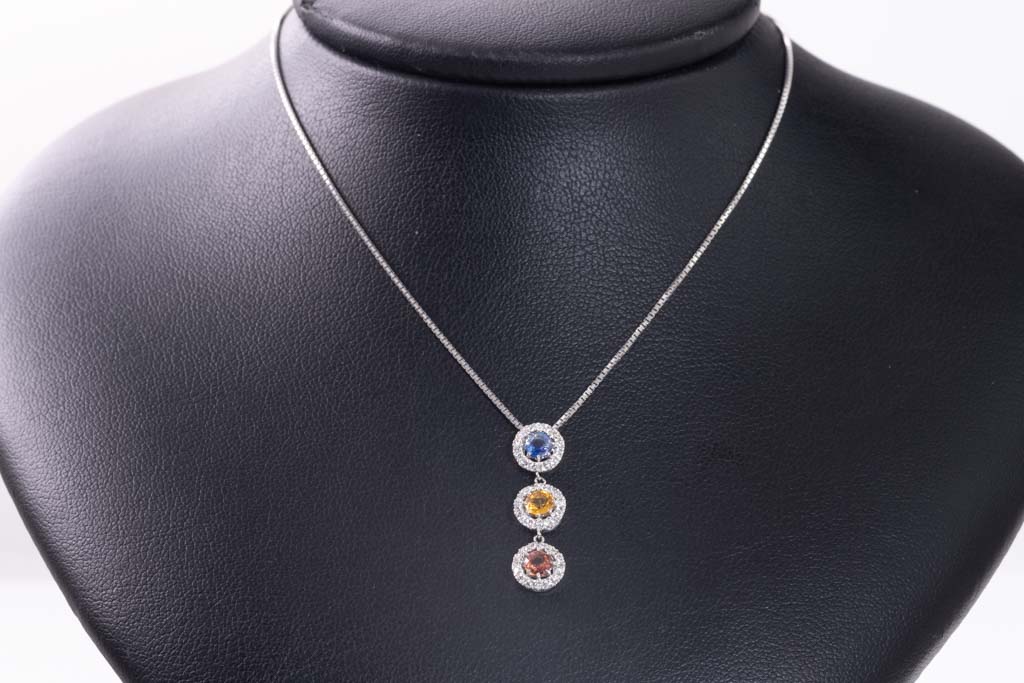 Sapphire and Diamond pendant with multi-coloured round Sapphires totalling 0.73cts and round Diamonds totalling 0.27cts. 18ct white gold with 45cm 18ct white gold adjustable chain. Weight: 4.3g. (Pre-owned)