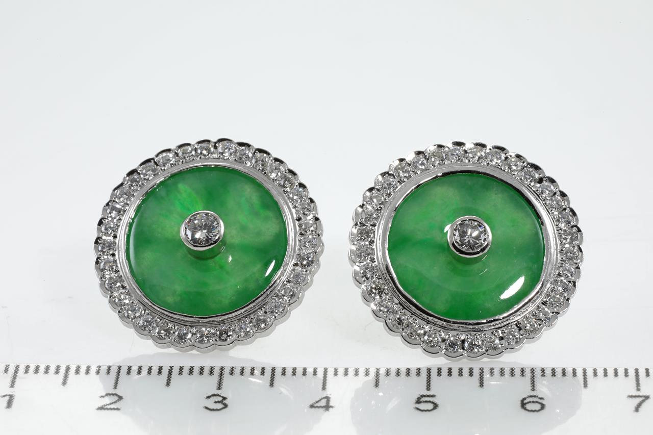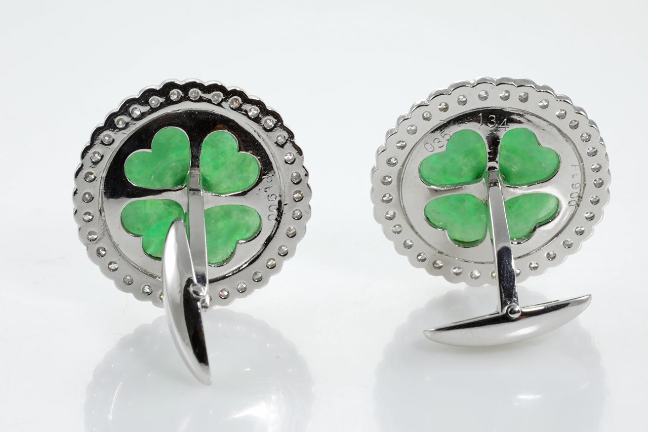 Jade and Diamond cufflinks with free shaped translucent green Natural Jadeite Jade (Type A) totalling 1.34cts and Diamonds totalling 0.35cts (Estimated grading: G VS). 18ct White gold and Platinum. With Gem Identification certificate. Weight: 17.7g (As new)