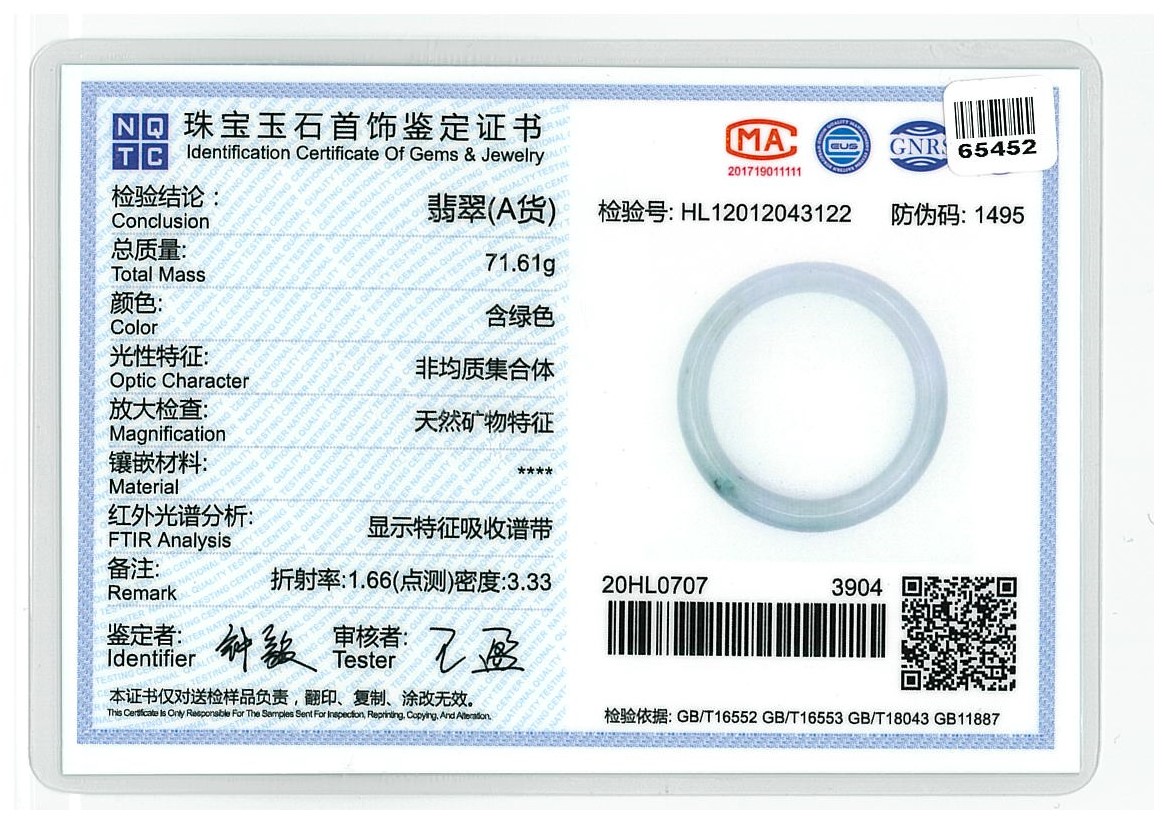 Natural Jade Bangle, light green Type A Jadeite. Circumference 18.5cm. With Gem report. Weight 71.6g. (Pre-owned)
