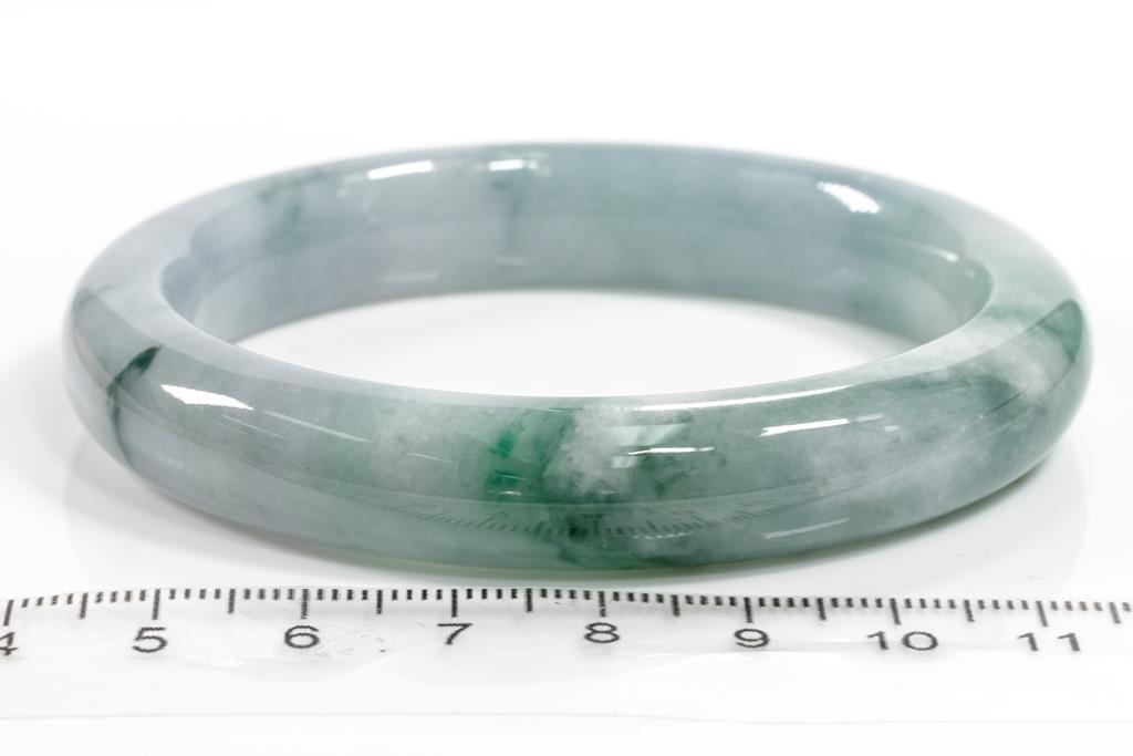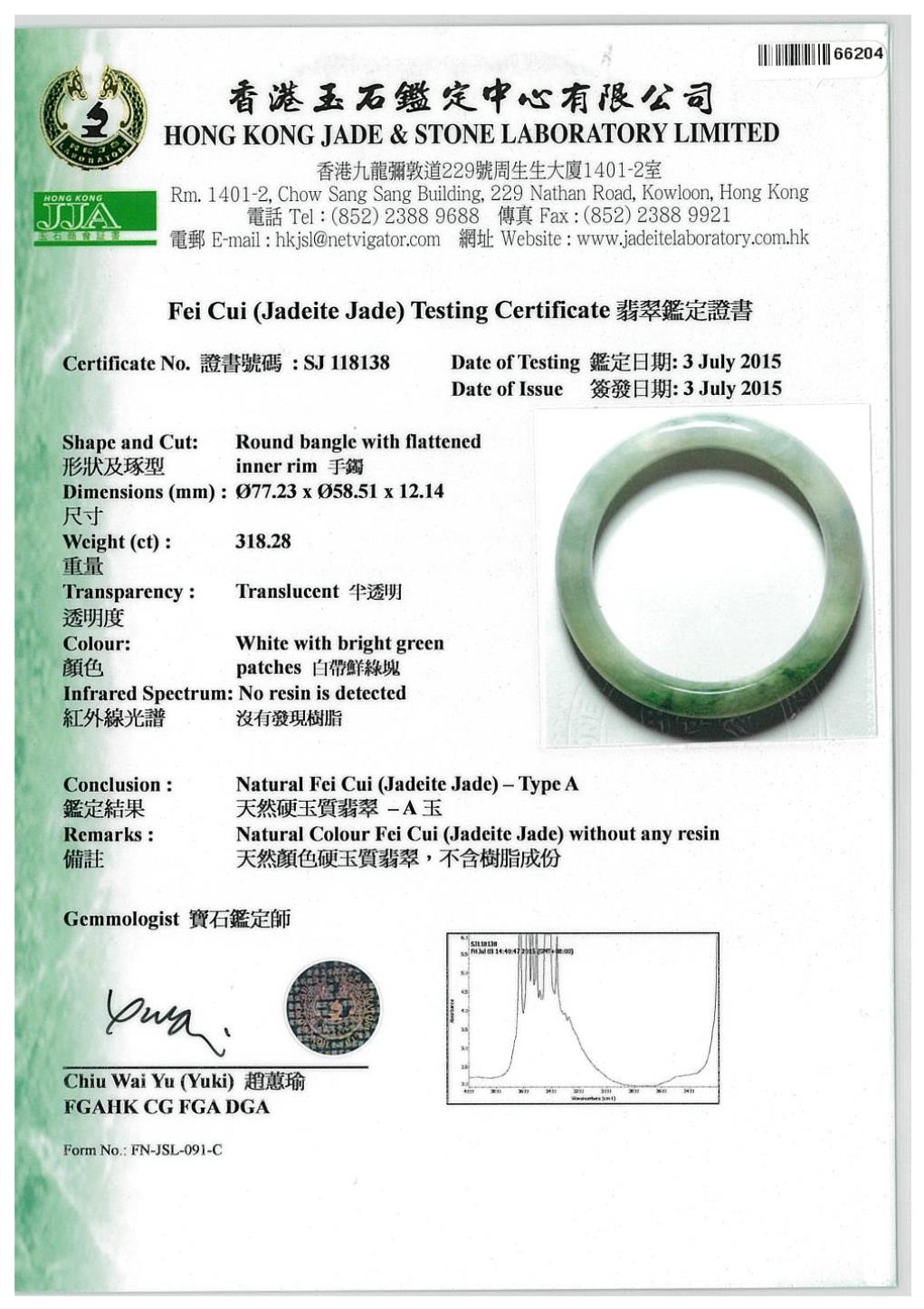 Jade Bangle with translucent white with bright Green patches Natural Fei Cui (Jadeite Jade) - Type A. With Fei Cui Testing Certificate. Diameter: 5.8cm. (As New)