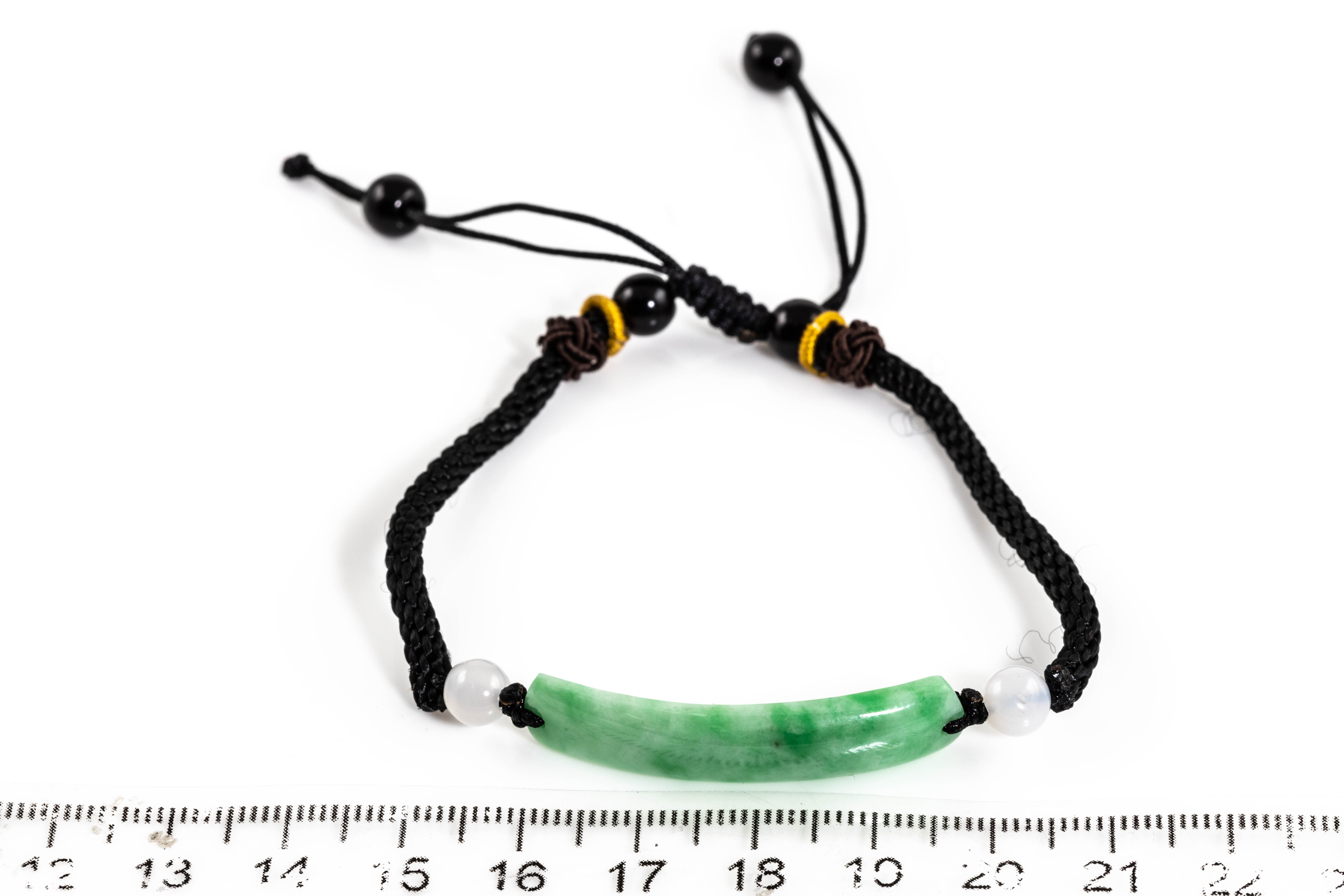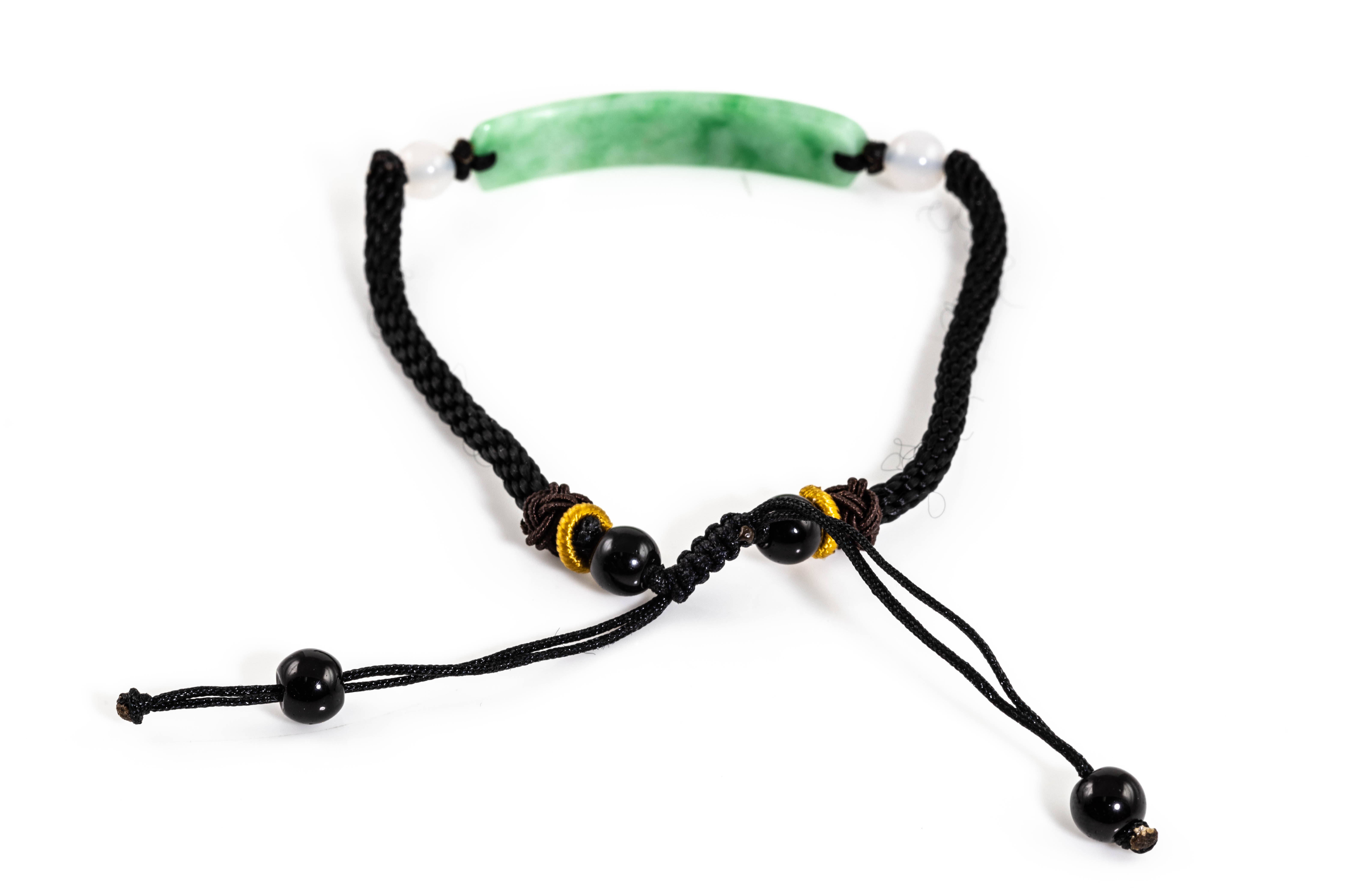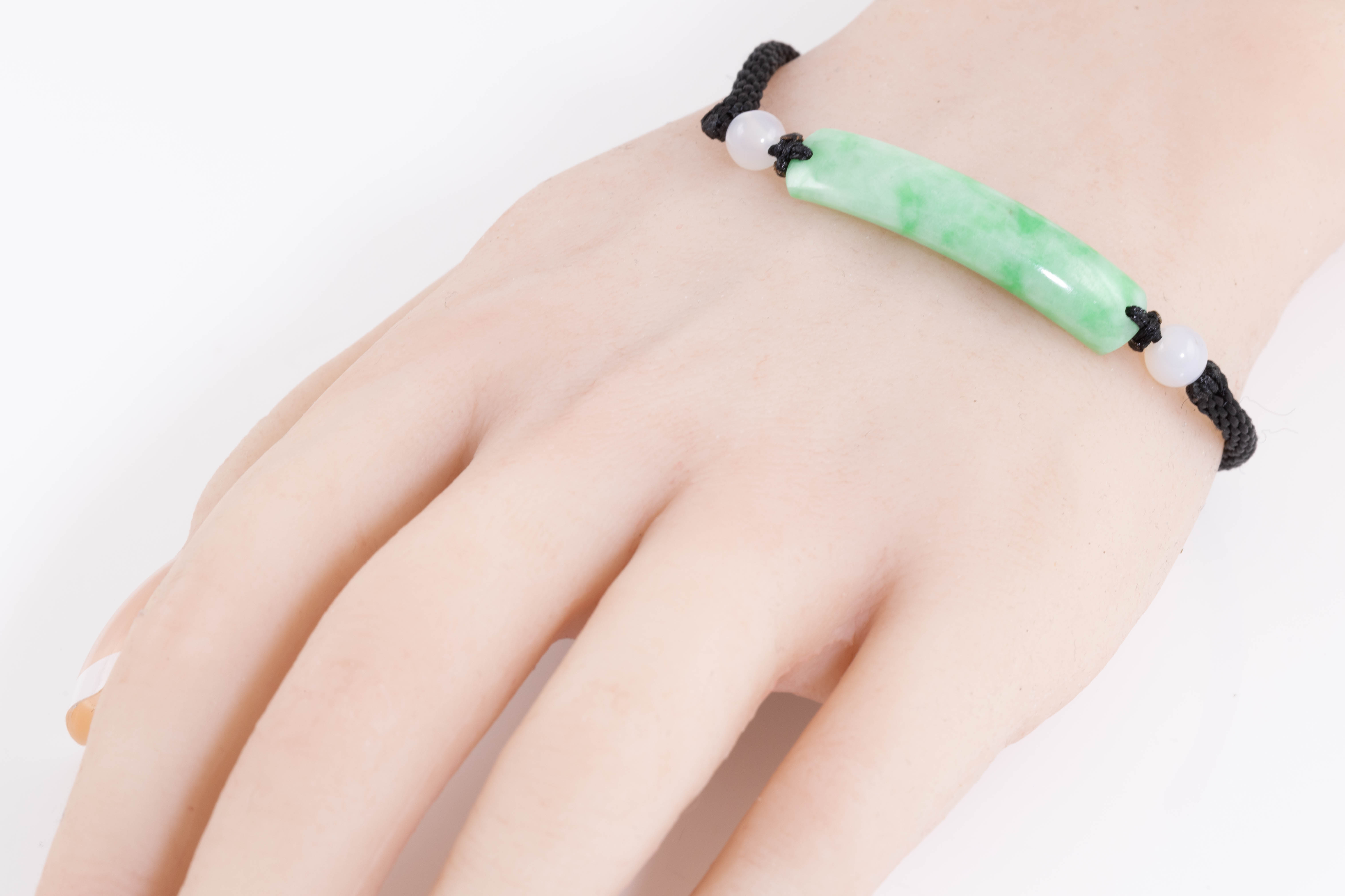 Natural Jade Jadeite Bracelet with free form light green Jade Jadeite type A (with gem report), on braided cord. Circumference 18-28cm. Weight 5.2g. (As New)