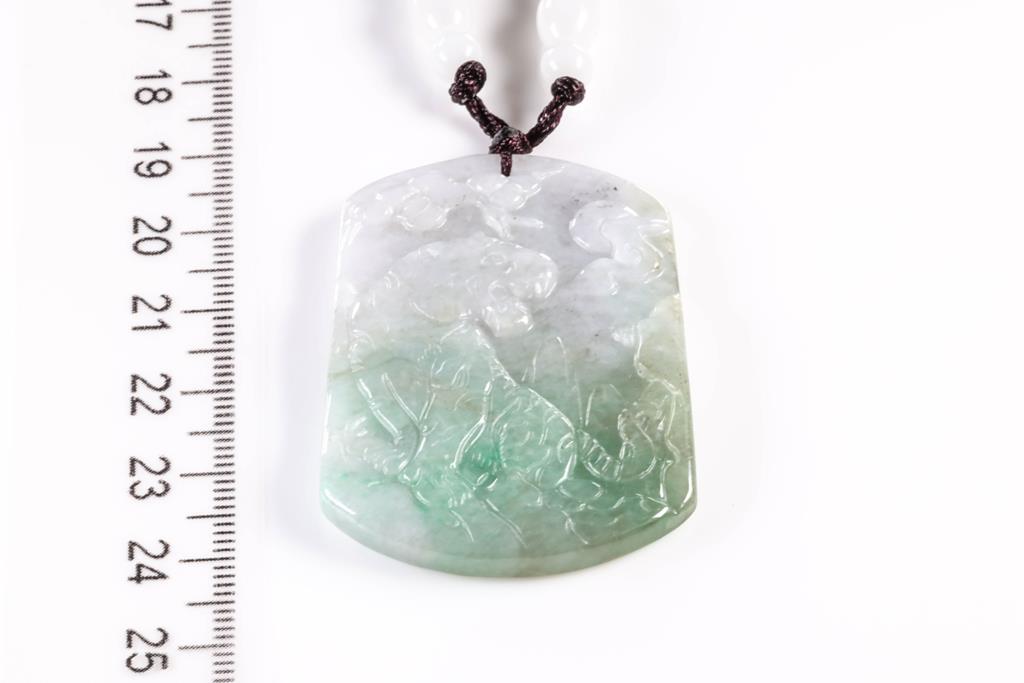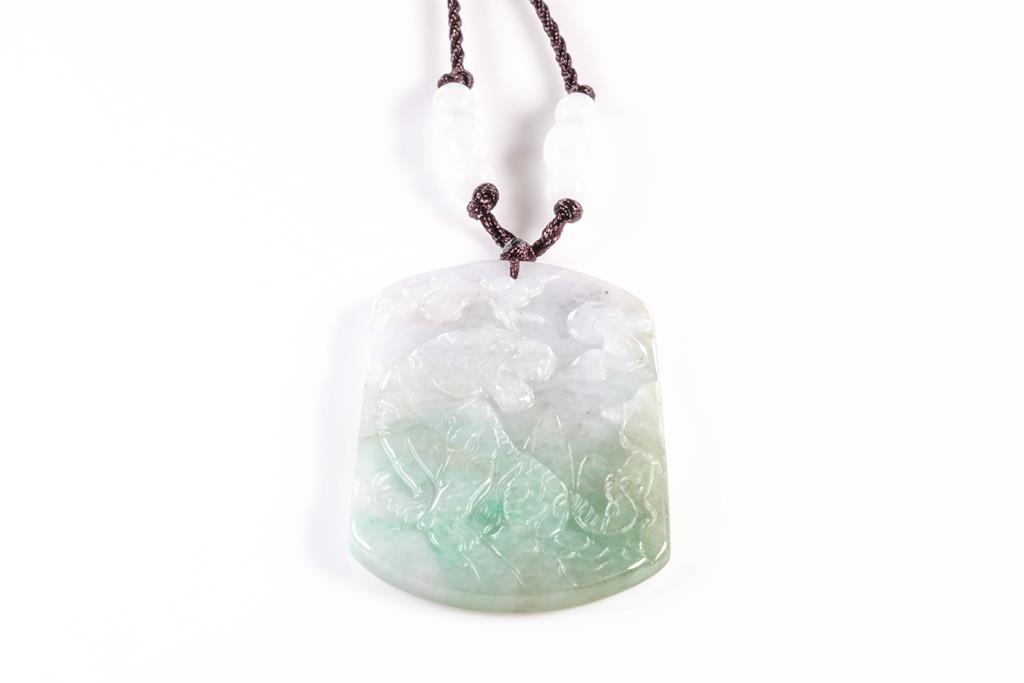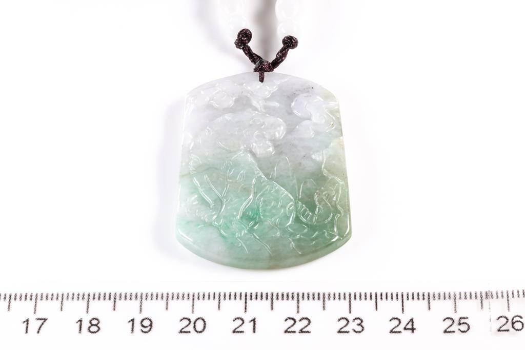 Jade Pendant with carved landscape translucent green-white Natural Jade - Type A. With Gem Testing Report #Y2806140539. Size: 4.8cm x 3.4cm. On adjustable cord, maximum approximate length 29cm, approximate full circumference 58cm. (As New)
