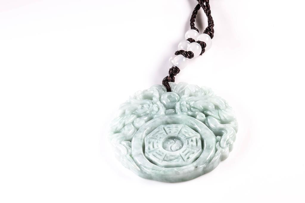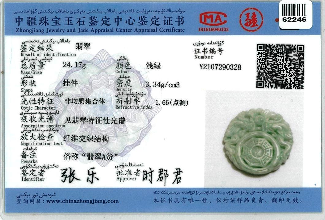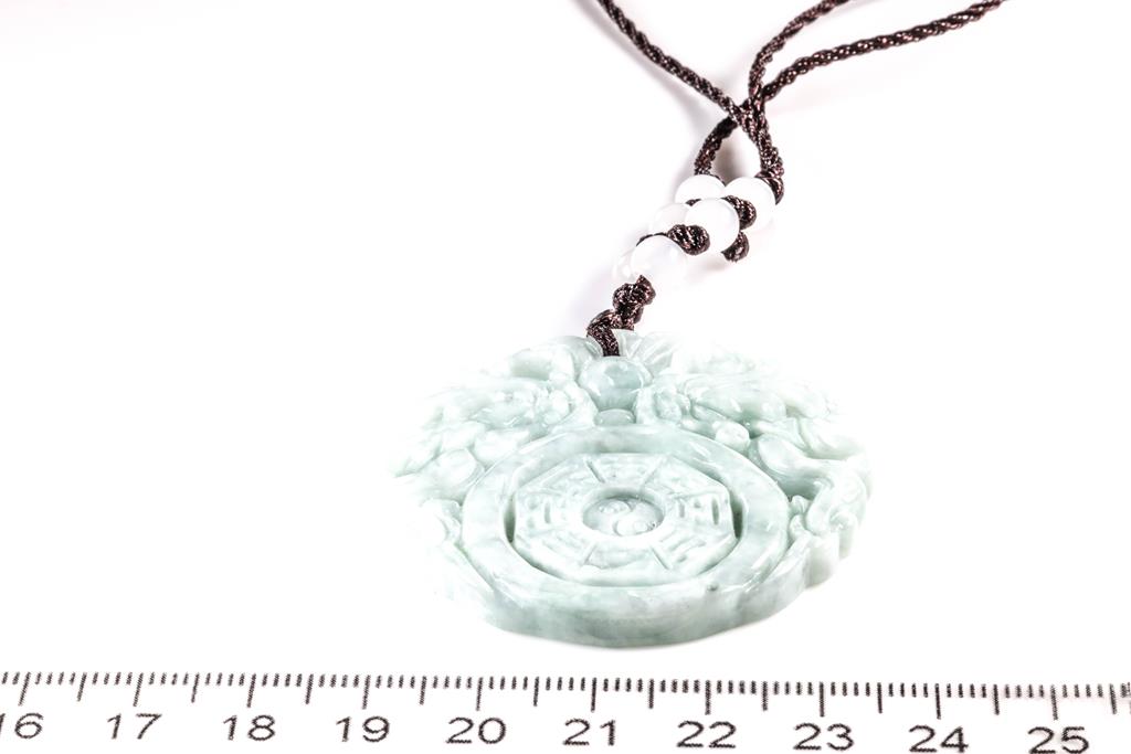 Jade Pendant with carved disc translucent green-white Natural Jade - Type A. With Gem Testing Report #Y2107290328. Diameter 4.5cm. On cord. (As New)