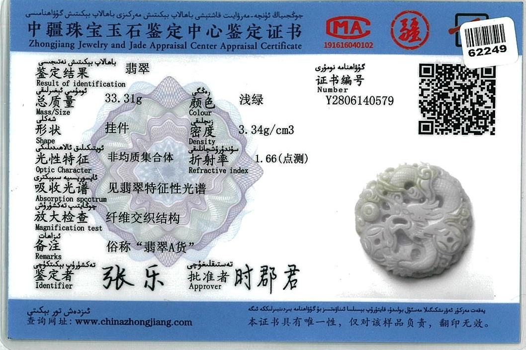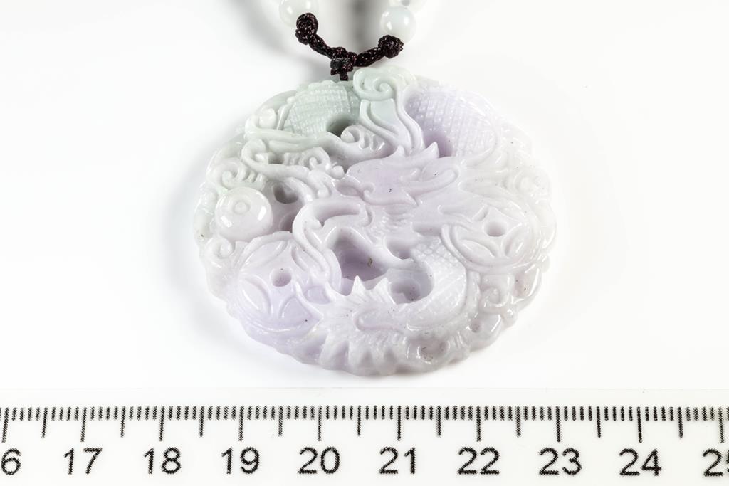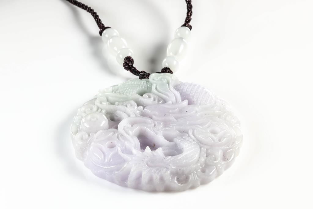 Jade Pendant with carved dragon translucent green-lavender Natural Jade - Type A. With Gem Testing Report #Y2806140579. Diameter 4.7cm. On cord. (As New)