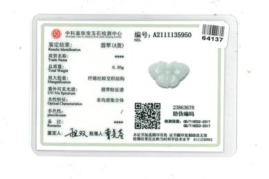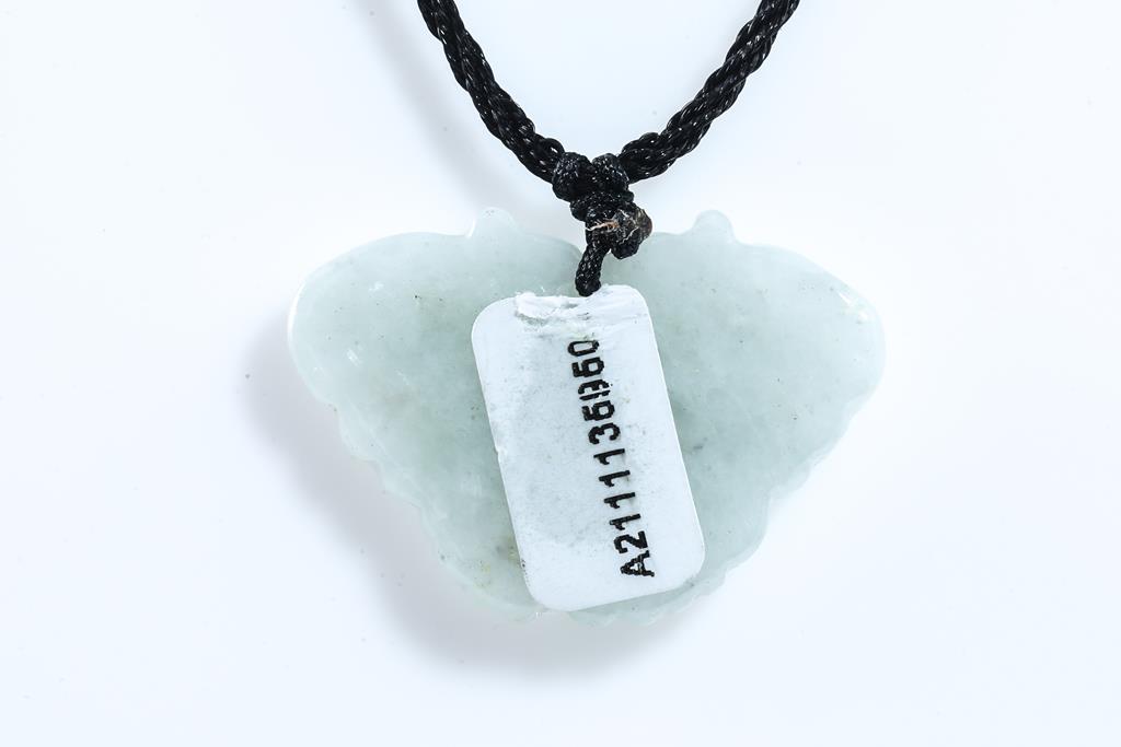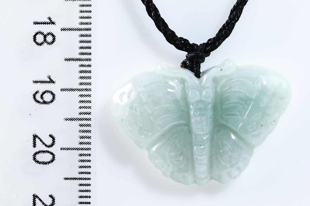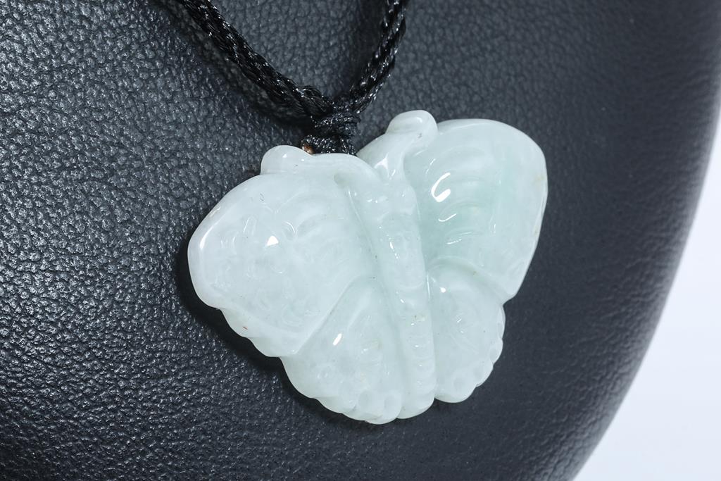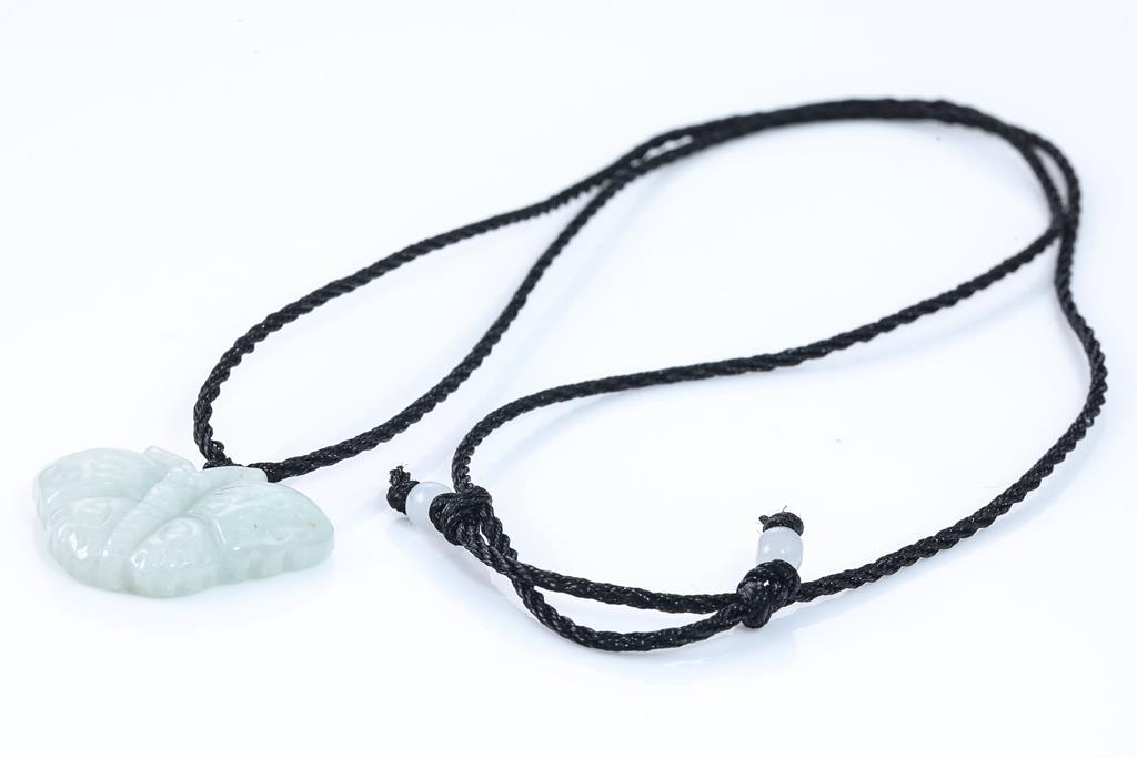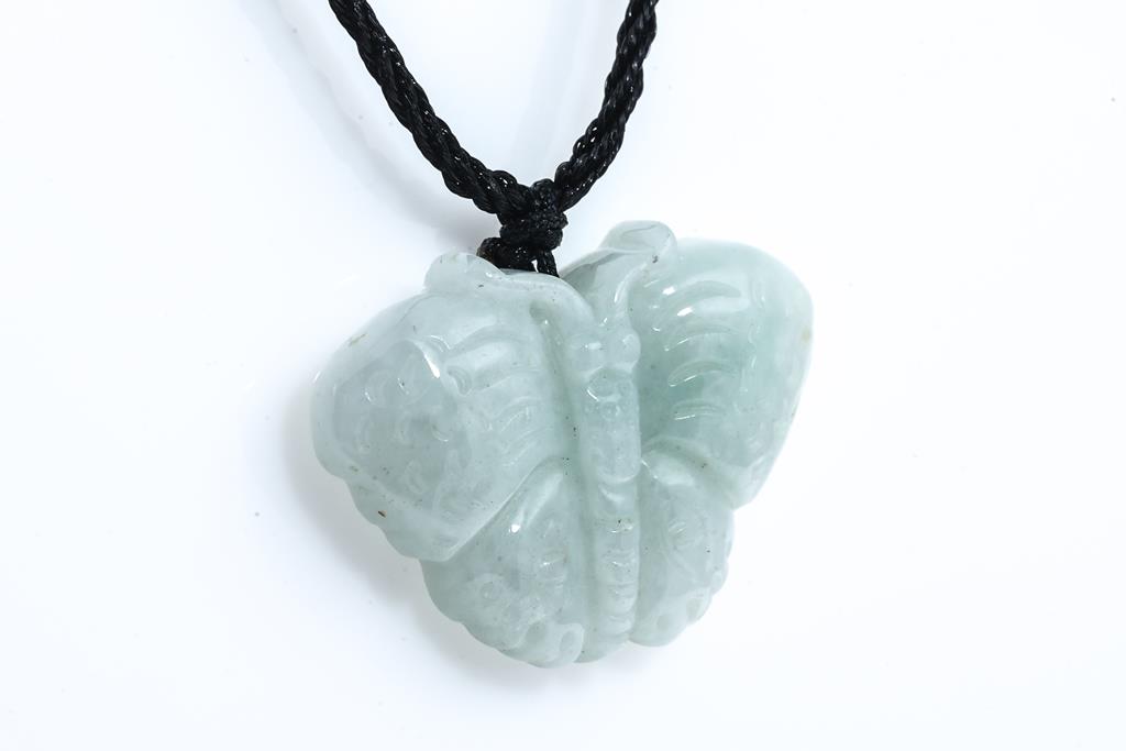 Jade Pendant with carved butterfly translucent green-white Natural Jade - Type A (with Gem Testing Report). Length 3cm. On cord. (As New)