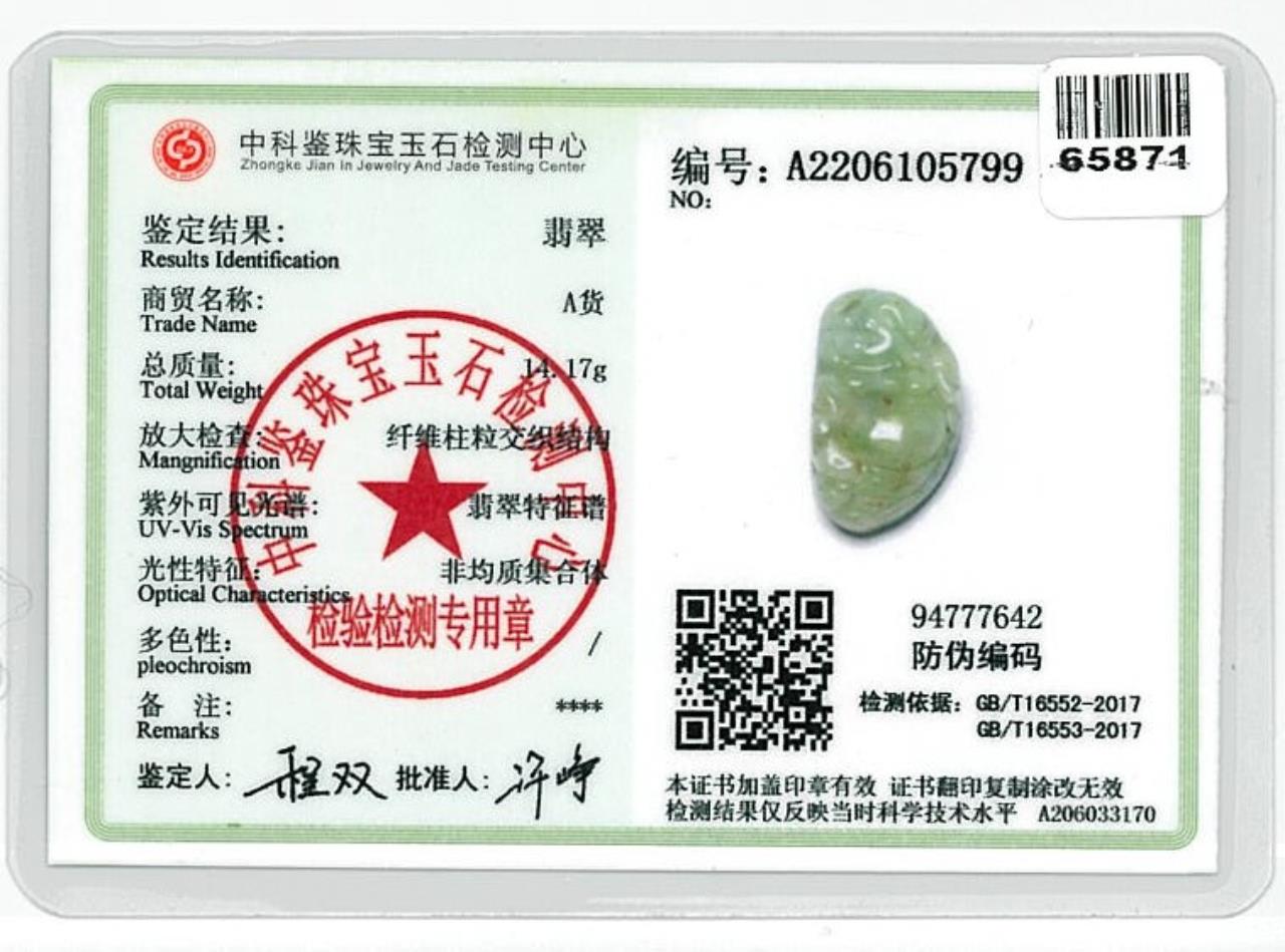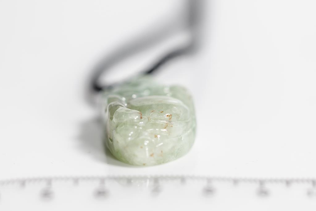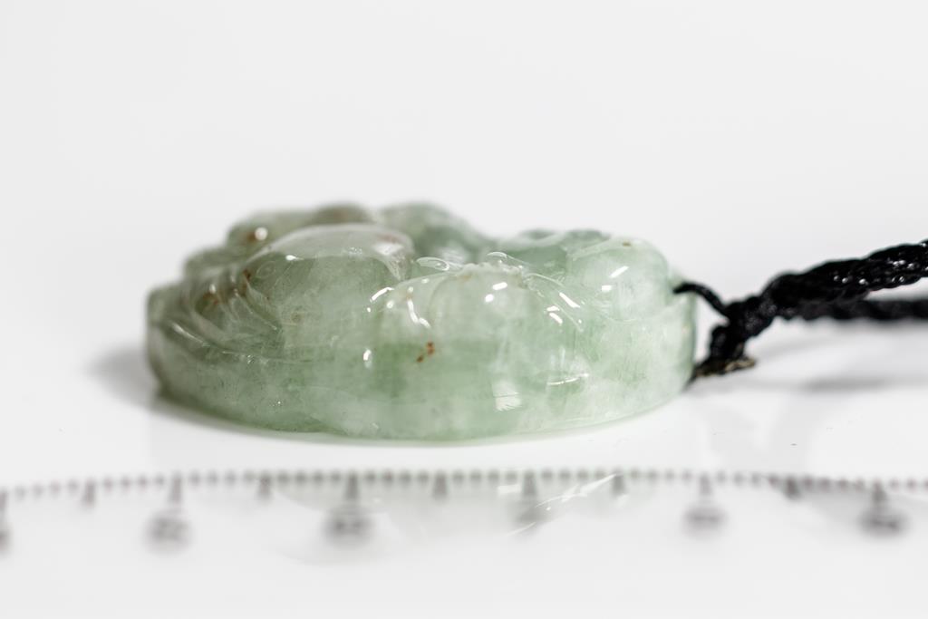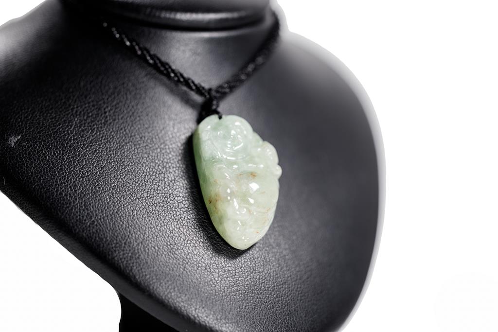 1843 Natural Jade Pendant carved with a lying Buddha. Light green Jadeite, Type A. Weight 15g. With gem report. On cord, adjustable Length 44cm. (Pre-owned)