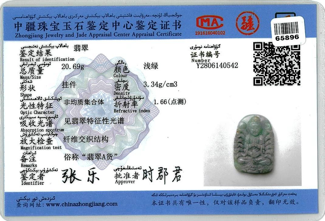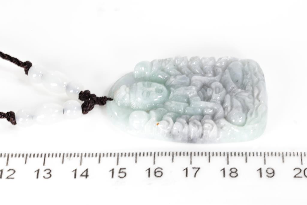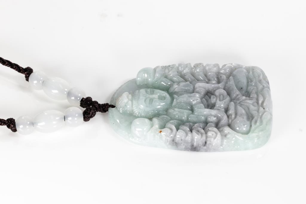 Natural Jade Pendant shaped as a carved sitting Buddha, light green and lavender Jadeite, type A. Weight 22g. With gem report. On cord adjustable, length 44cm. (Pre-owned - little chip)