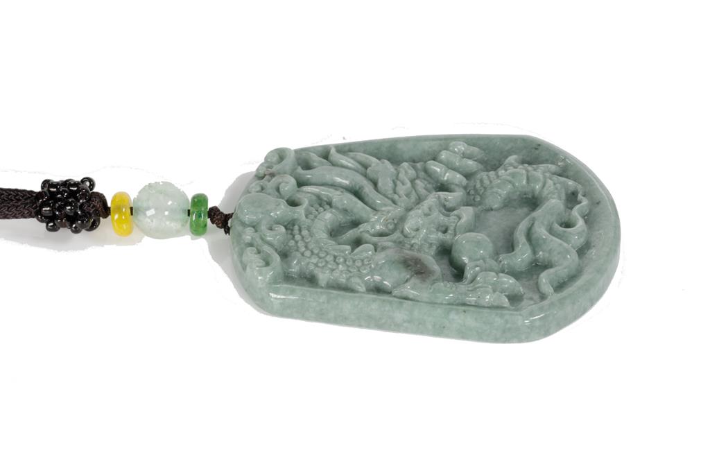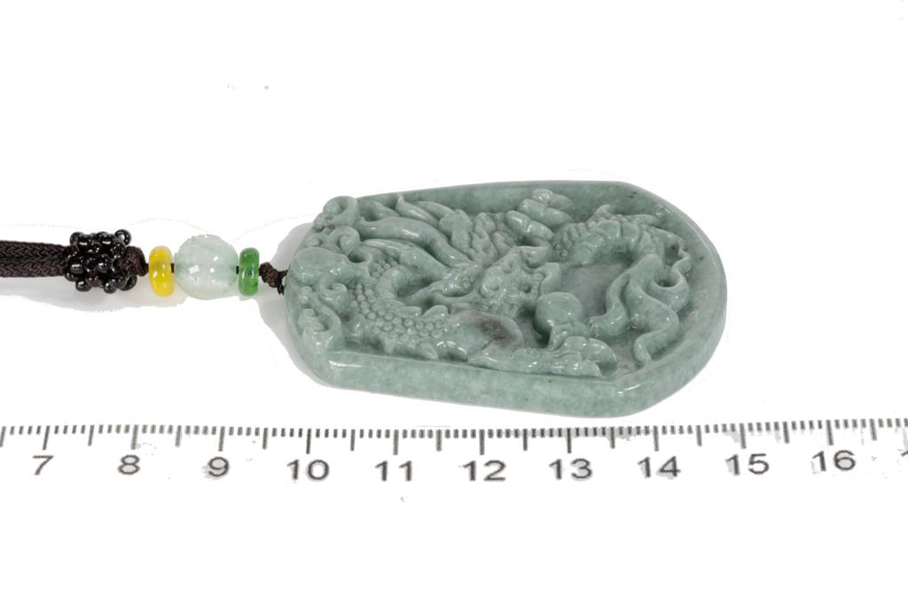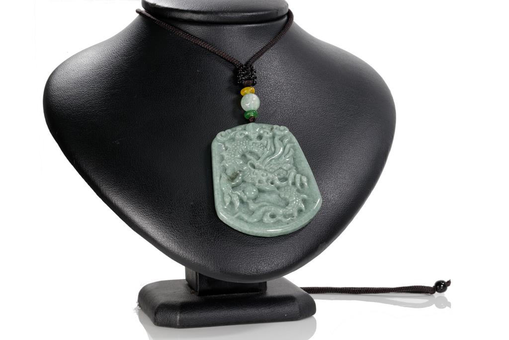 1843 Natural Jade Pendant shaped as a carved dragon, green Jadeite, type A. Weight 29g. With gem report. On cord adjustable, length 68cm. (Pre-owned)