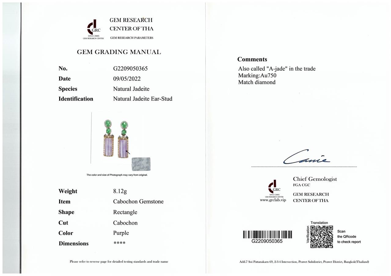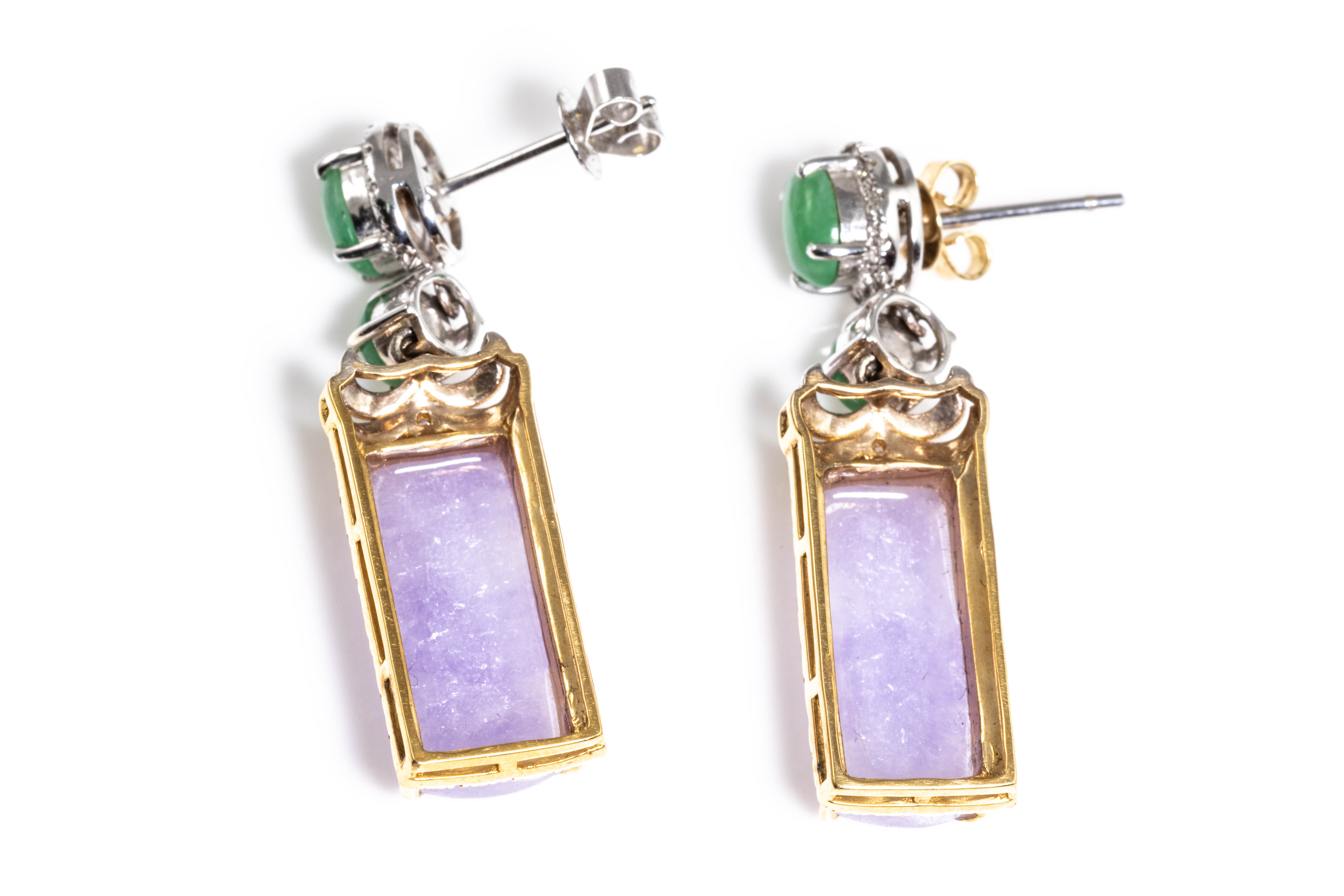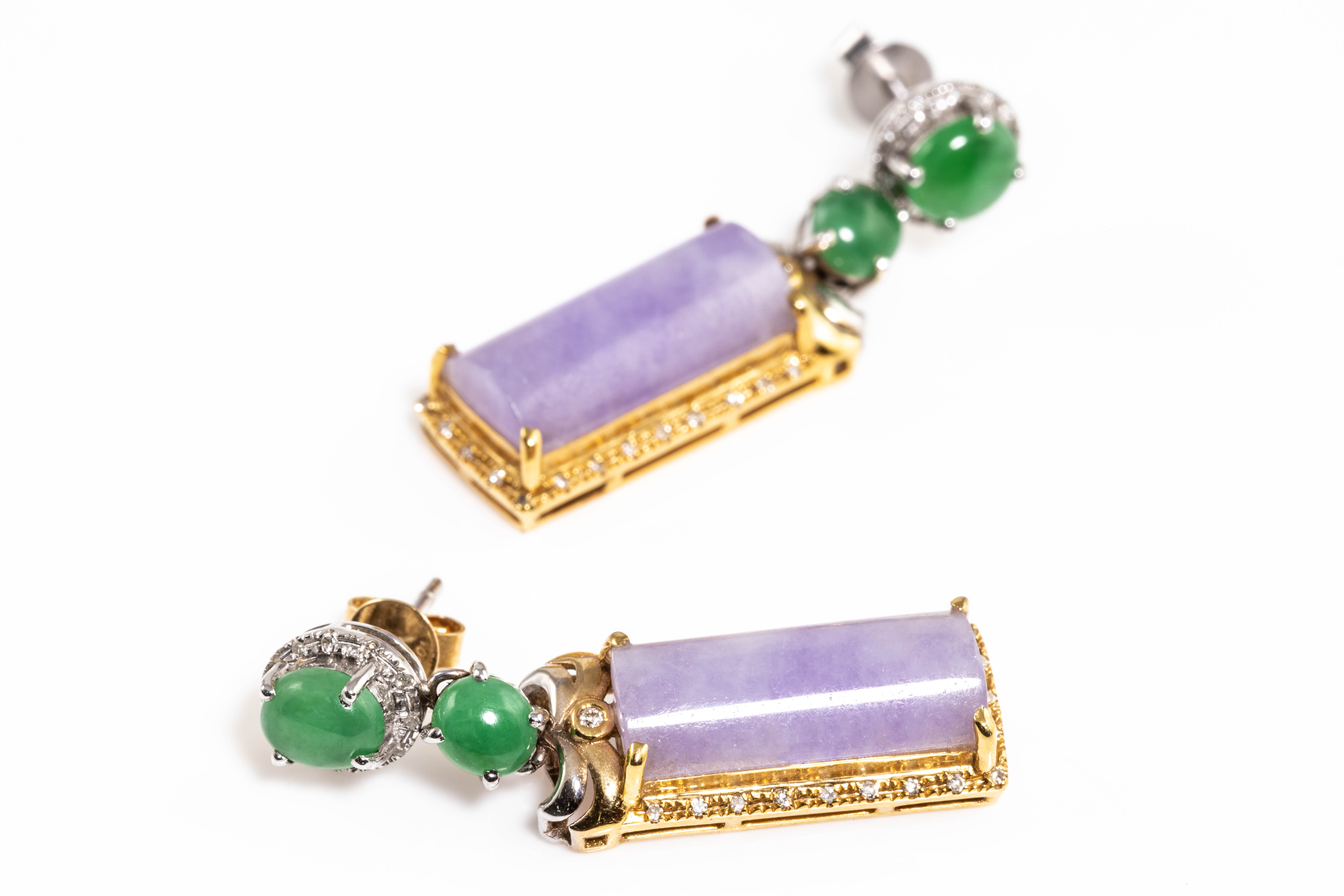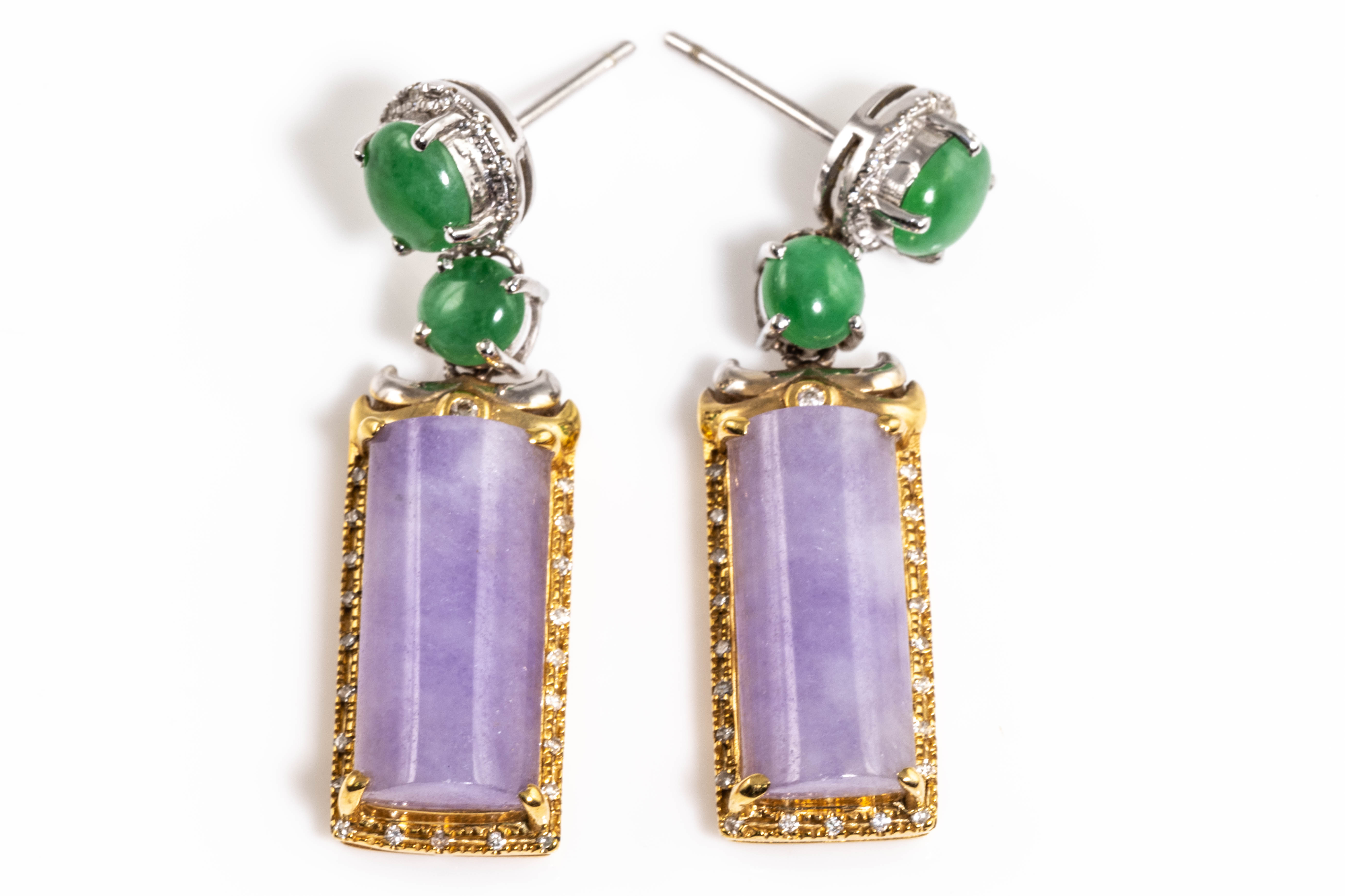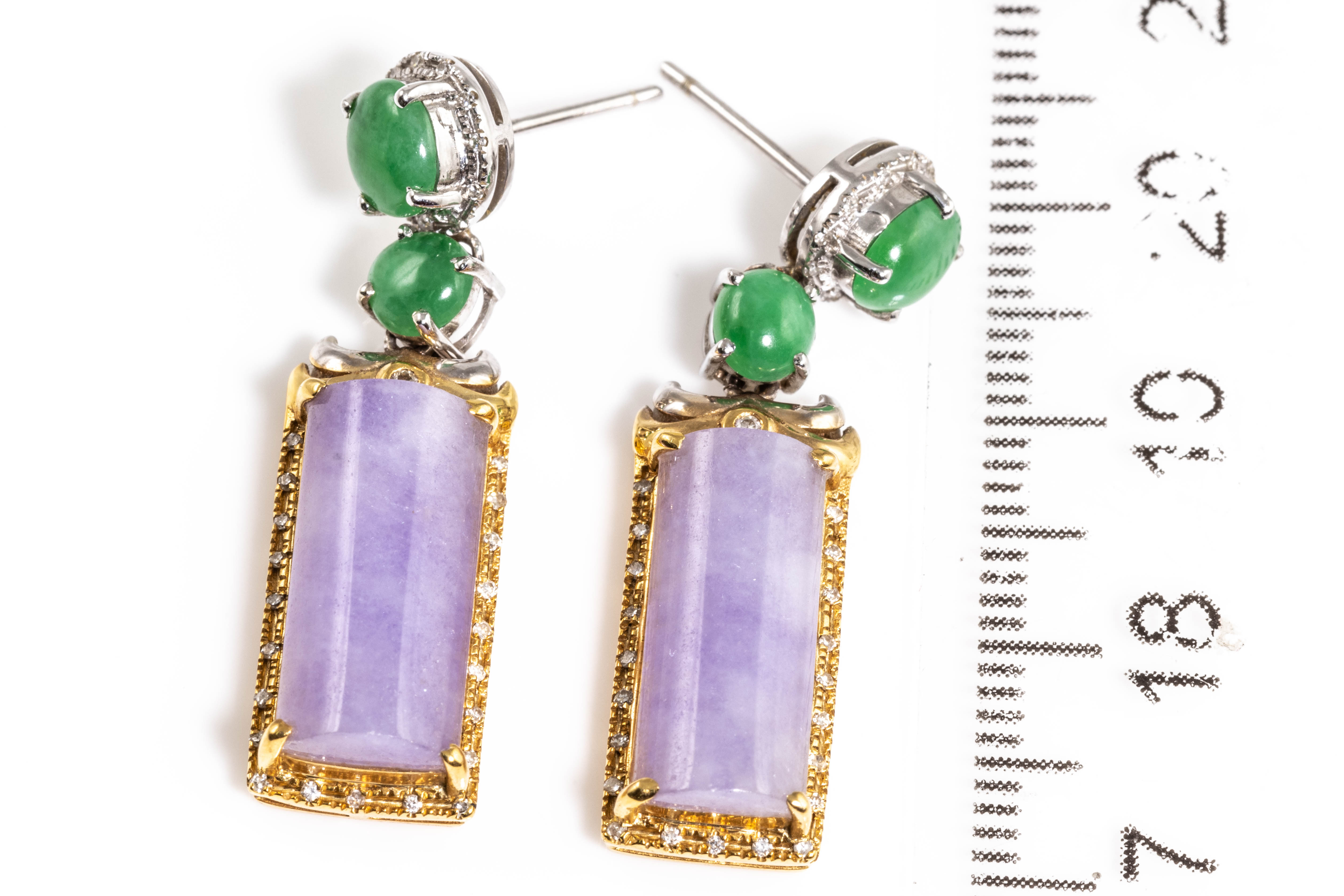 Natural Jade Drop earrings with Lavender Jadeite Jade - type A (with Gem report #G2209050365) and 4 cabochon cut green Jade and round Diamonds totalling approximately 0.06cts. 18ct white and yellow gold. Weight 8.1g. (As New)