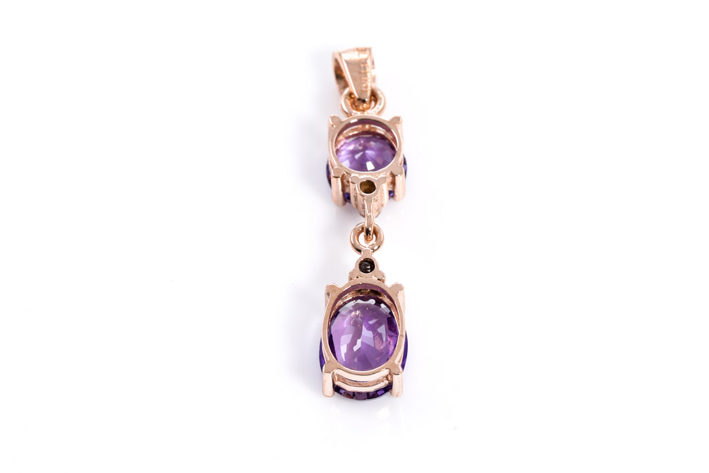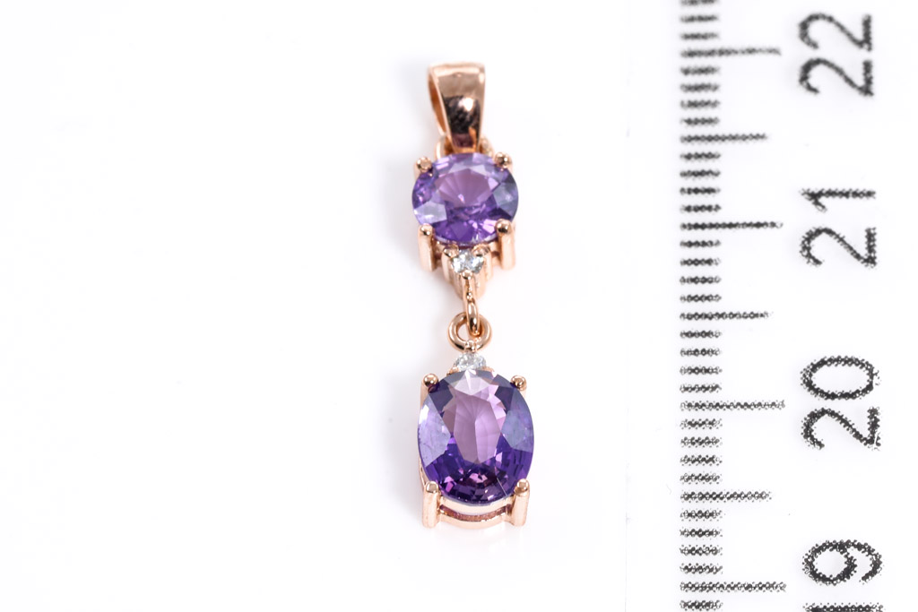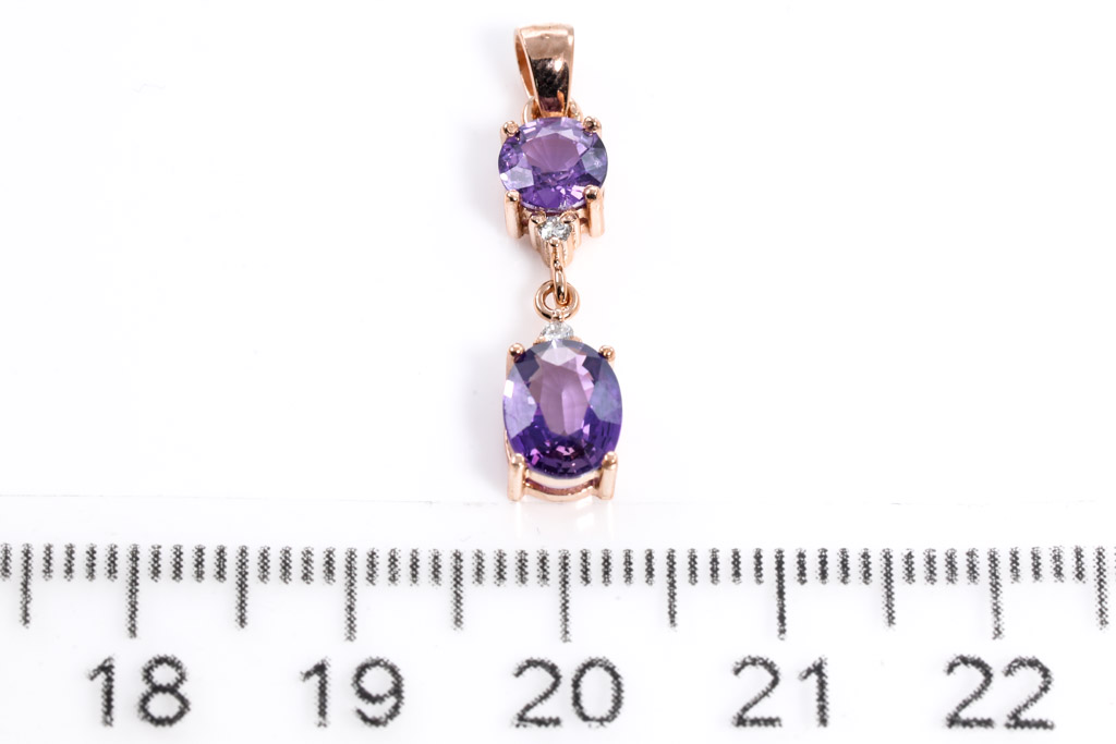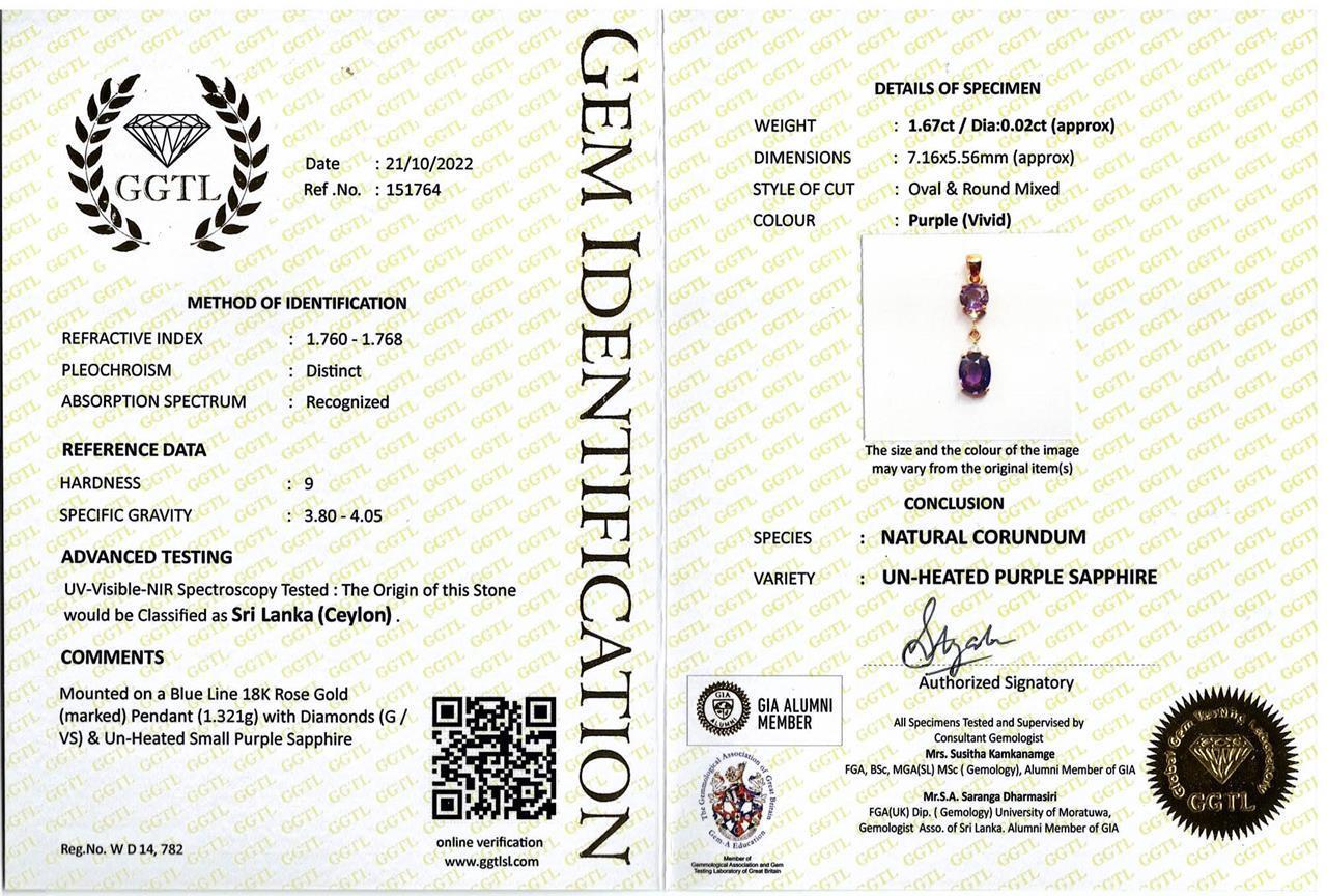 Natural Sapphire Pendant with two oval cut purple unheated Sapphires totalling approximately 1.67cts and Diamonds totalling approximately 0.02ct. With gem report. 18ct rose gold. No chain provided. Weight 1.3g. (As new)