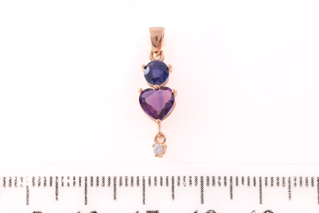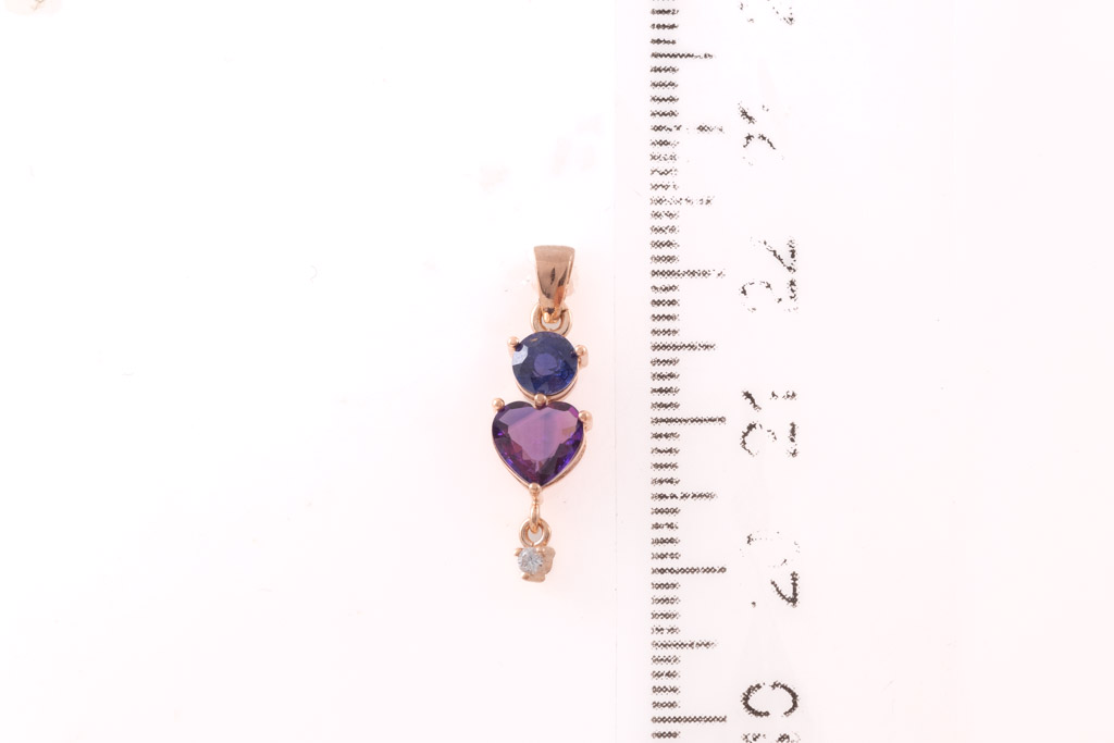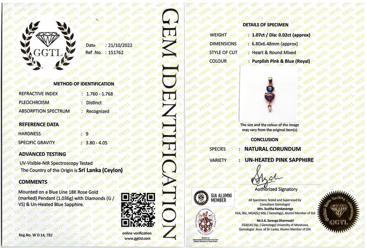 Natural Unheated Sapphire Pendant with heart shaped deep purplish-pink Sapphire of approximately 0.84ct and blue unheated round Sapphire of approximately 0.23ct and Diamond of approximately 0.02ct (With gem report). 18ct rose gold. Weight 1.0g. No chain supplied. (As New)