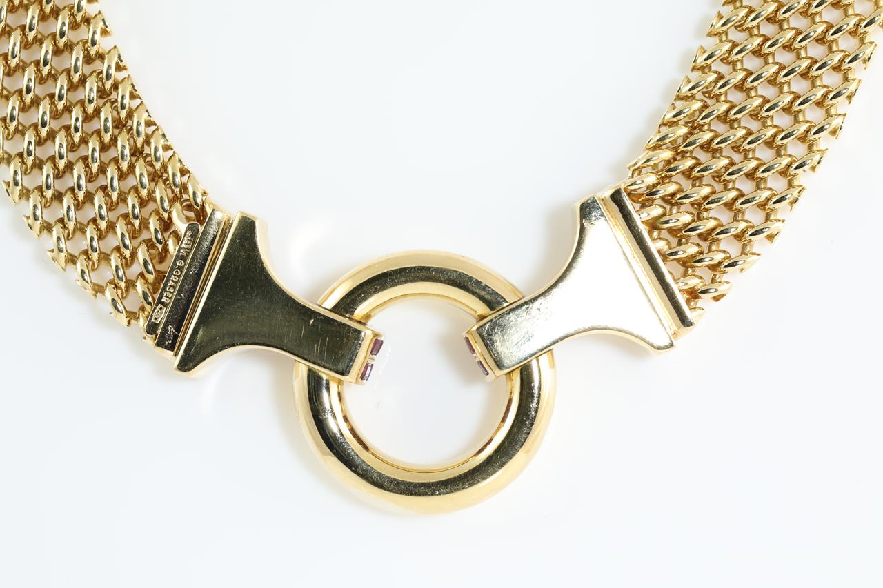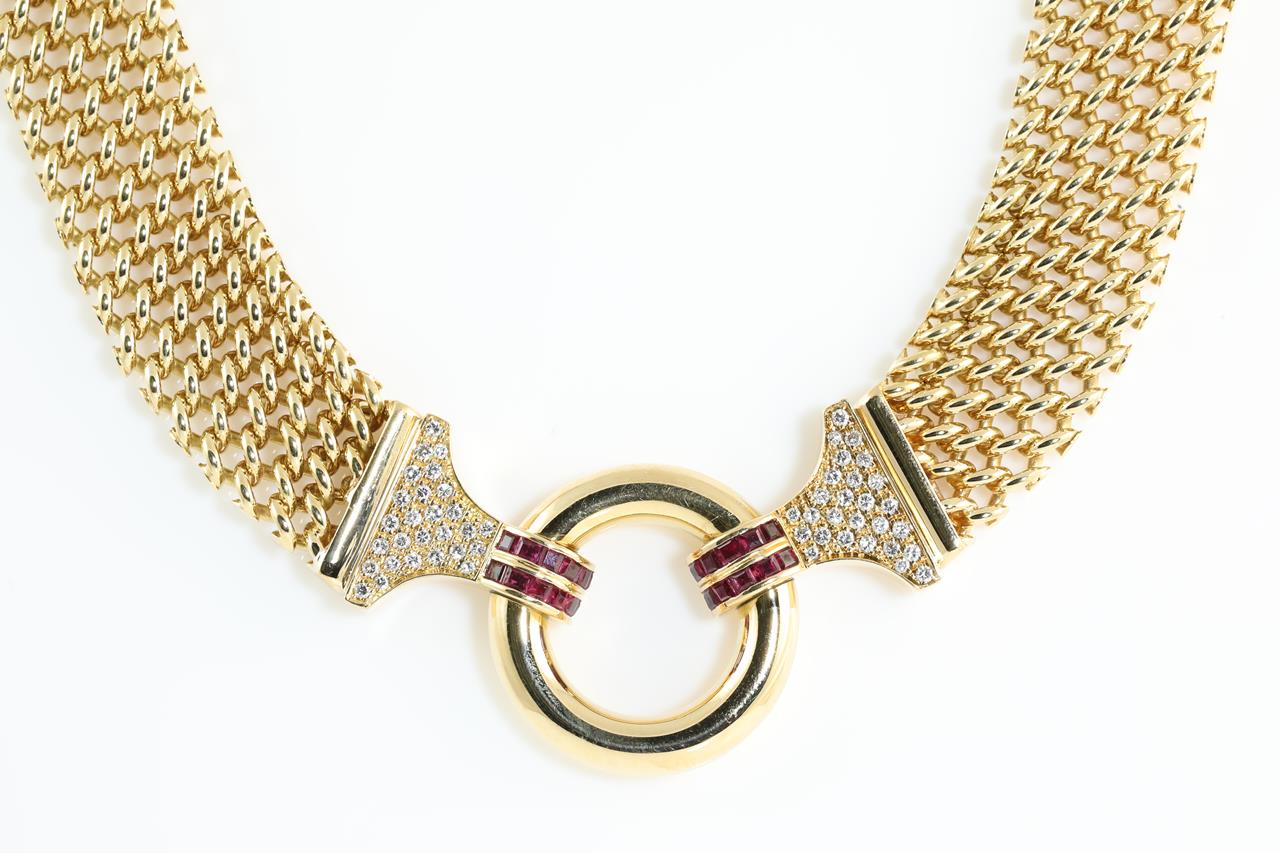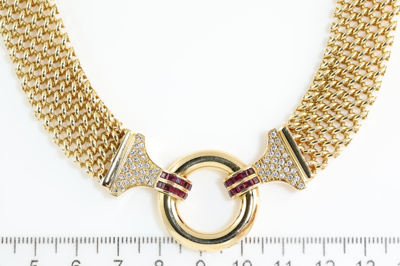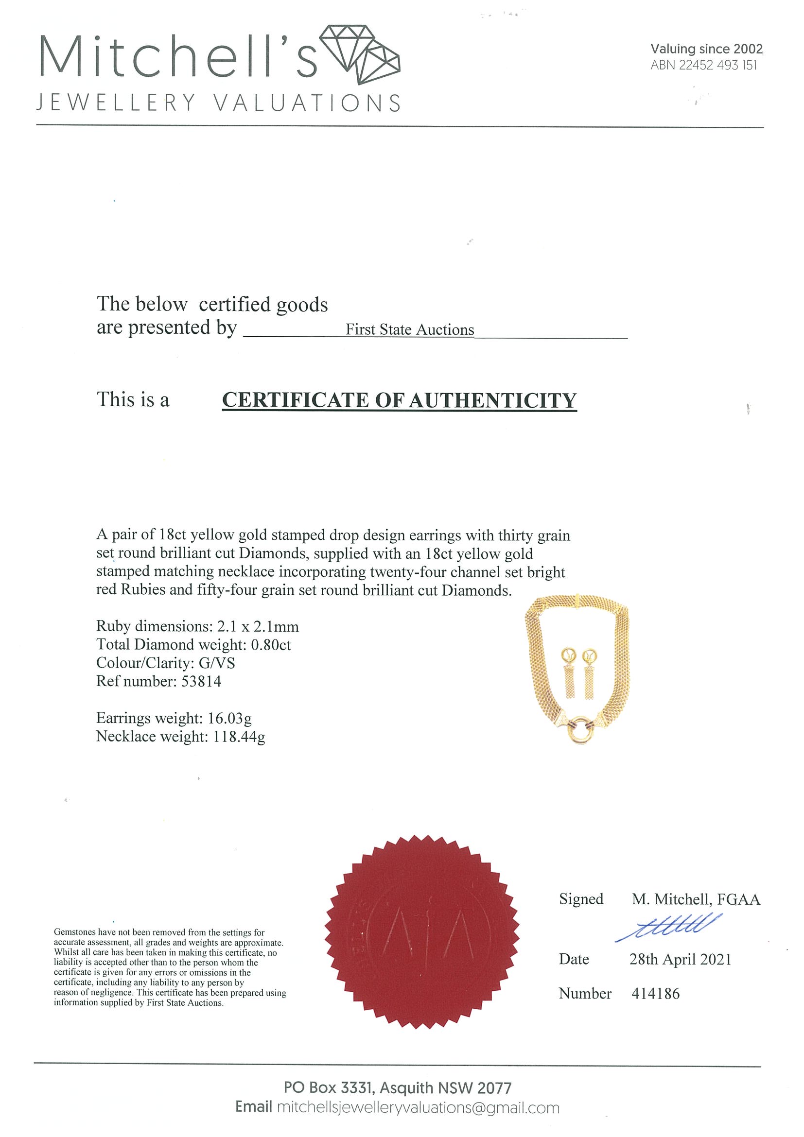 18ct yellow gold necklace & clip-on earring set with Diamonds totalling 0.80cts (Estimated grading: G VS) & carre cut Rubies. Total weight: 134.4g. Length: 44cm. With certificate #414186. (Pre-owned)