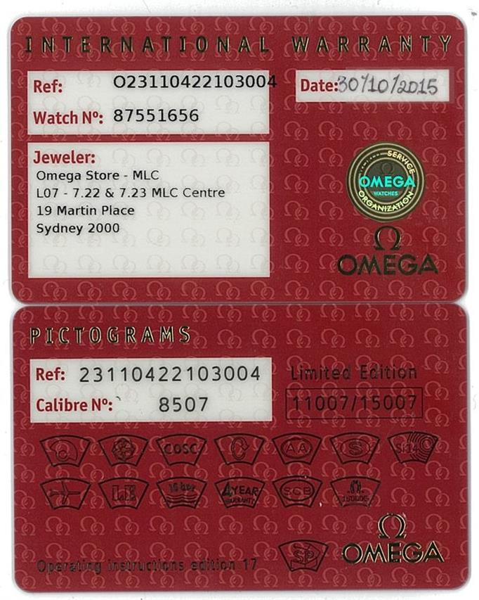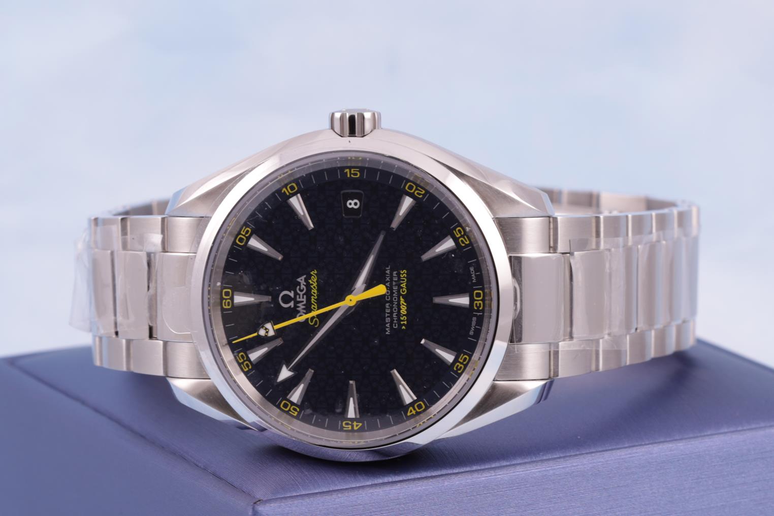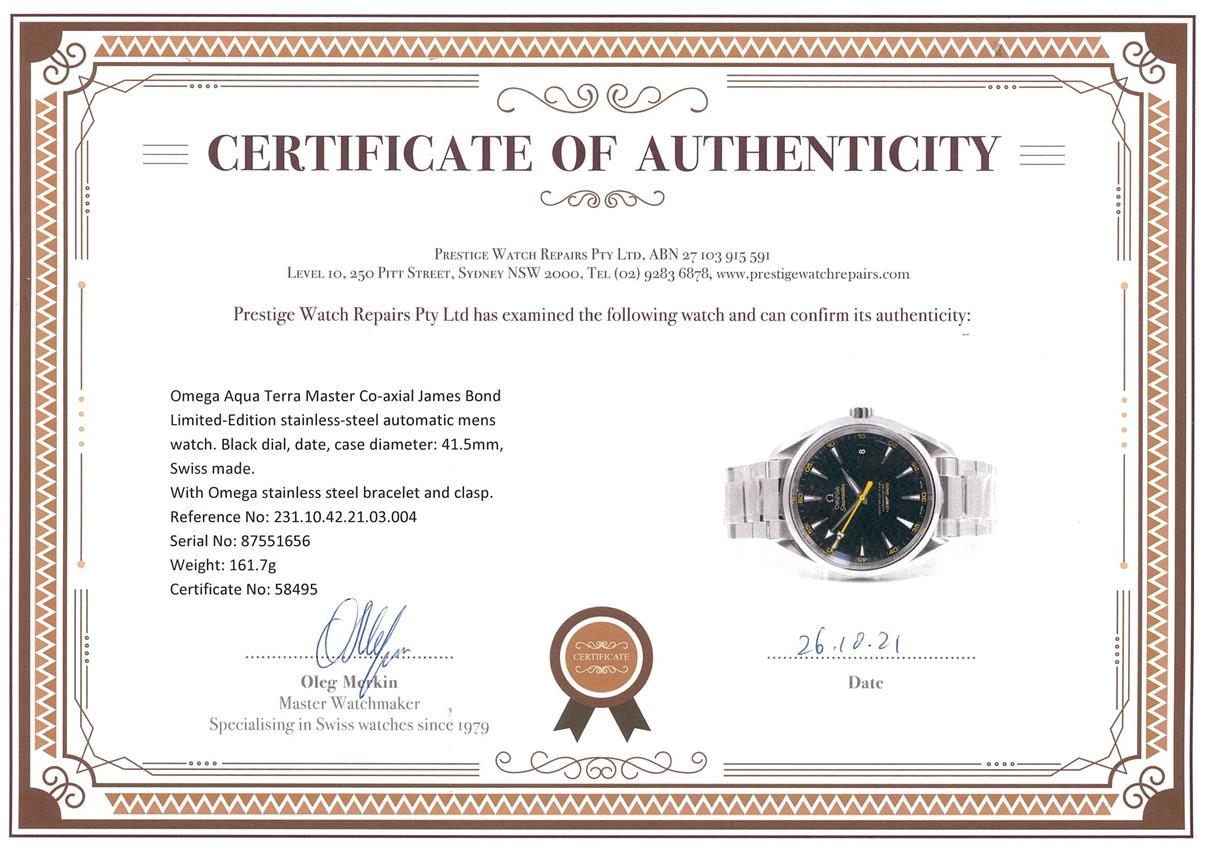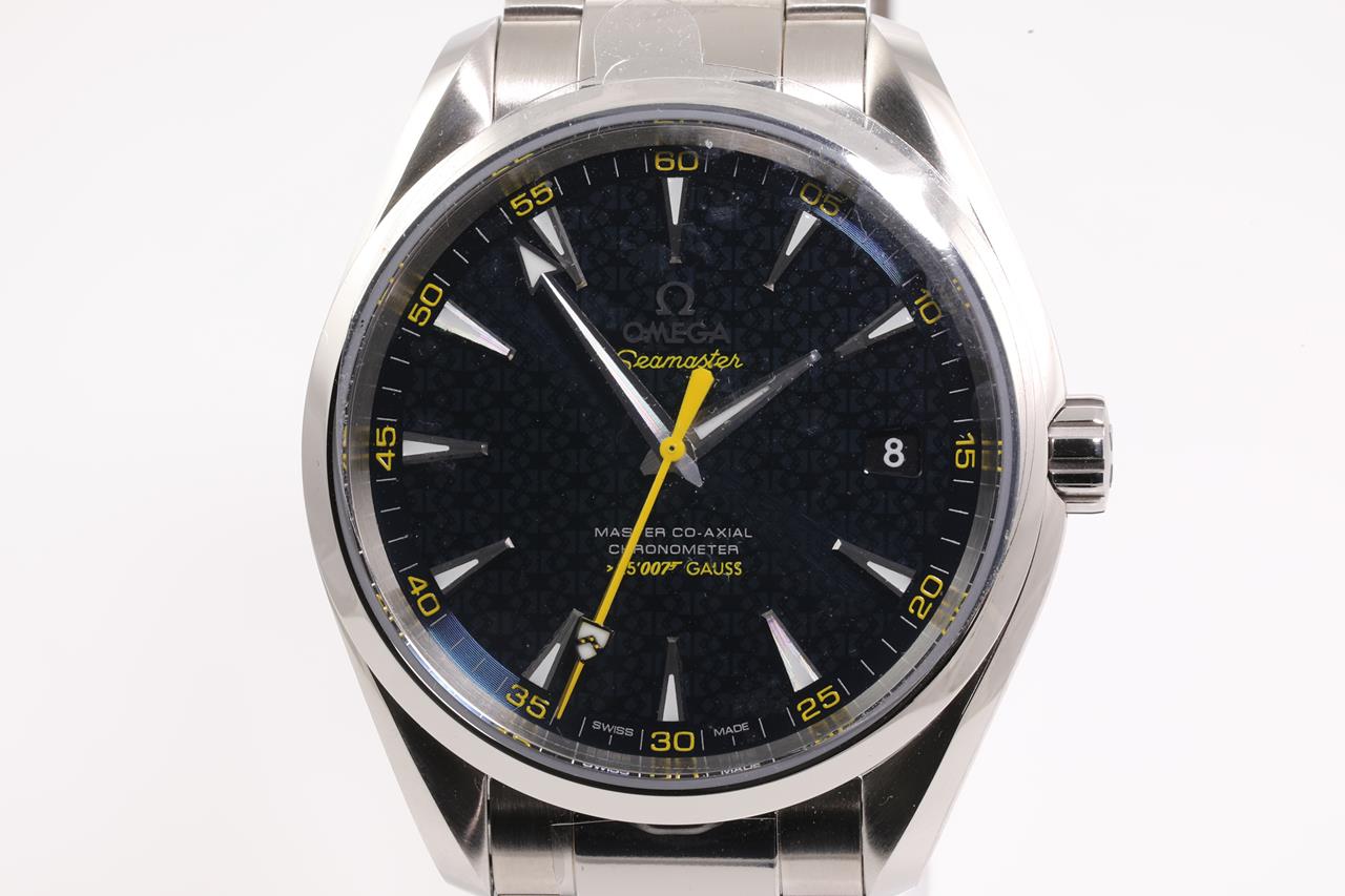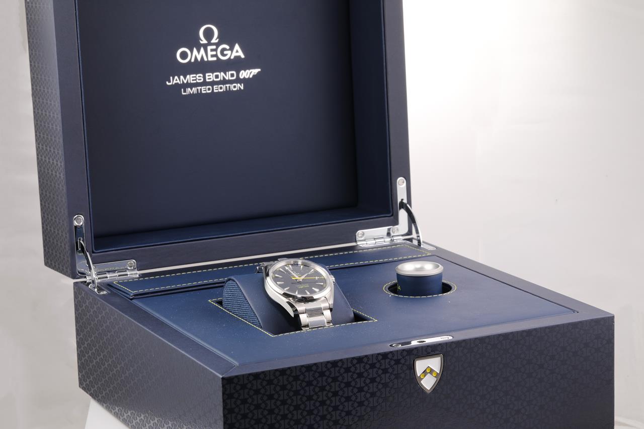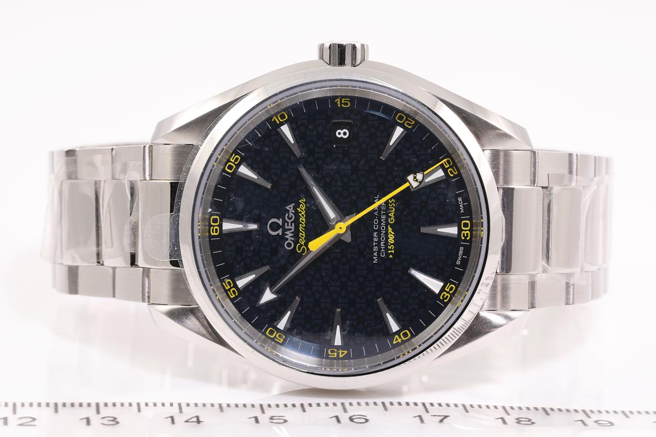 Omega Aqua Terra Master Co-axial James Bond Limited Edition of 15007 stainless steel automatic mens watch. Blue dial, date, case diameter: 41.5mm, wrist size: 20.5cm, Swiss made. Ref# 231.10.42.21.03.004. With Omega stainless steel bracelet and clasp. With Certificate of Authenticity, Omega International warranty card dated 30/10/2015, pictograms card, two Omega notebooks and Omega box. 3 month FSA warranty. (Pre-owned)