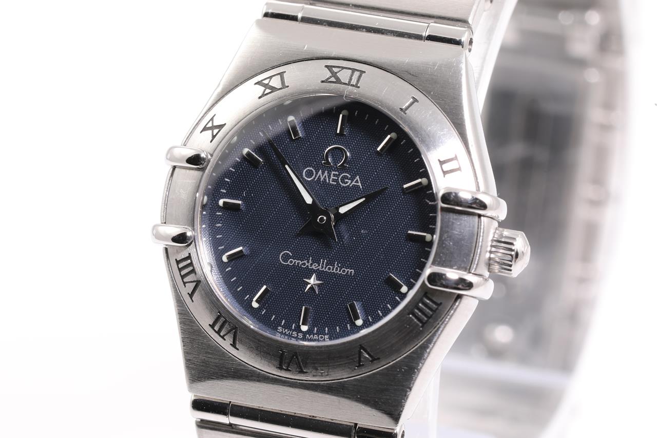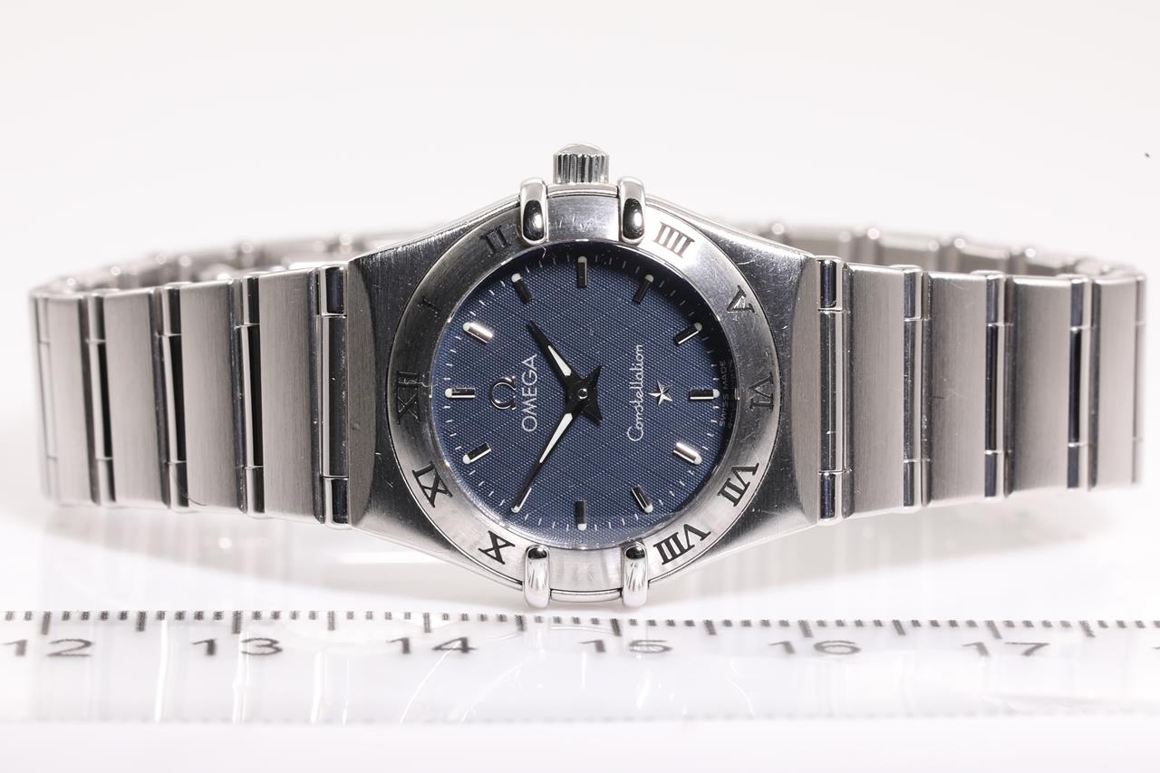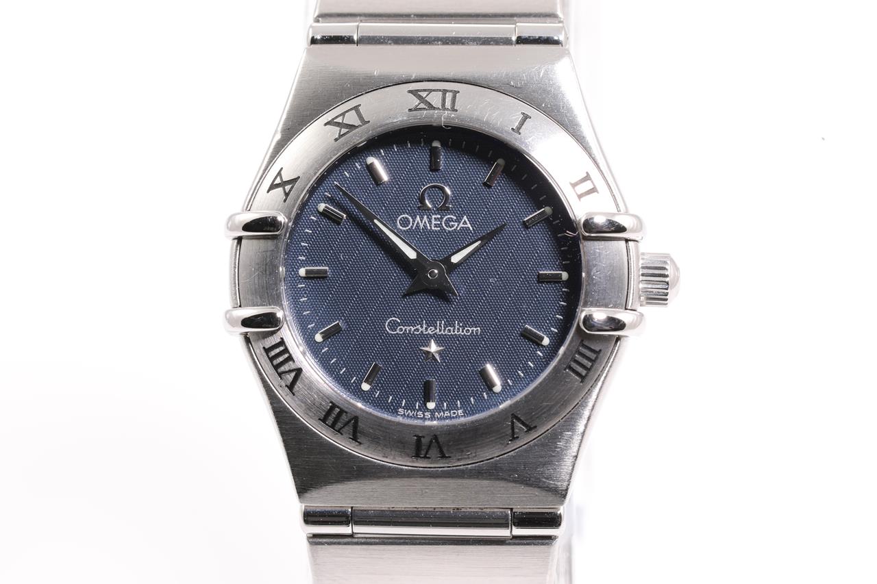 Omega Constellation stainless steel quartz ladies watch. Navy dial, case diameter: 22.5mm, wrist size:15cm, Swiss made. Ref# 1562.40. With Omega stainless steel bracelet and clasp. With certificate of authenticity. 3 month FSA warranty. (Pre-owned)
