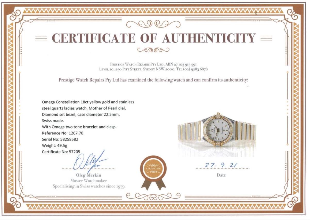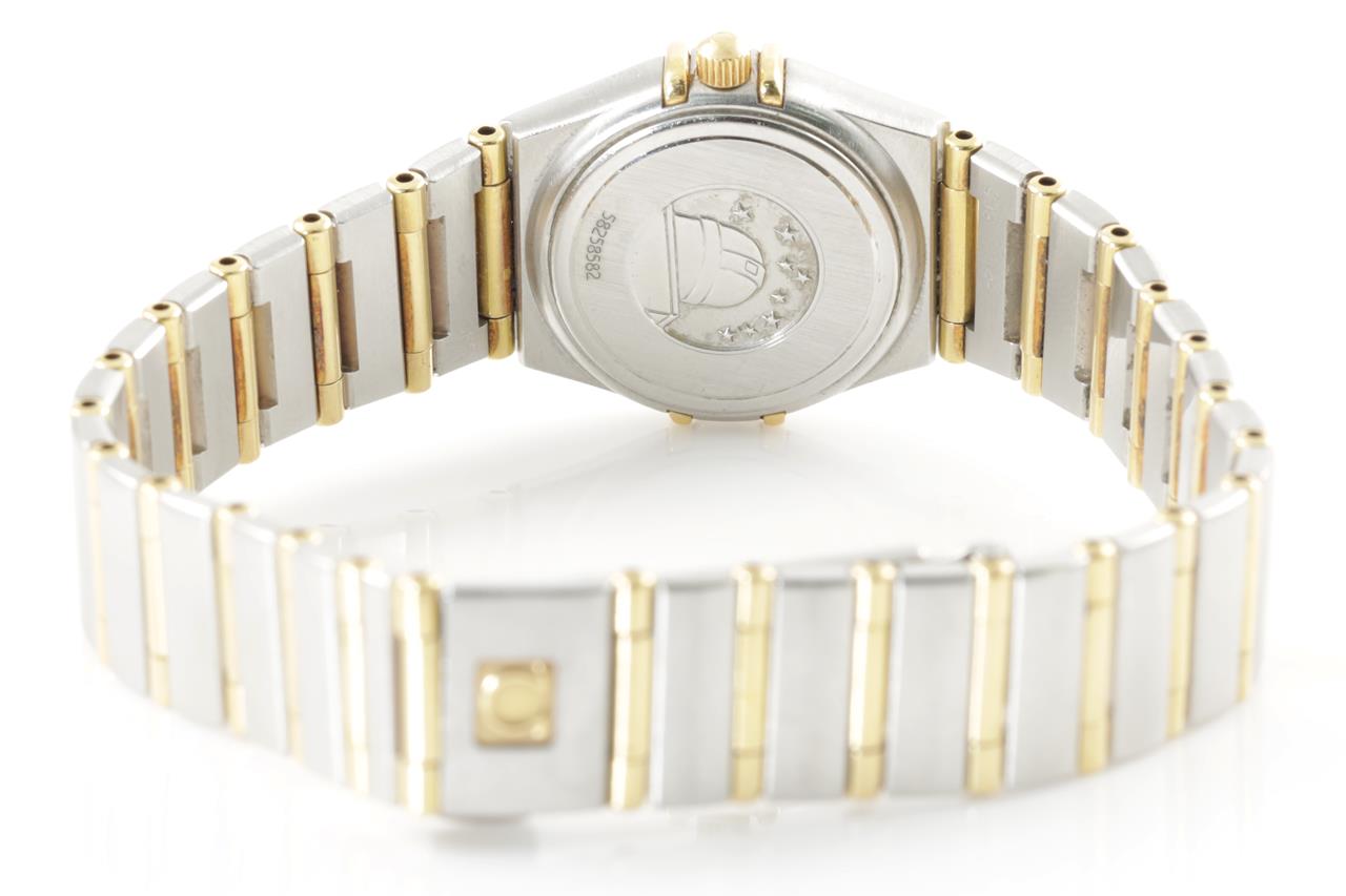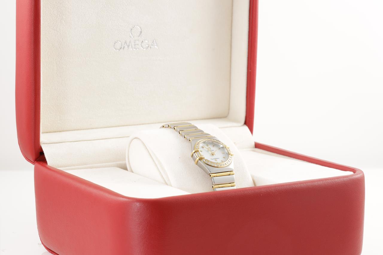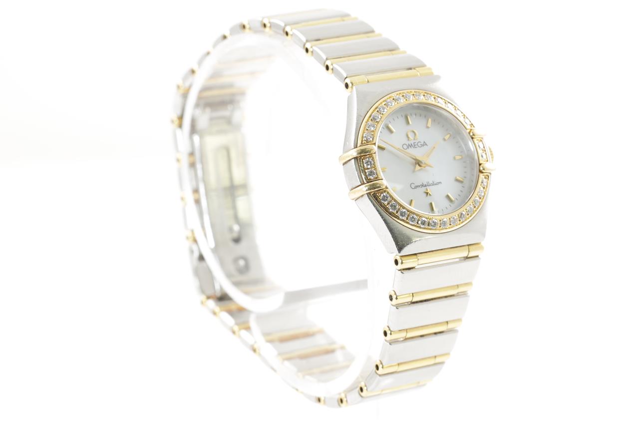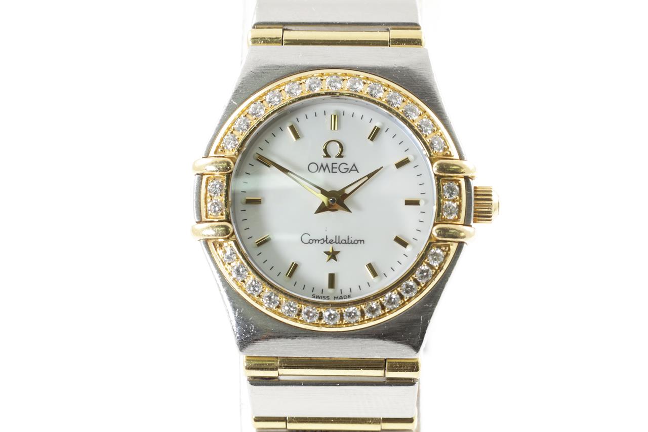 Omega Constellation 18ct yellow gold and stainless steel quartz ladies watch. Mother of Pearl dial, Diamond set bezel, case diameter 22.5mm, wrist size: 17cm, Swiss made. Ref# 1267.70. With Omega two tone bracelet and clasp. With certificate of authenticity and Omega box. 3 month FSA warranty. (Pre-owned)