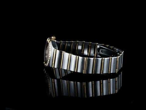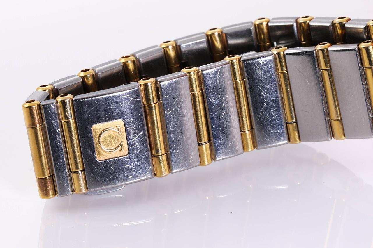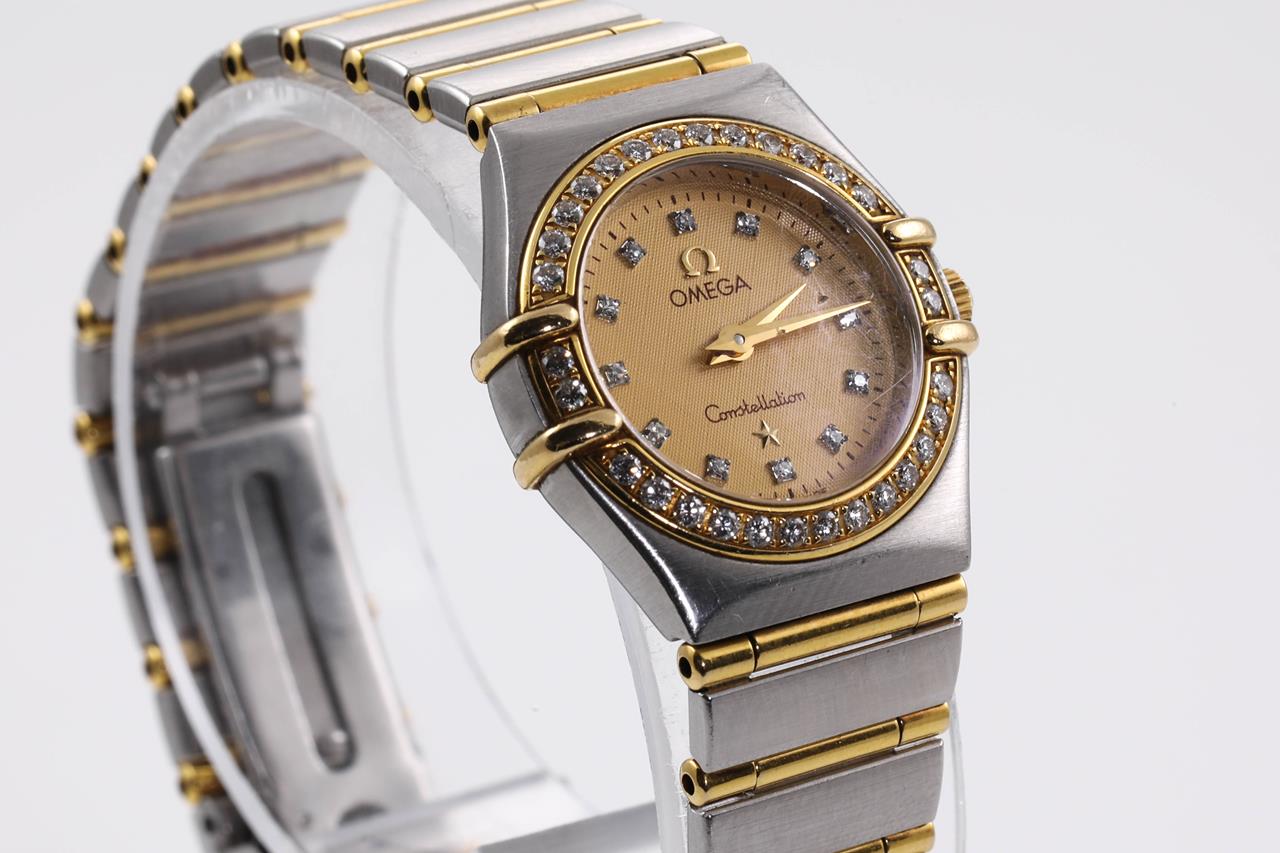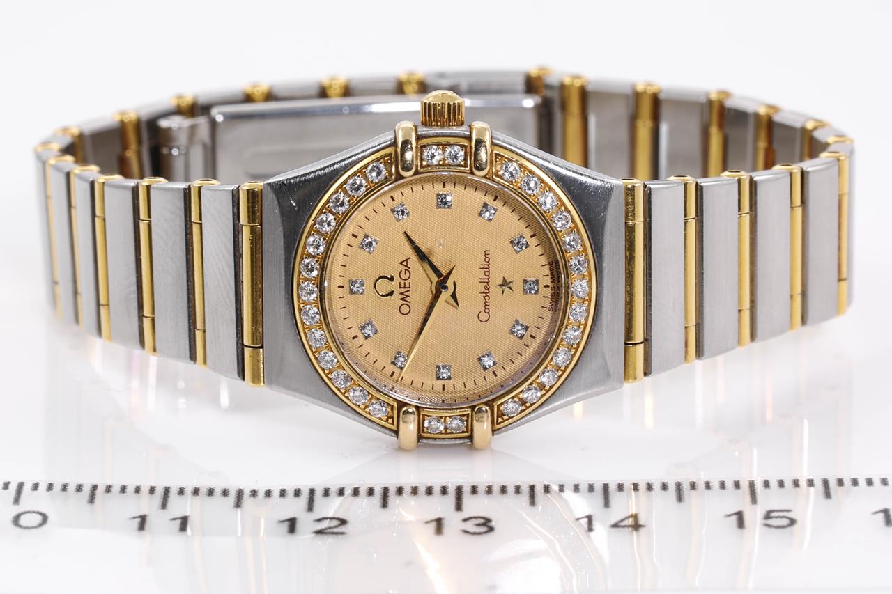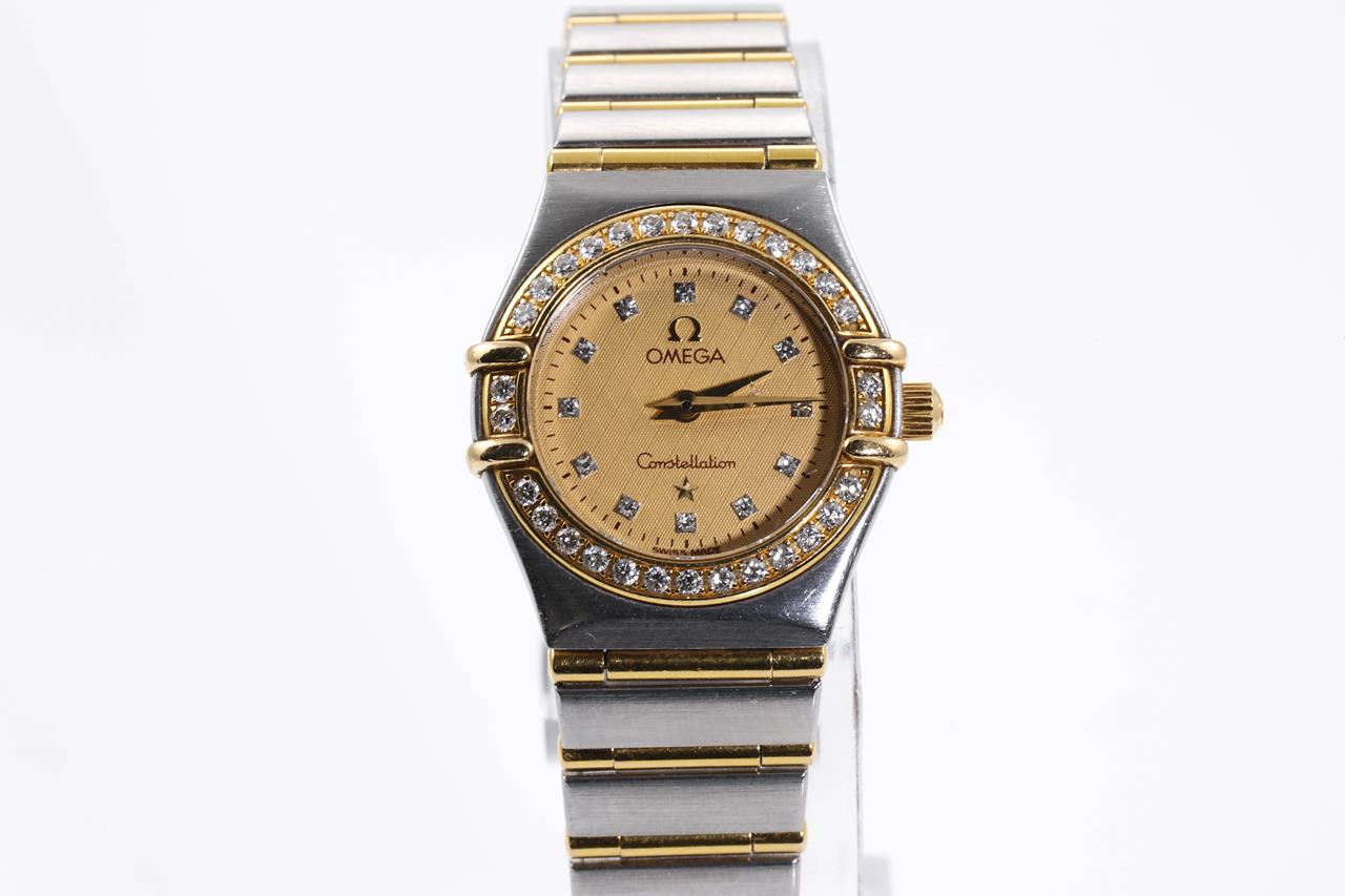 Omega Constellation 18ct yellow gold and stainless steel quartz ladies watch. Gold dial, Diamond set bezel, Diamond indicators, case diameter: 22mm, wrist size: 15.5cm, Swiss made. Ref# 6553/865. With Omega two tone bracelet and clasp. With certificate of authenticity. 3 month FSA warranty. (Pre-owned)