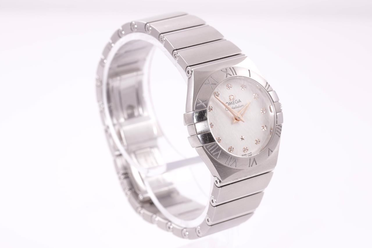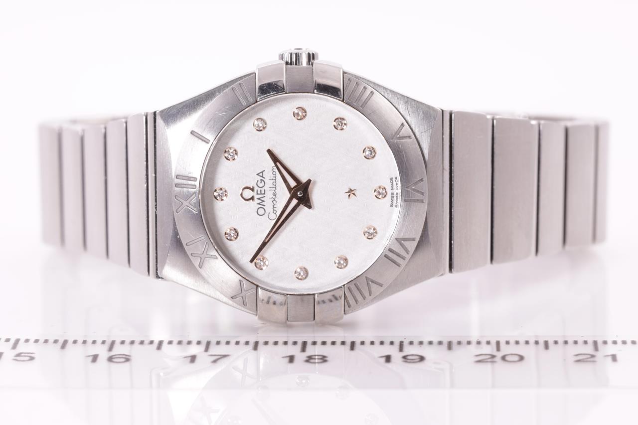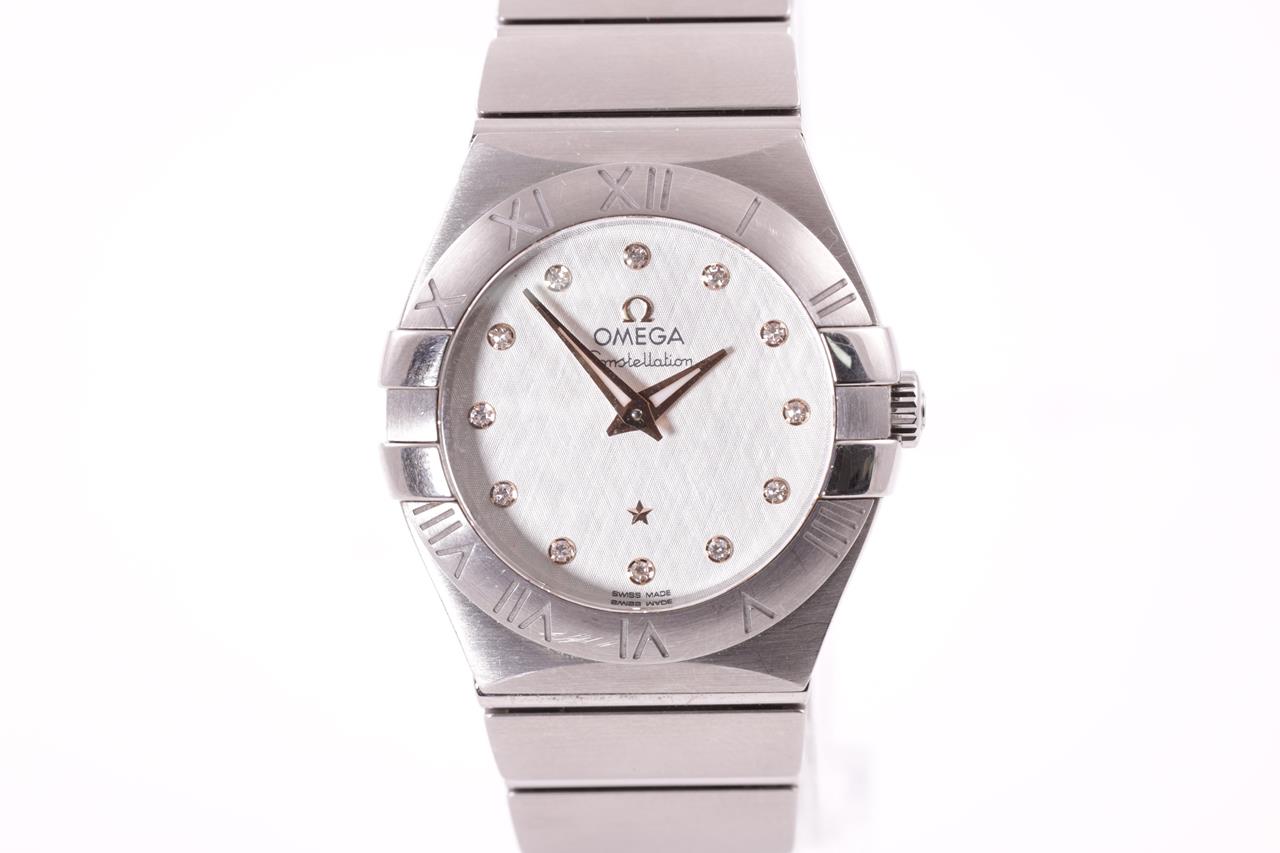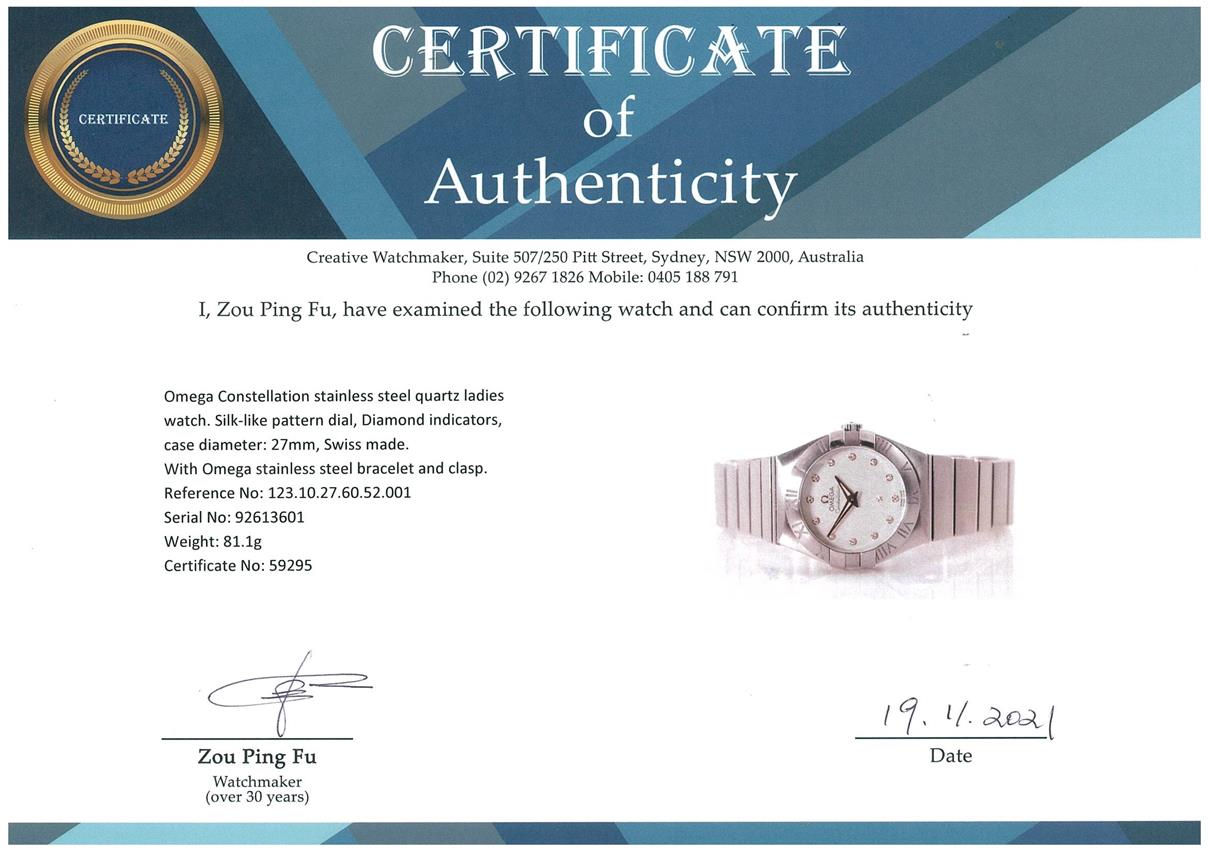 Omega Constellation stainless steel quartz ladies watch. Silk-like pattern dial, Diamond indicators, case diameter: 27mm, wrist size: 16cm, Swiss made. Ref# 123.10.27.60.52.001. With Omega stainless steel bracelet and clasp. With certificate of authenticity, Omega International warranty card dated 9/1/2017, precious stone certificate card and Omega box. 3 month FSA warranty. (Pre-owned)